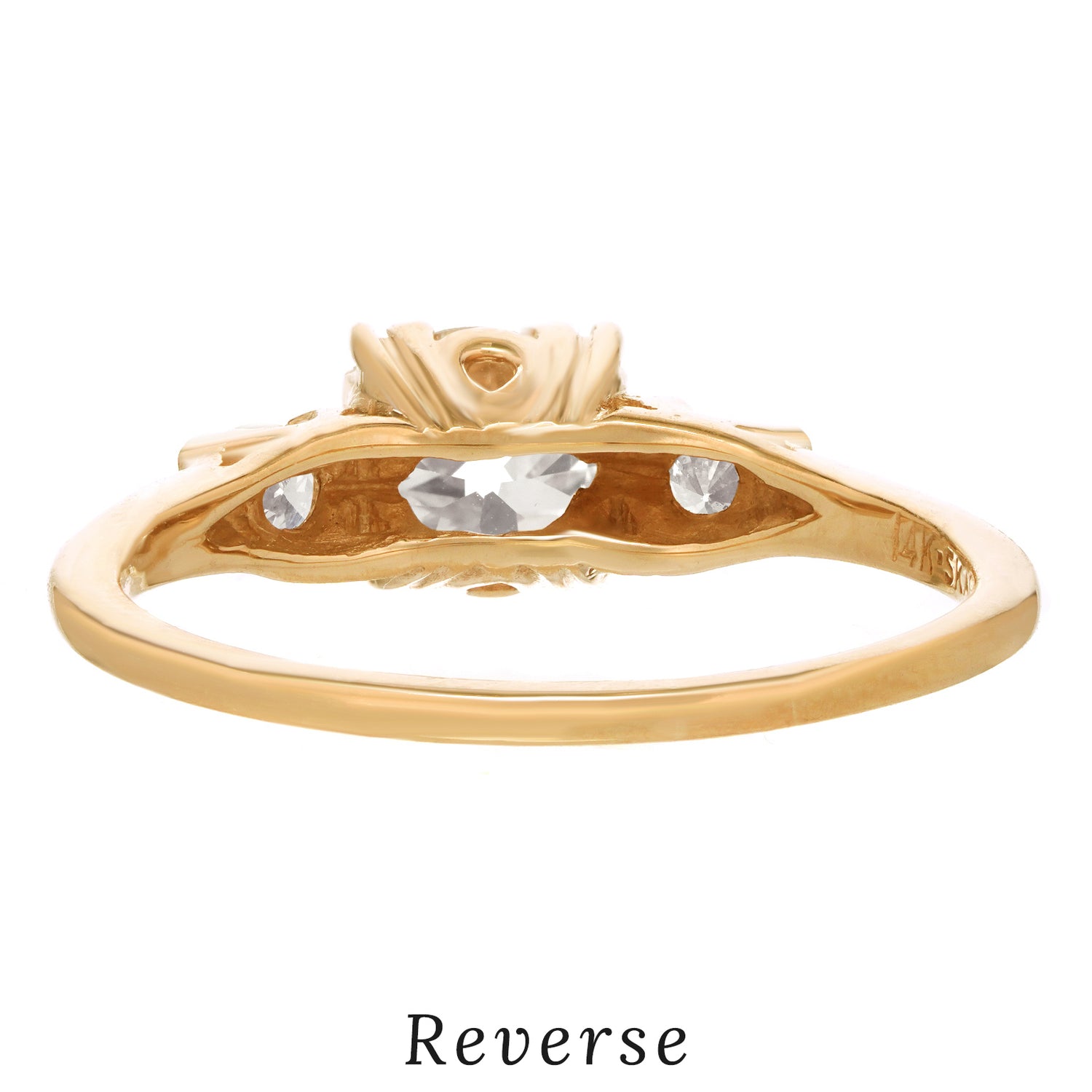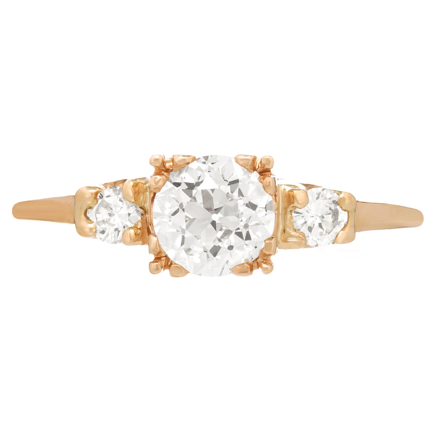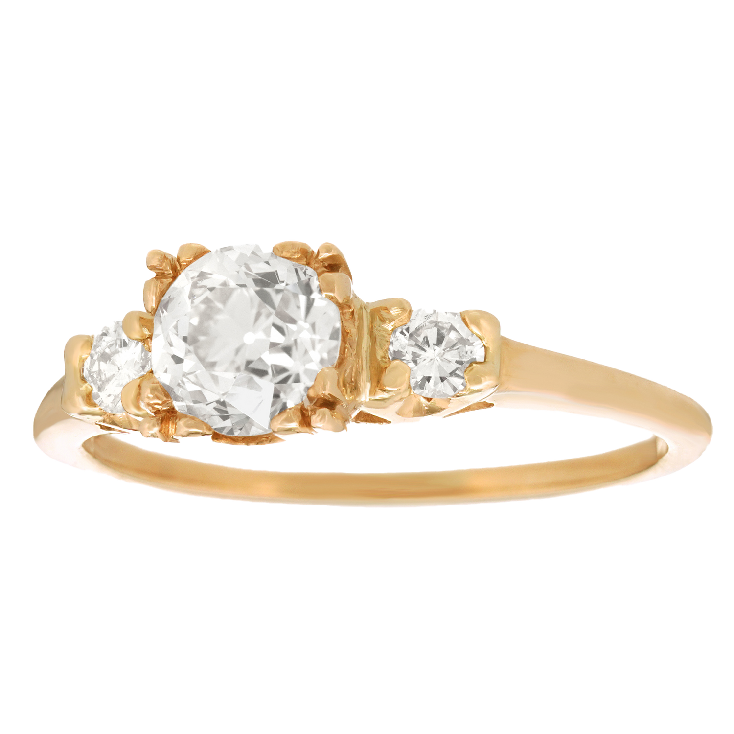 Circa 1940s, 14k, American. This stylish American engagement ring features a .88-carat diamond (I color, SI2 clarity) and is accented by two side stones. Replete with subtle notes of Art Deco, the retro forties look is unique, elegant, and modern. Quality construction completes the picture. Excellent condition.