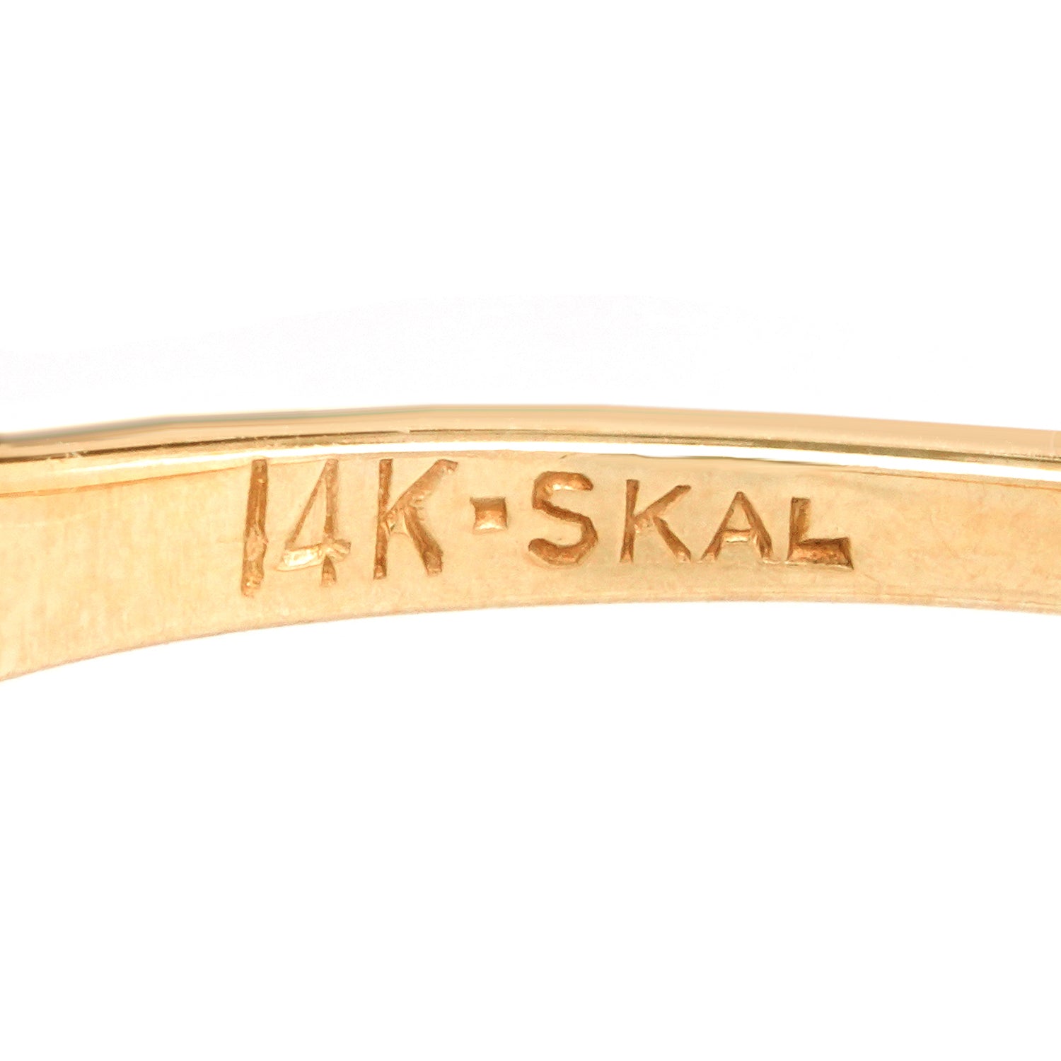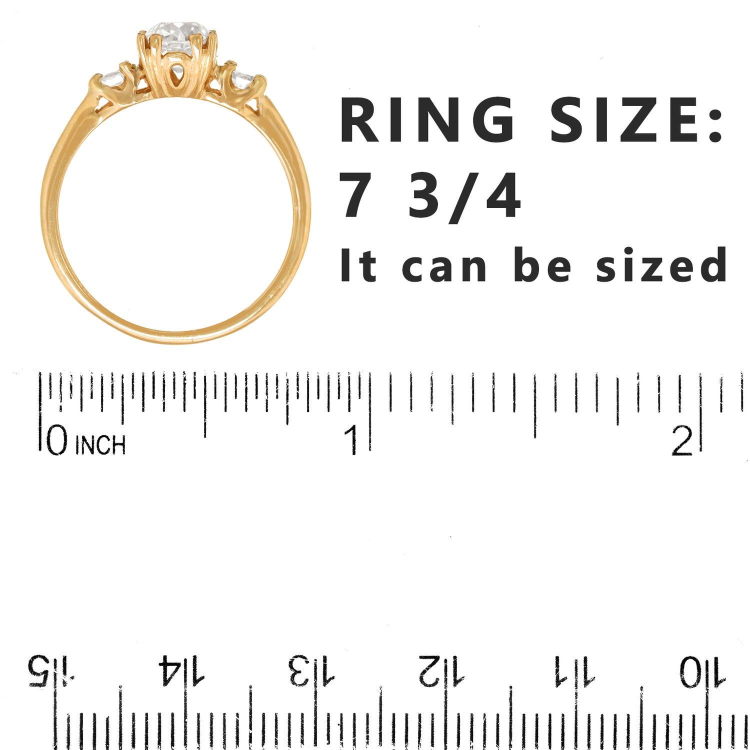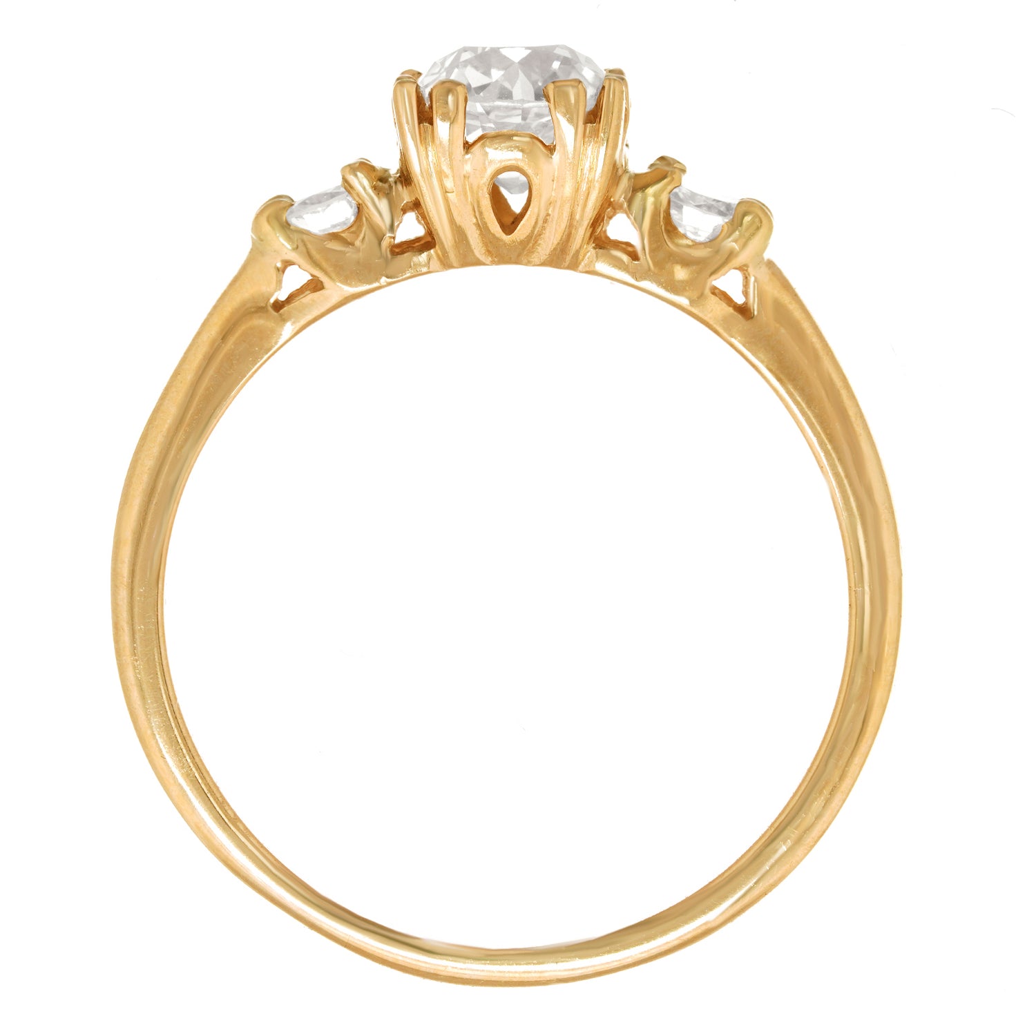 Circa 1940s, 14k, American. This stylish American engagement ring features a .88-carat diamond (I color, SI2 clarity) and is accented by two side stones. Replete with subtle notes of Art Deco, the retro forties look is unique, elegant, and modern. Quality construction completes the picture. Excellent condition.