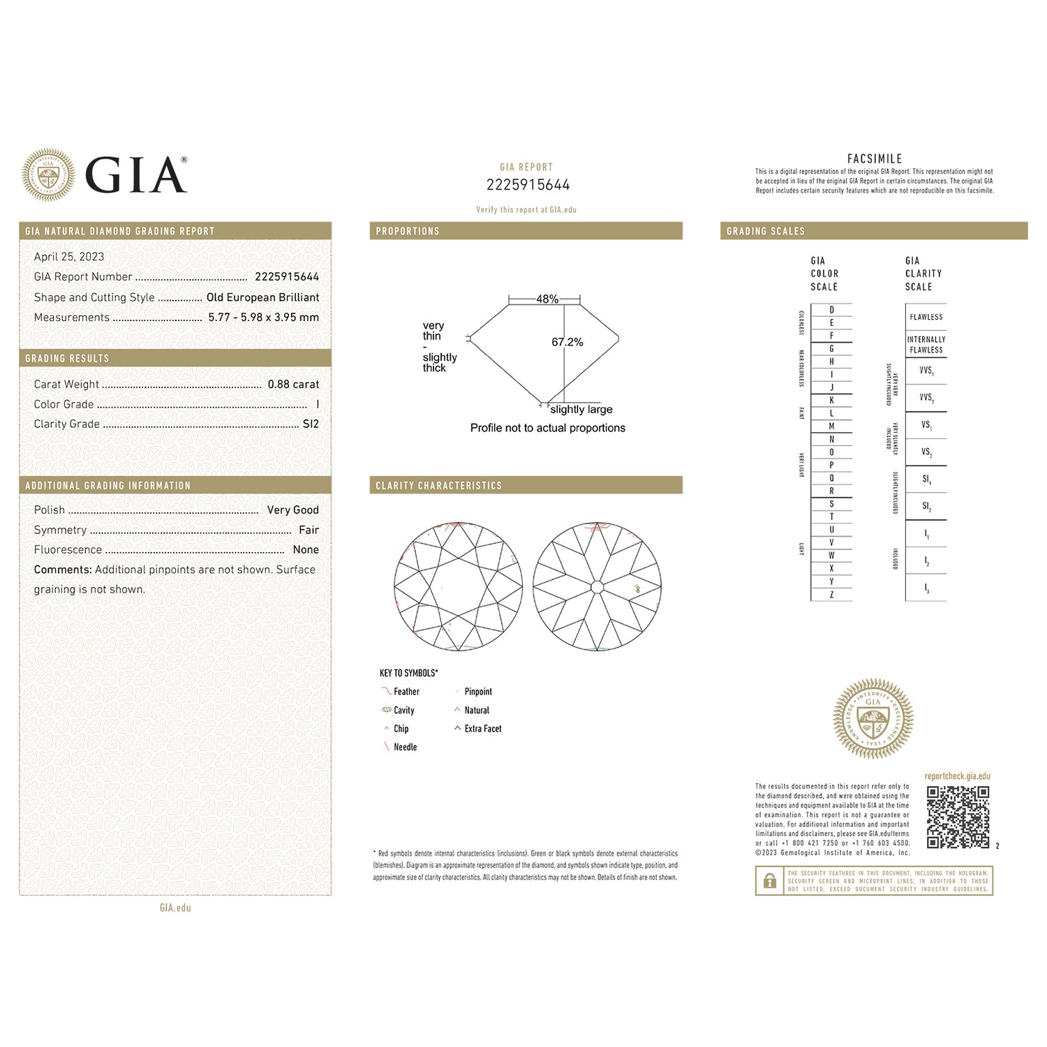 Stones: .88 carat I color, SI2 clarity diamond and .16 carats additional G color, VS clarity accent diamonds