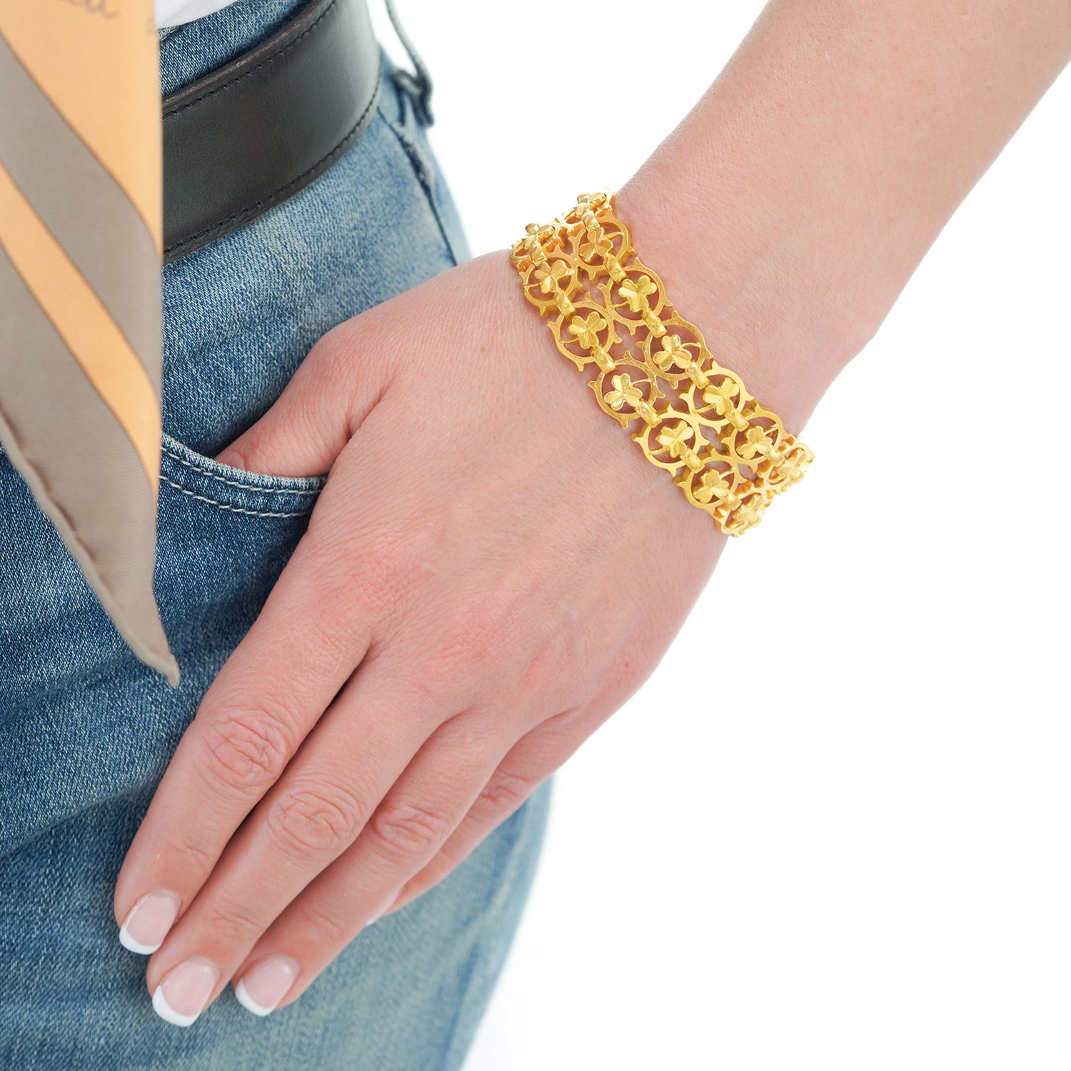 Circa 1920s, 18k, France.  This charming everyday Art Deco bracelet has a cultivated Parisian style that is effortlessly tailored. Whimsical clover motifs sit at the center of a golden grillwork that also includes Alhambra-like quatrefoils. A superlative example of French Art Deco design and workmanship, this 18k French bracelet is in excellent condition.