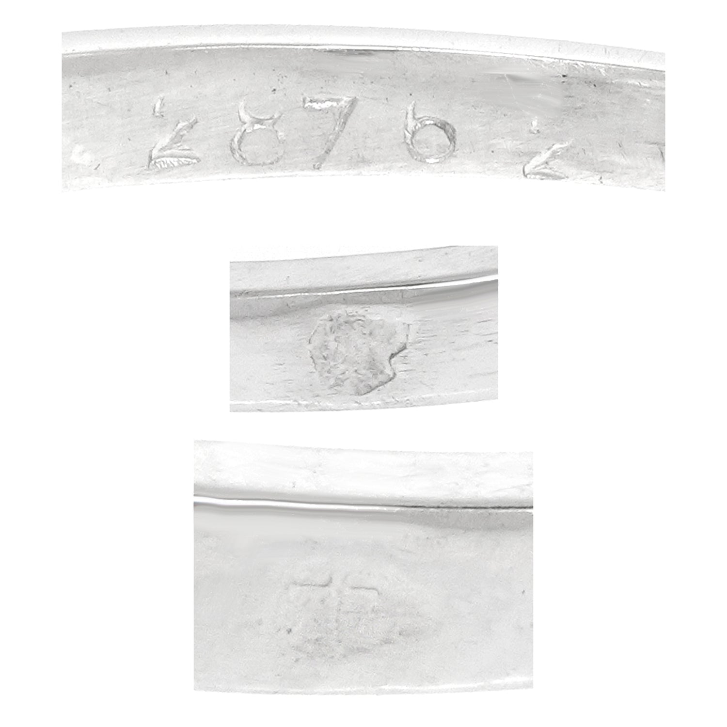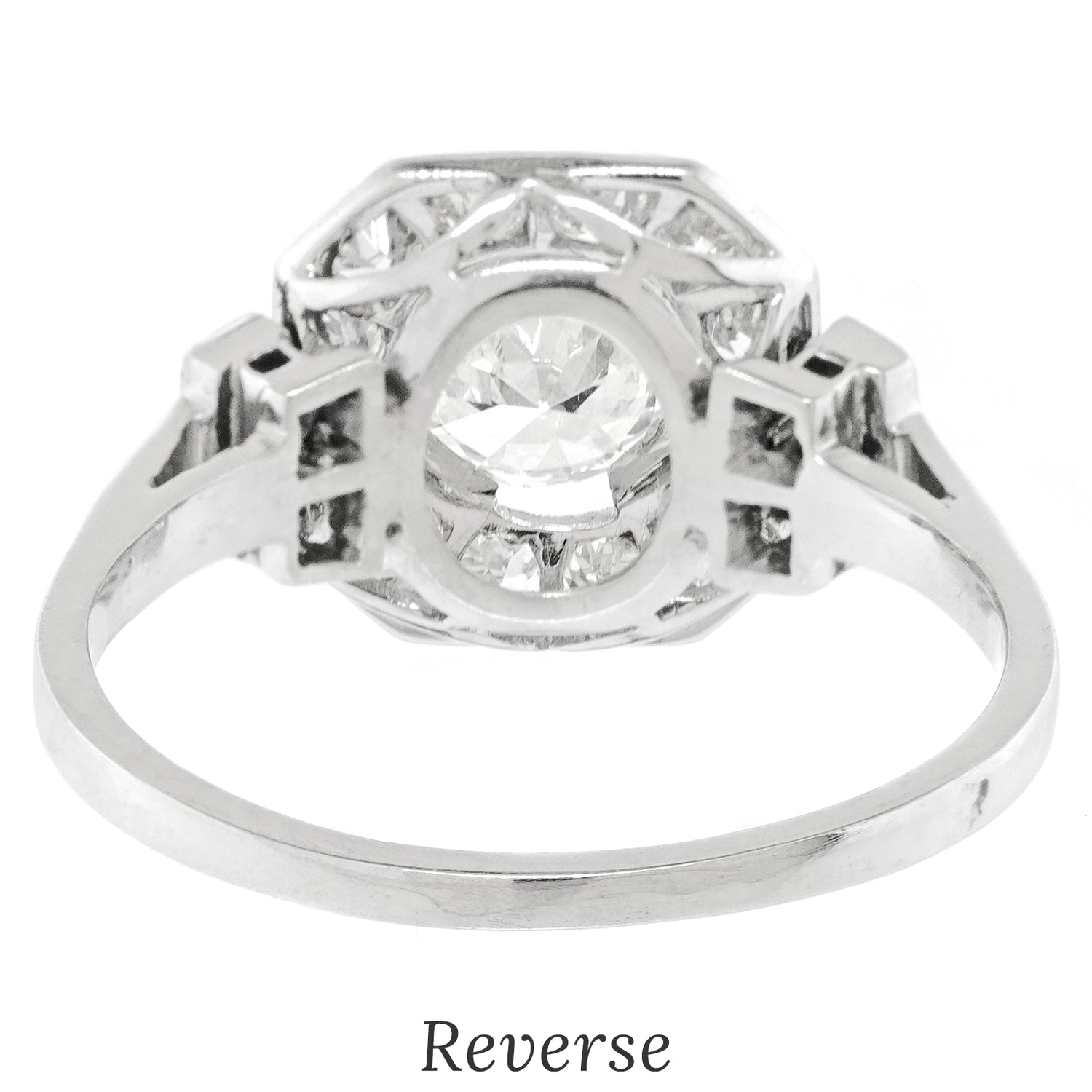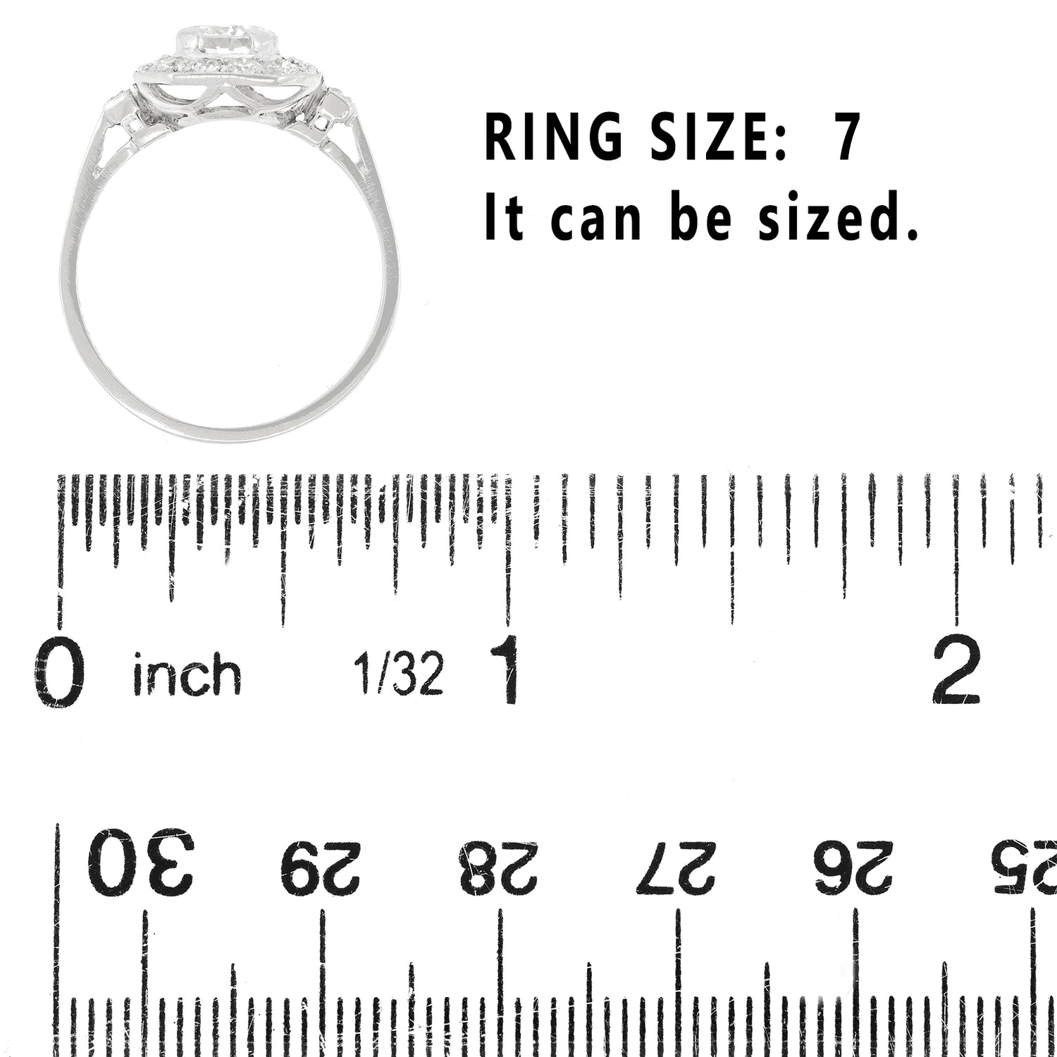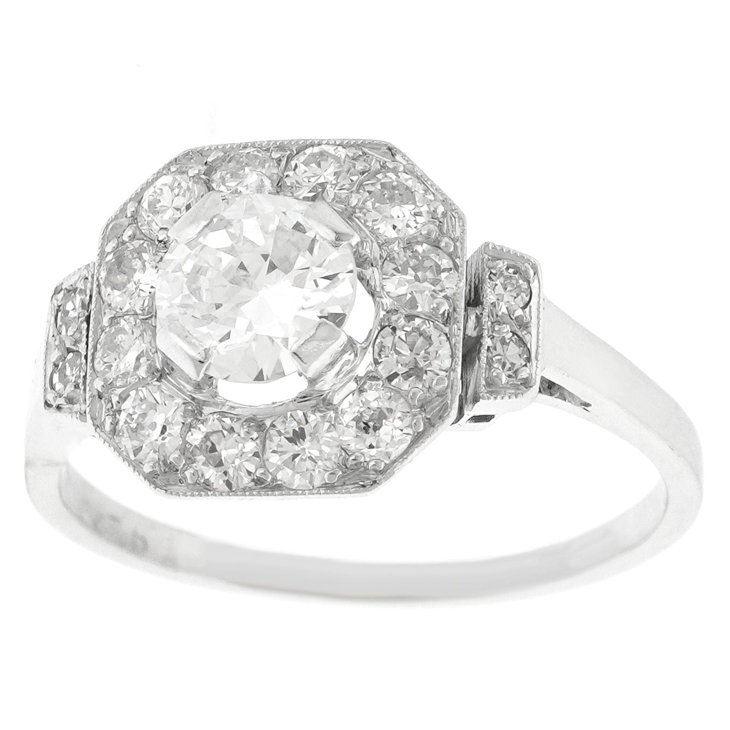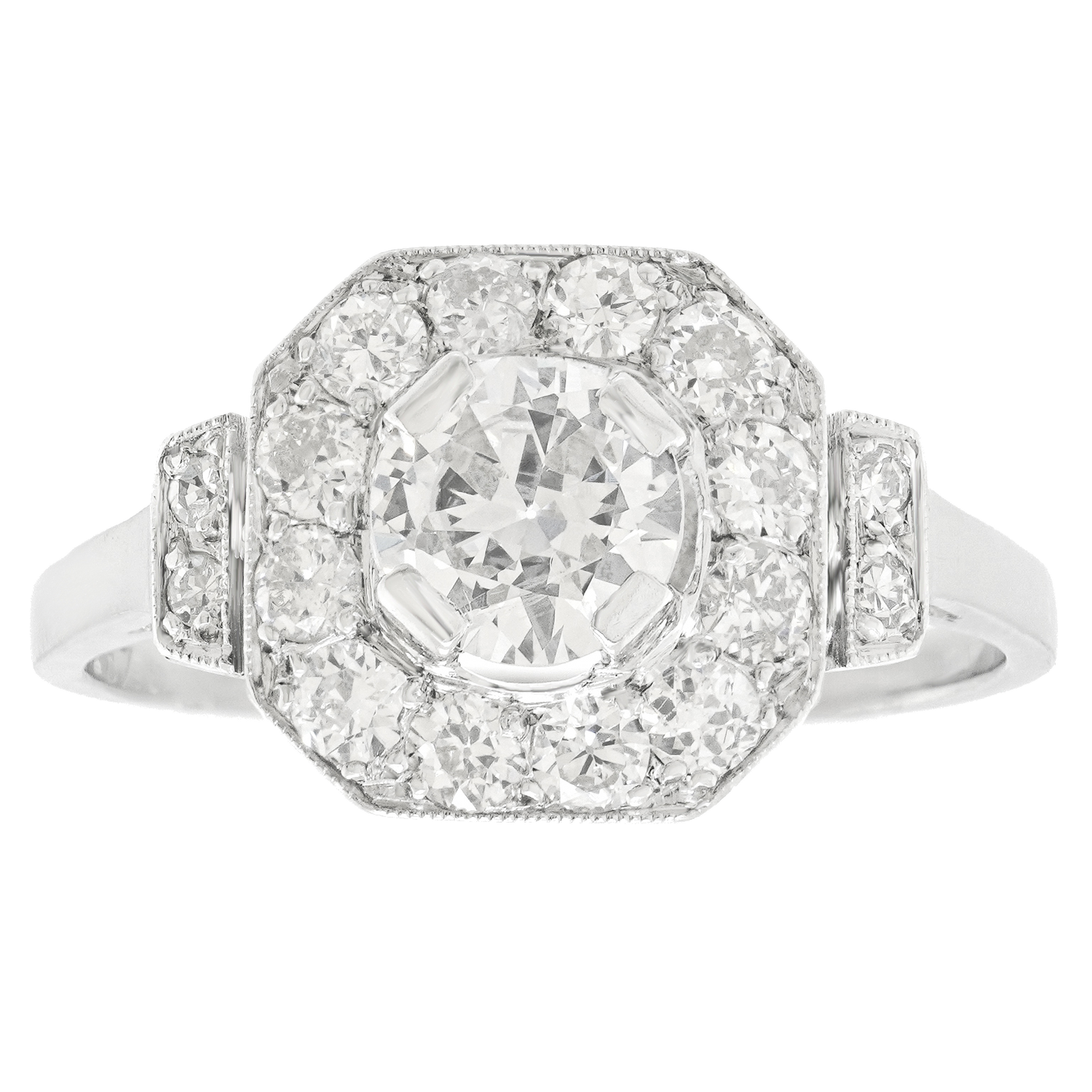 Circa 1920s, Platinum, France. Delightfully French, and spectacularly Art Deco, this charming octagonal ring has a sophisticated geometric motif. Impeccable as an every day or engagement ring, its fine white .75-carat diamond (H color, SI1 clarity) is surrounded by .79 carats of additional stones set in platinum. Beautifully made, it is in excellent condition.