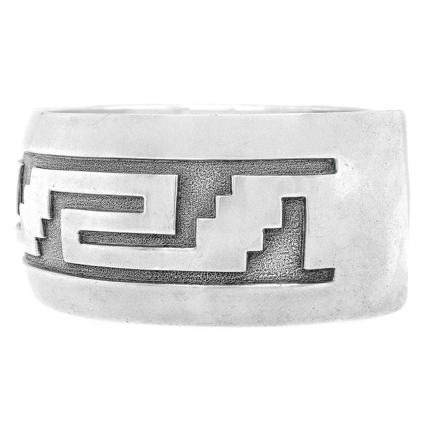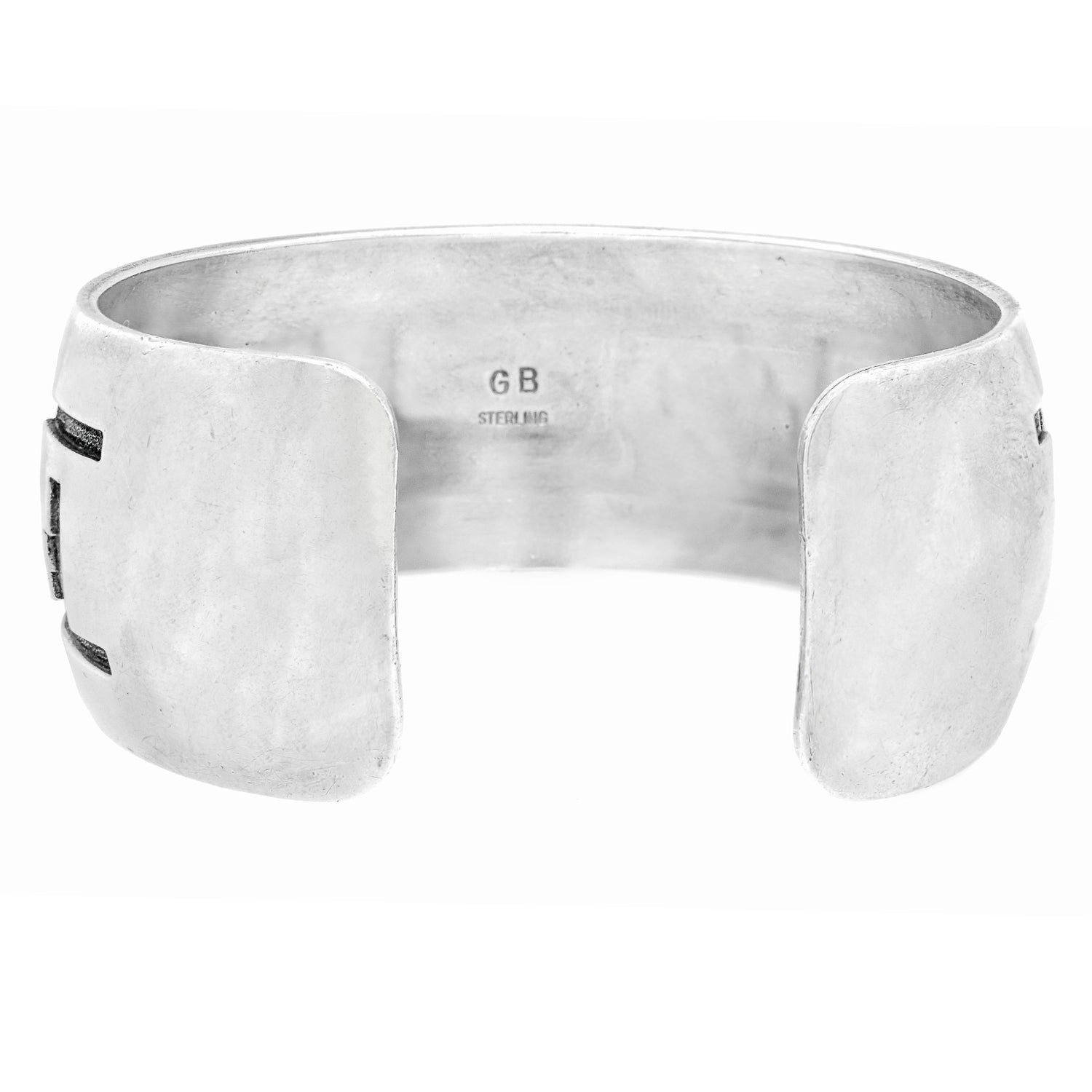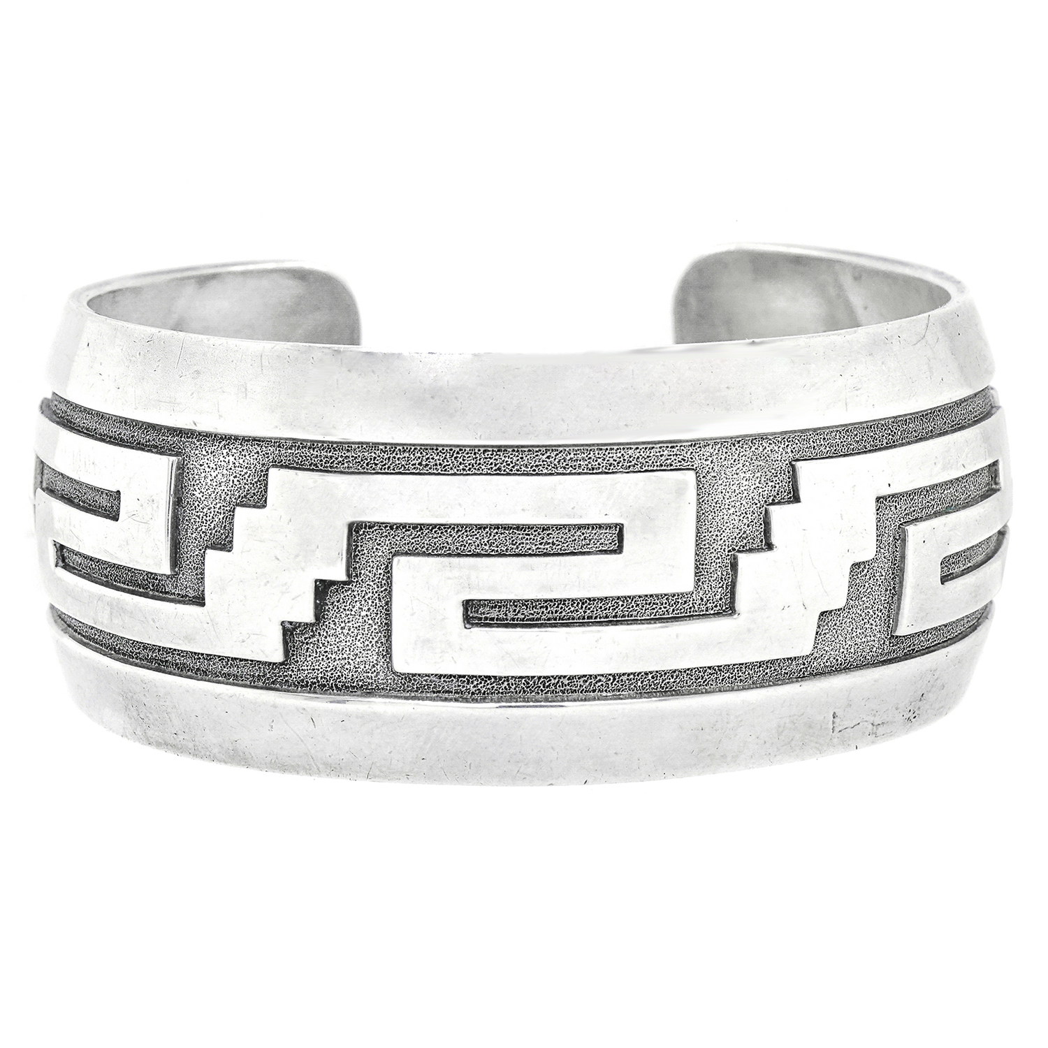 Circa 1990s, Sterling, by George Begay, American. Mixing a traditional motif with a modern form this substantial sterling cuff bracelet is Navajo chic at its elegantly understated best. Handmade using traditional techniques by George Begay. Excellent condition.
