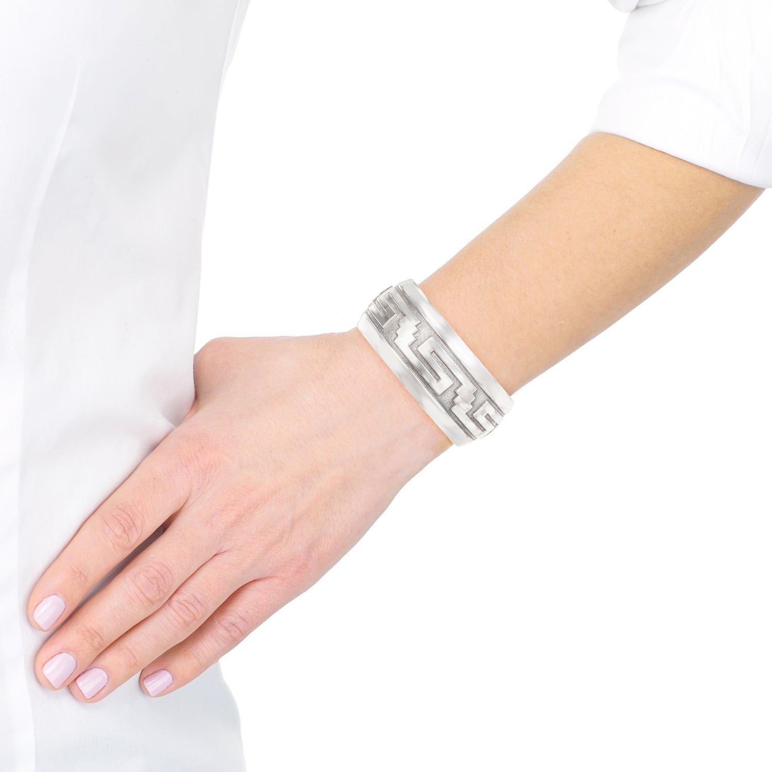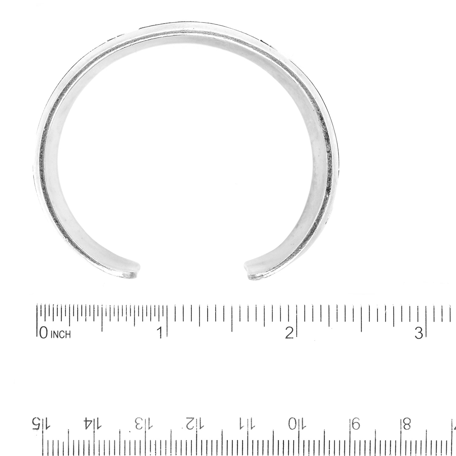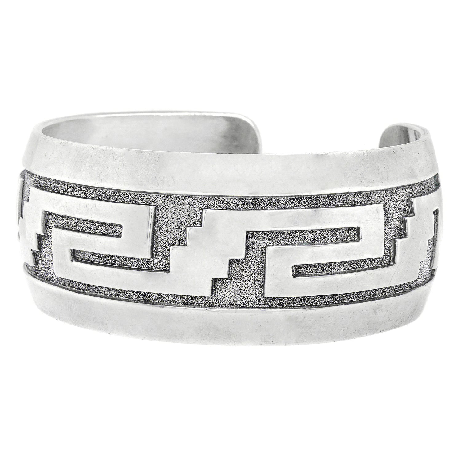 Circa 1990s, Sterling, by George Begay, American. Mixing a traditional motif with a modern form this substantial sterling cuff bracelet is Navajo chic at its elegantly understated best. Handmade using traditional techniques by George Begay. Excellent condition.