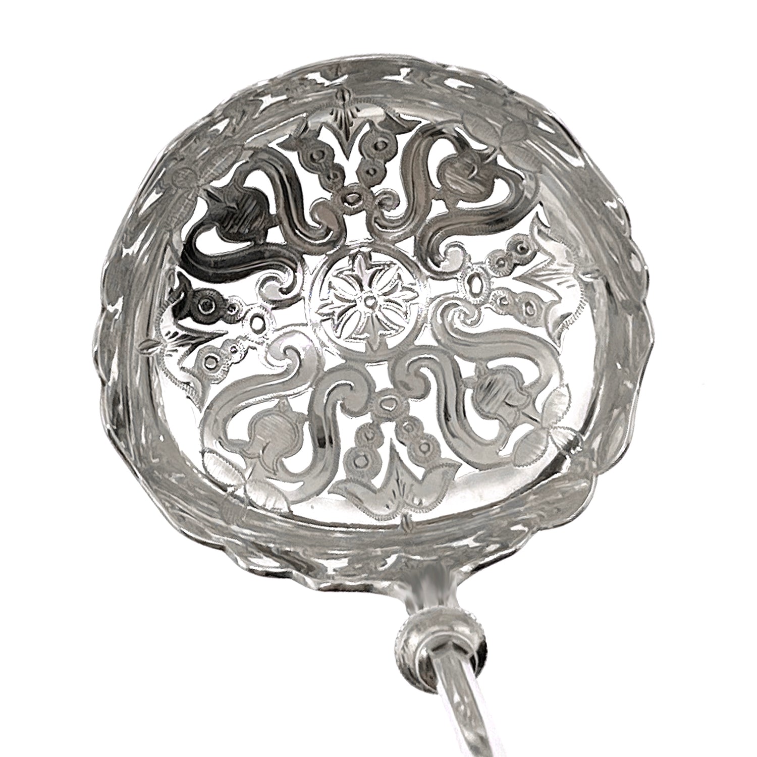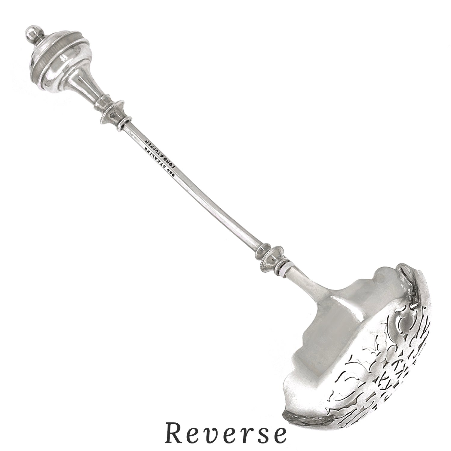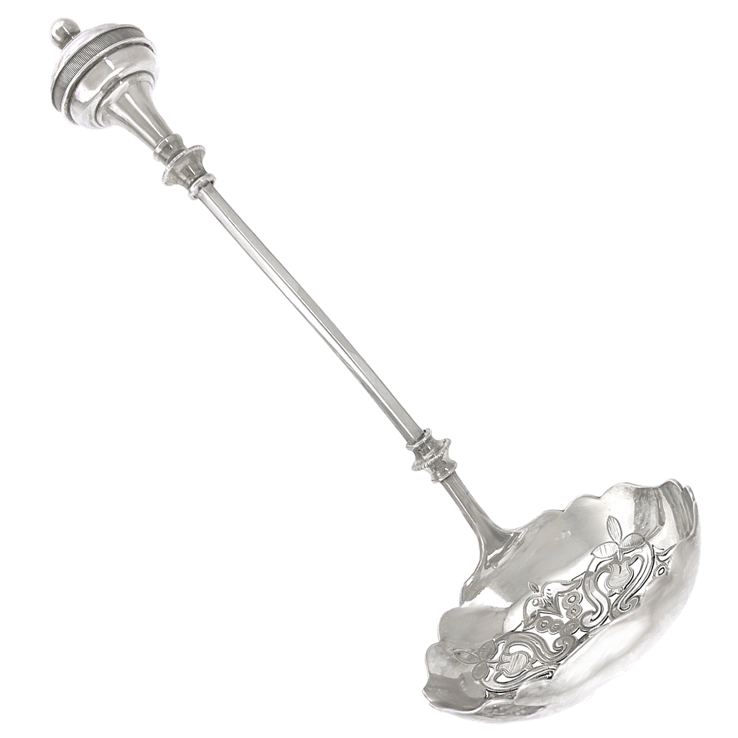 Circa 1870s, Sterling, by George Sharp, retailed by Ford & Tupper. This is a lovely George Sharp design ladle with pierced scrollwork in the bowl. Superb condition.