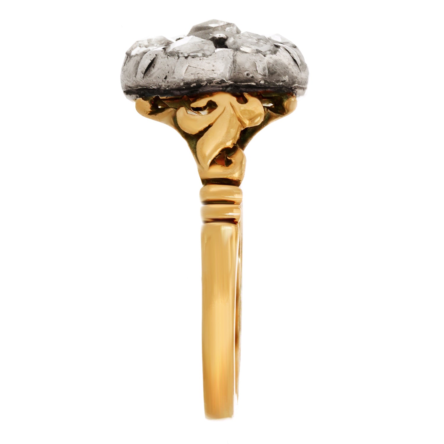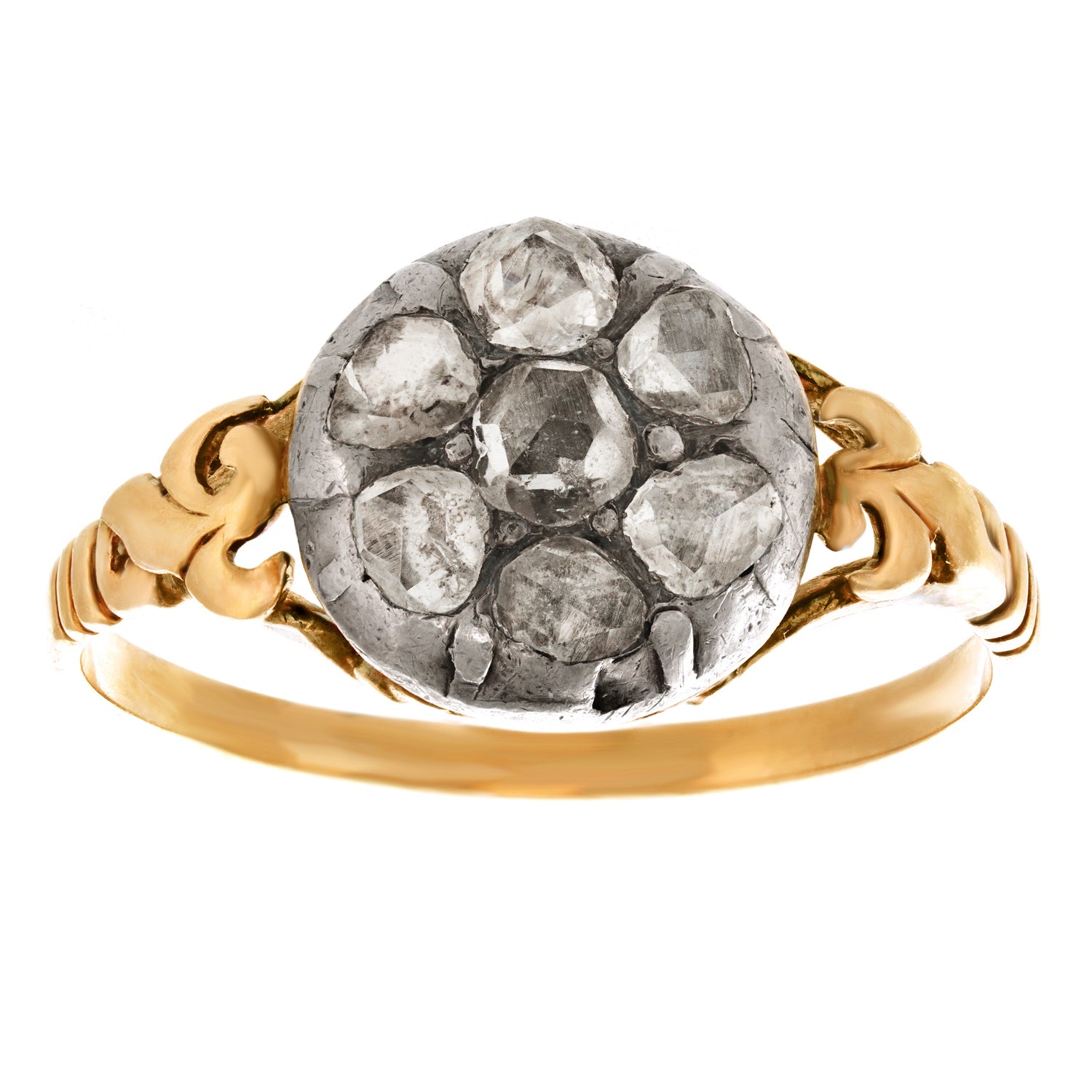 Circa 1820s, 14k and Silver. This evocative example of Georgian-era jewelry is set with .75 carats of diamonds in a classic fleurette motif that remains fashionably relevant two centuries later. Its romantic scrolling gold work and engraved detail are masterfully done by hand, giving it a visual authenticity that is matchless. Excellent condition.