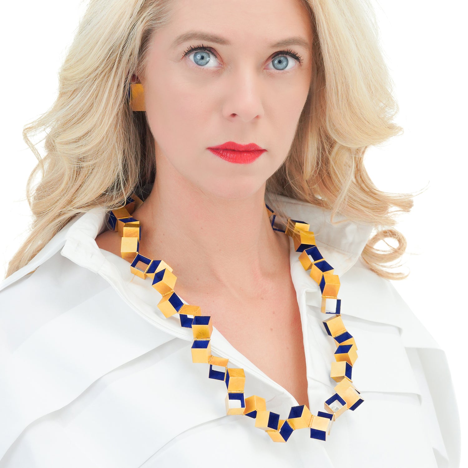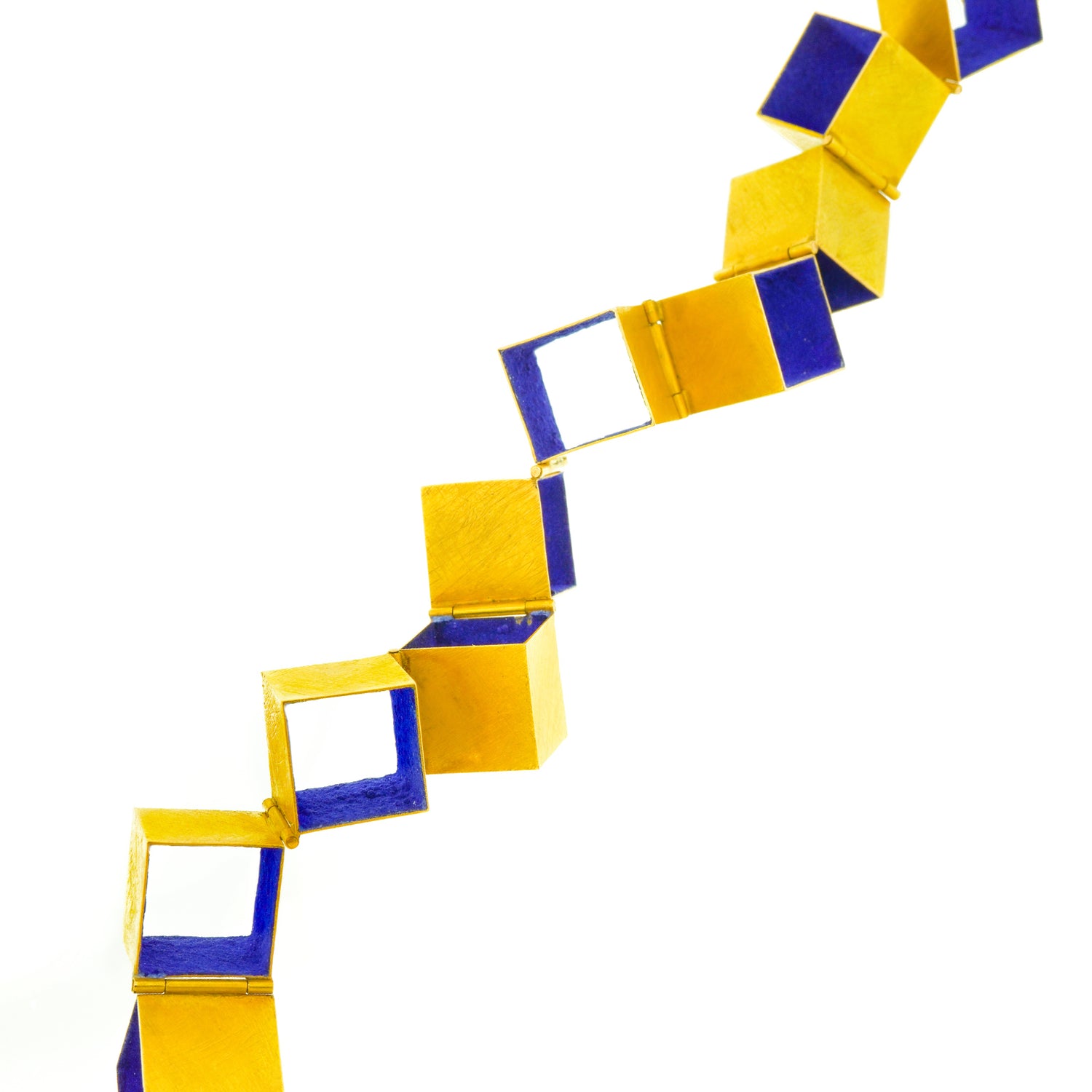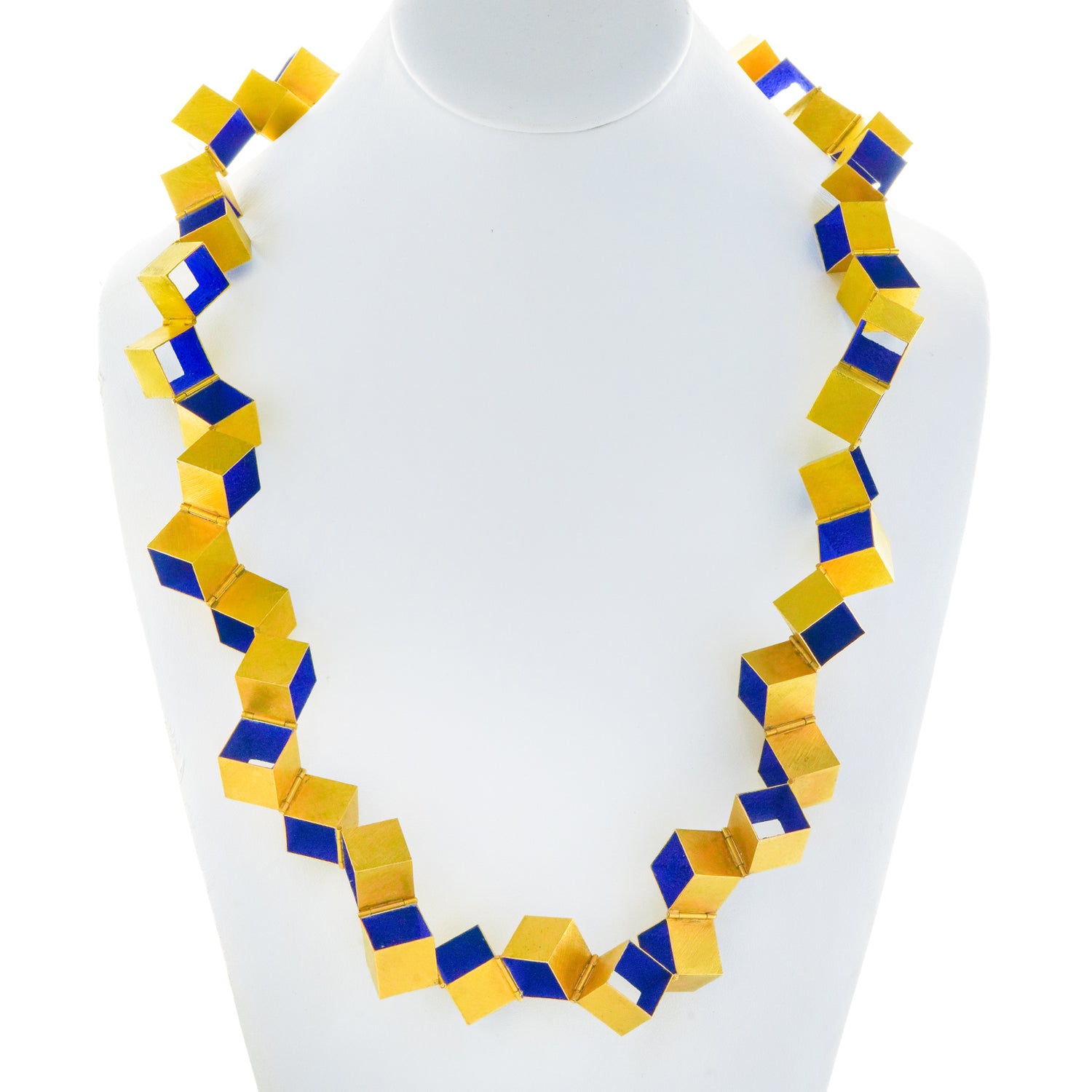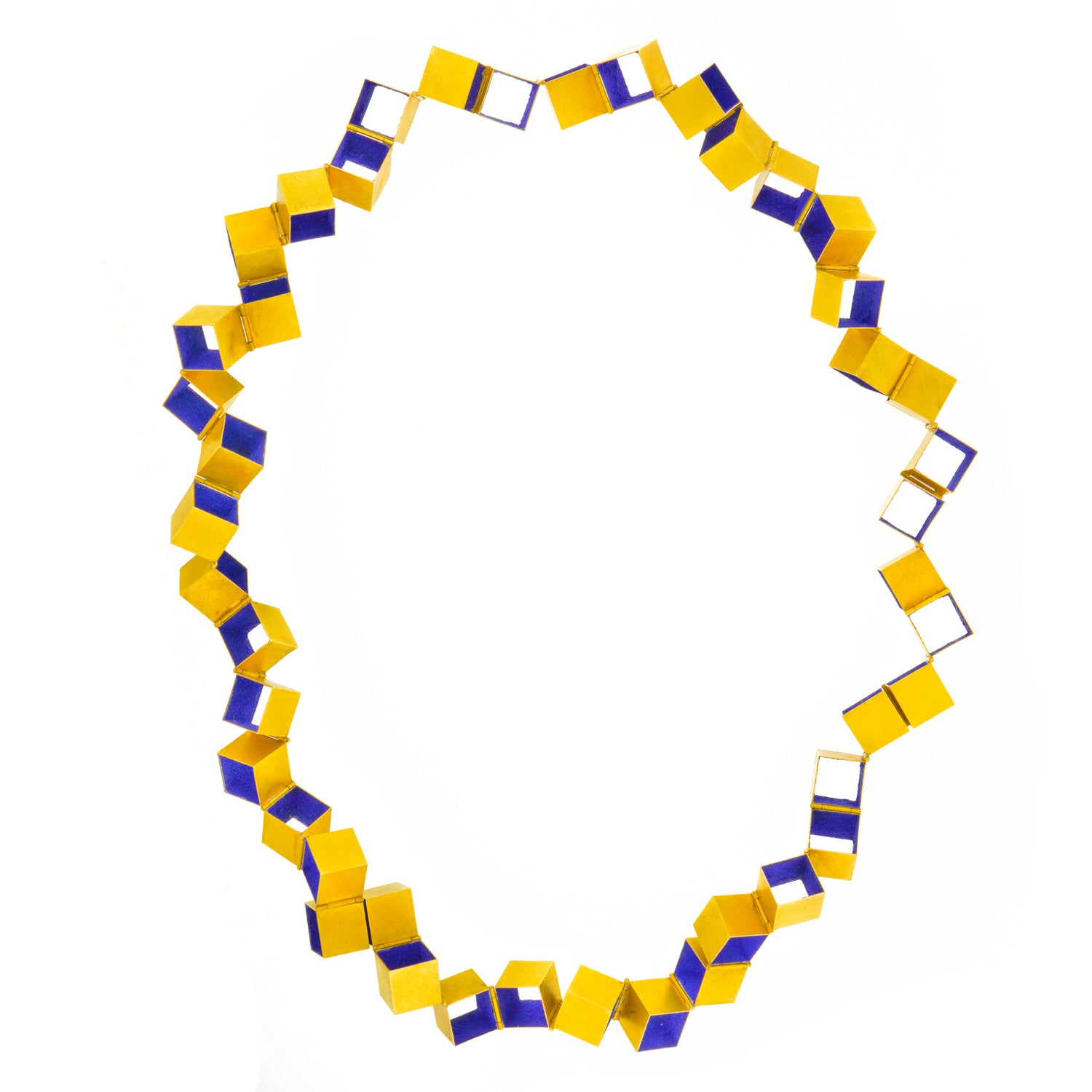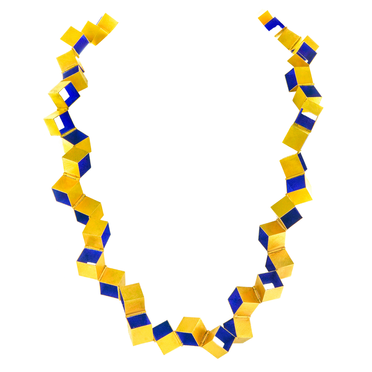 Circa 1990s, 18k, by Giampaolo Babetto, Italy. Architect turned sculptor, turned goldsmith, Giampaolo Babetto's jewelry is visually compelling. Combining minimalist forms with idiosyncratic detail, this necklace is a visual narrative of abstract movement, textured surfaces and cubist homage. An unusually colorful work, the bright blue is a secret process involving roughly crushed lapis lazuli, the key component in the historically purest blue pigments. This blue touchstone ties the artistic history of Italian painters to the cubist modernity of this brilliant sculpture to go. From the sidewalk to the catwalk, this necklace is signature style.  Excellent condition.