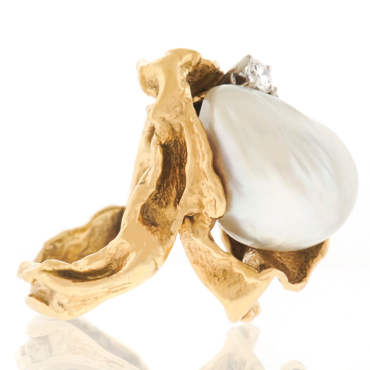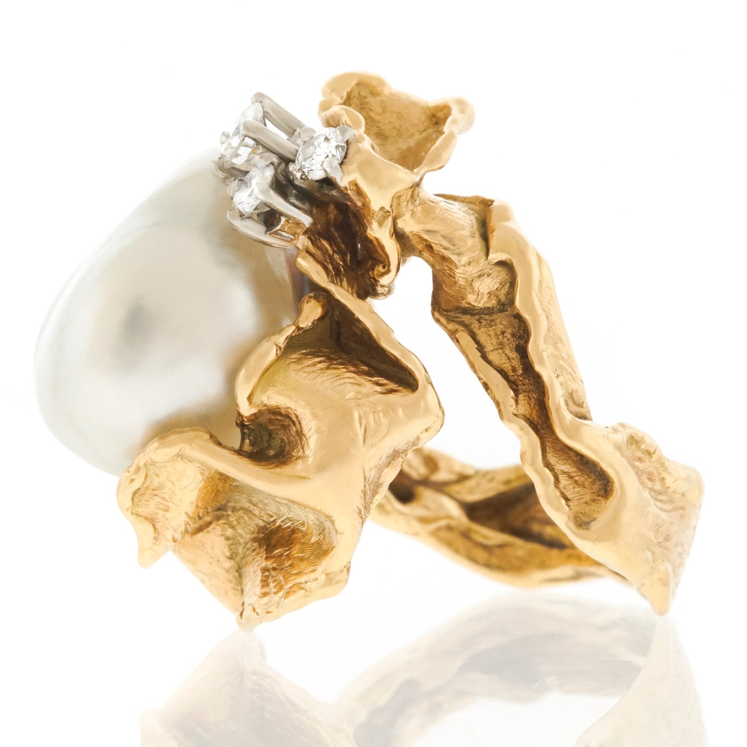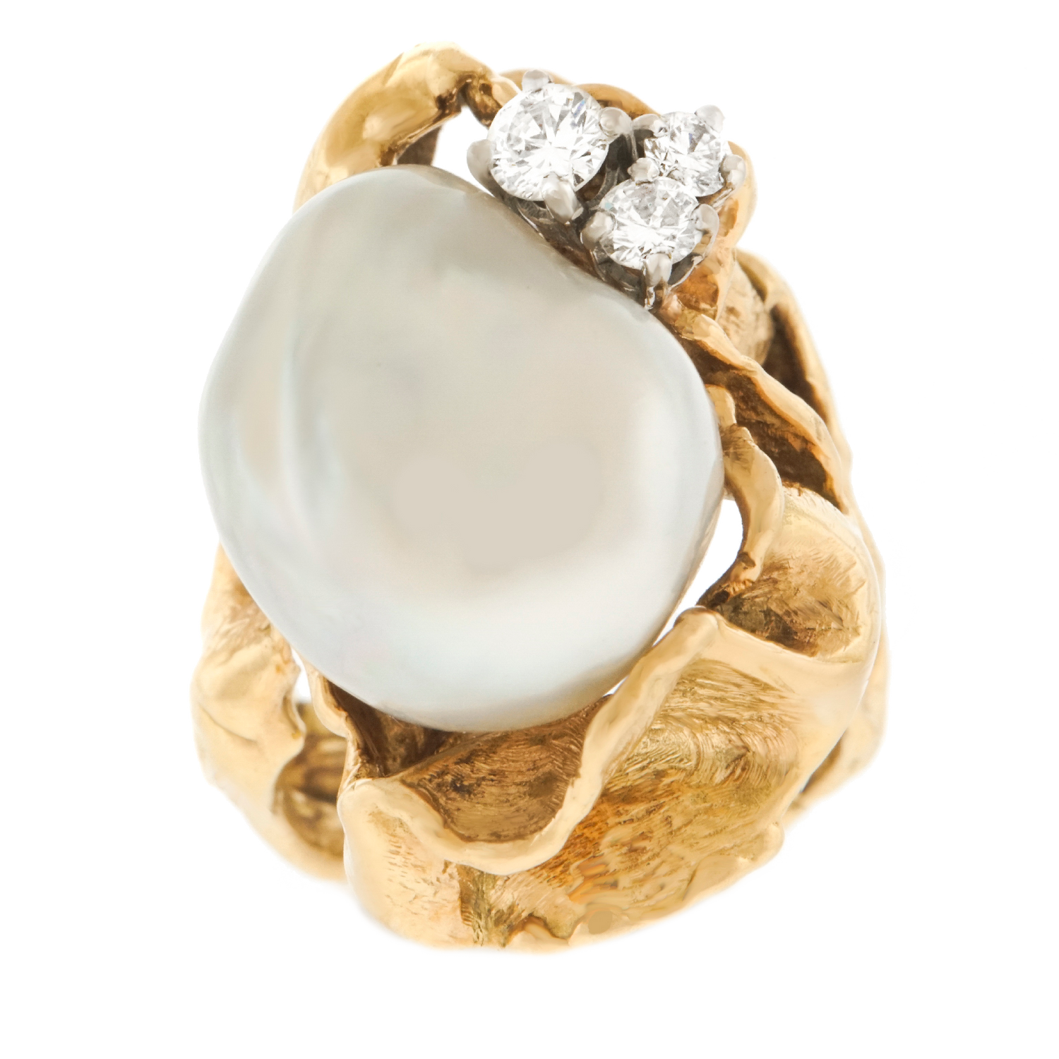 Circa 19970s, 18k, Gilbert Albert, Genève, Switzerland.   From the catwalk at Fashion Week to the Art museum Gala, Gilbert Albert's work sets the style for any moment of fashion. This 18k gold ring is a miniature abstract sculpture set with diamonds and a large pearl. Gilbert Albert has been a major influence in Art jewelry since the 1950s; his work is included in important public and private collections.  This ring is superbly fabricated and in excellent condition.