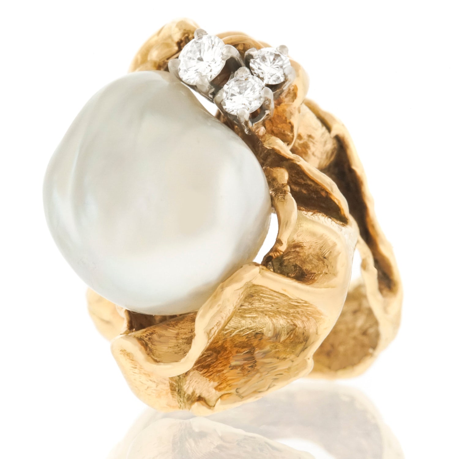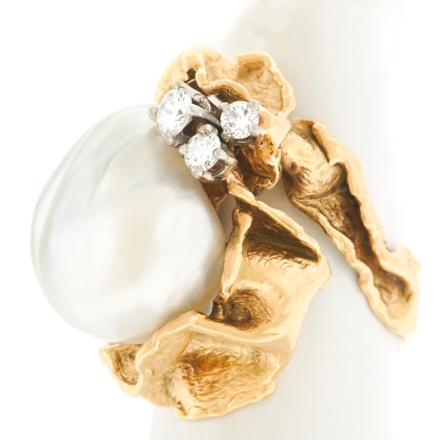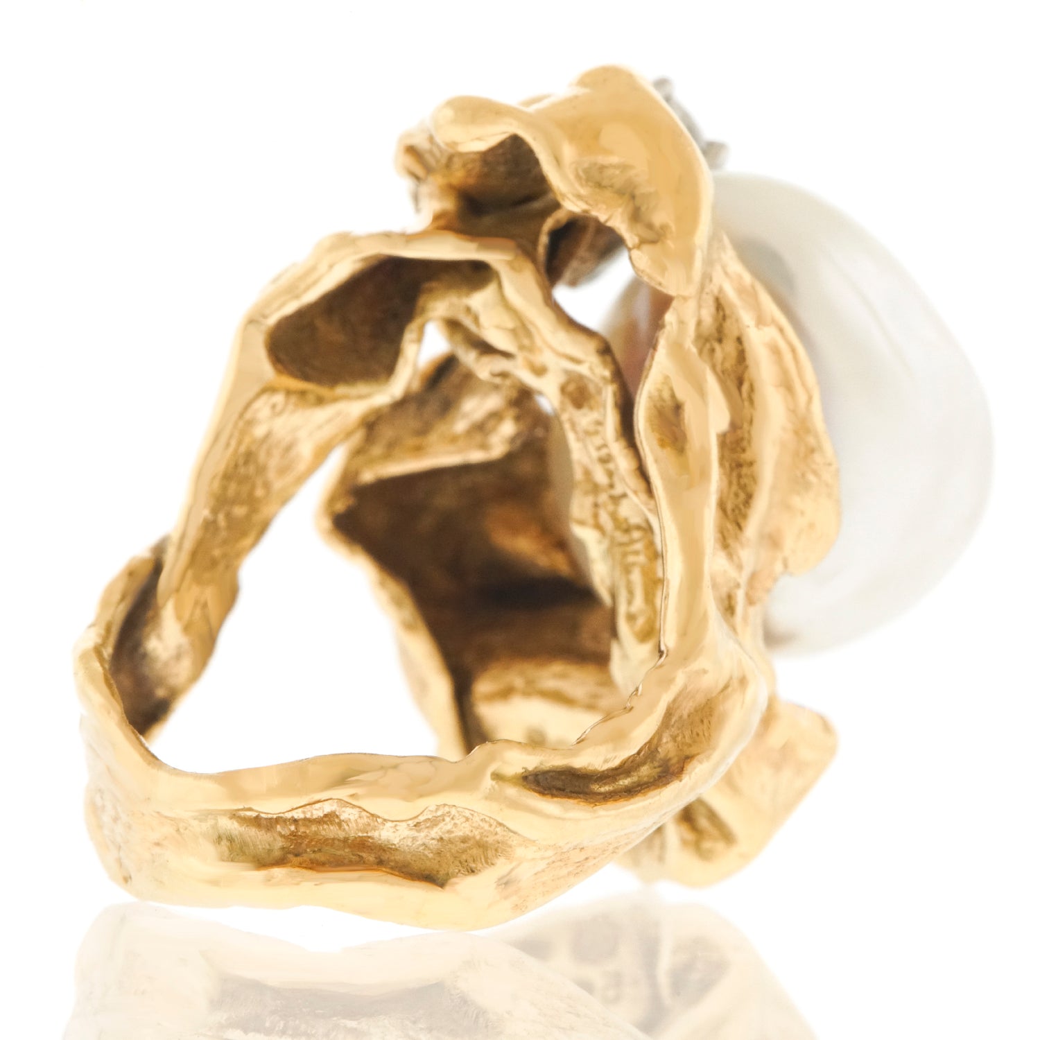 Circa 19970s, 18k, Gilbert Albert, Genève, Switzerland.   From the catwalk at Fashion Week to the Art museum Gala, Gilbert Albert's work sets the style for any moment of fashion. This 18k gold ring is a miniature abstract sculpture set with diamonds and a large pearl. Gilbert Albert has been a major influence in Art jewelry since the 1950s; his work is included in important public and private collections.  This ring is superbly fabricated and in excellent condition.