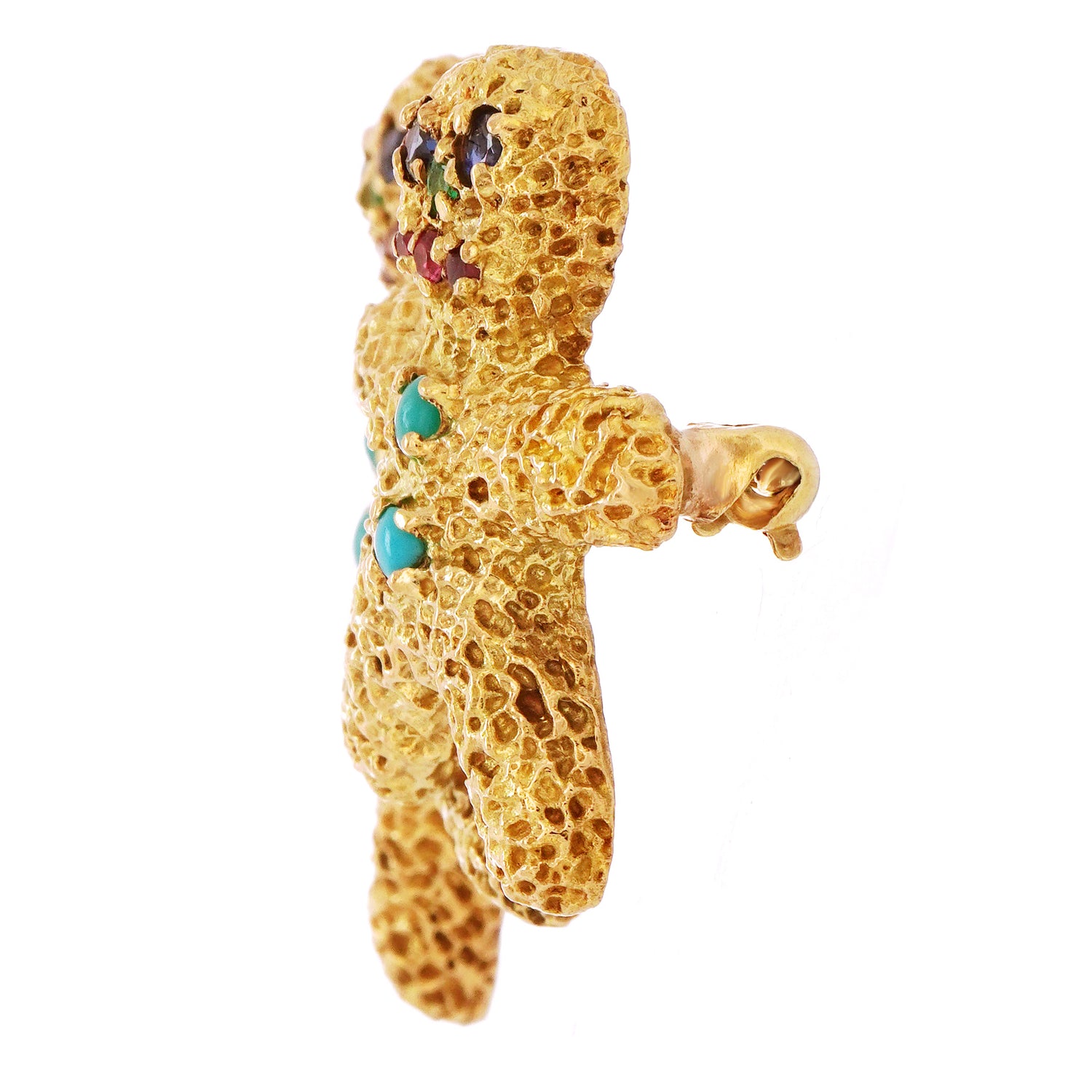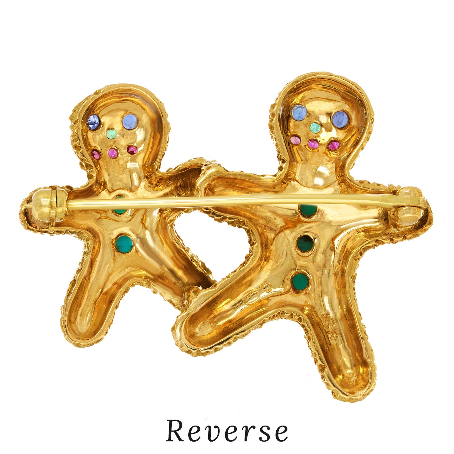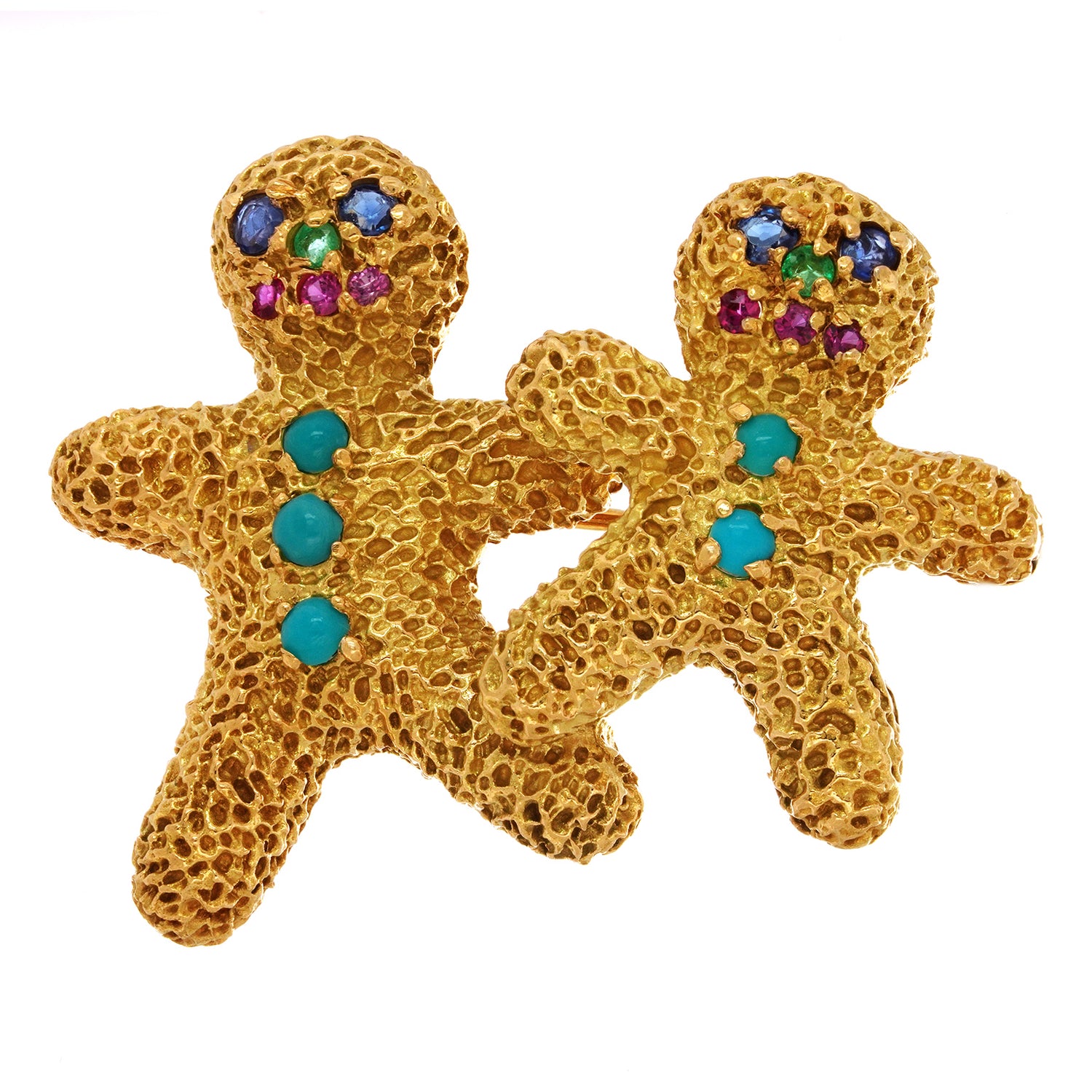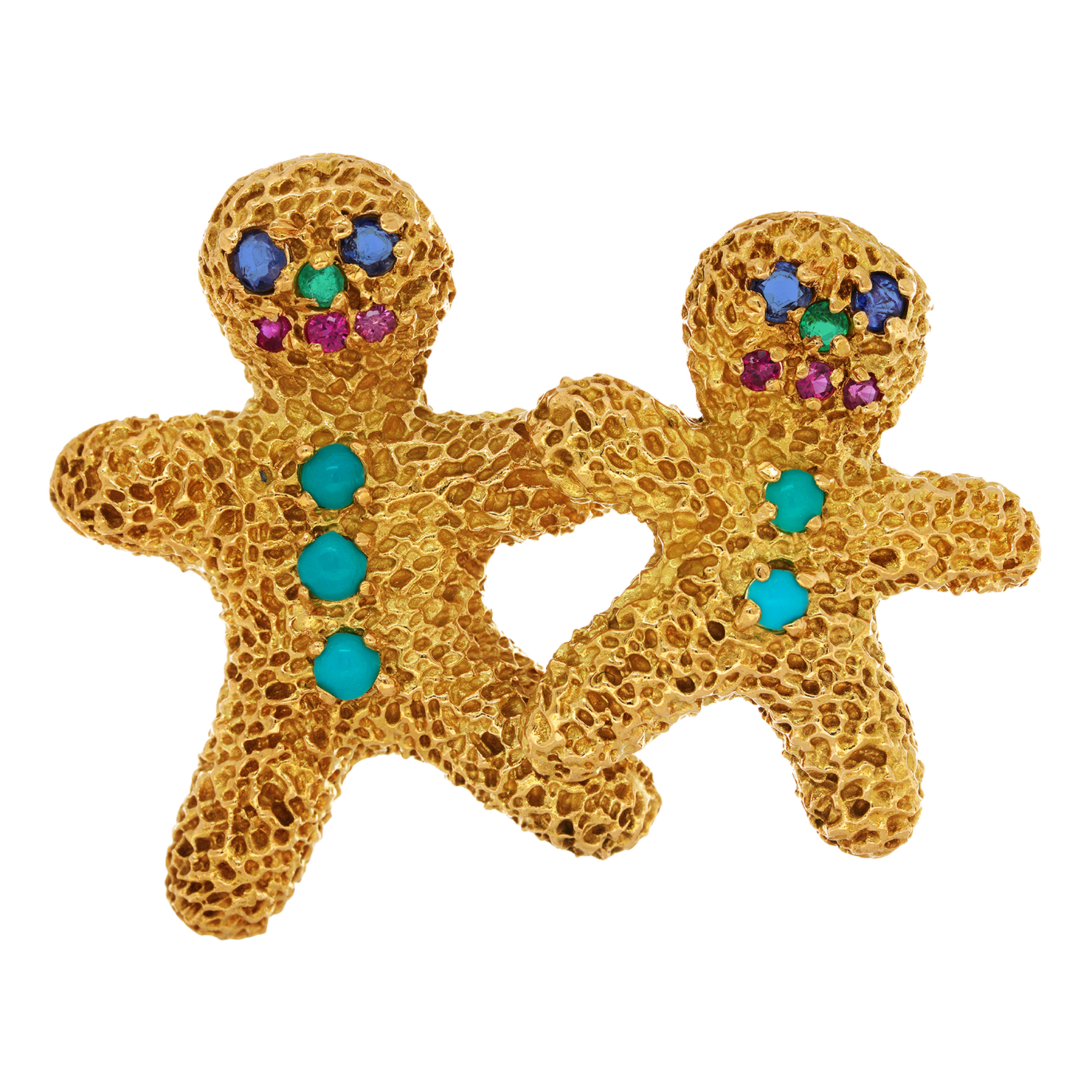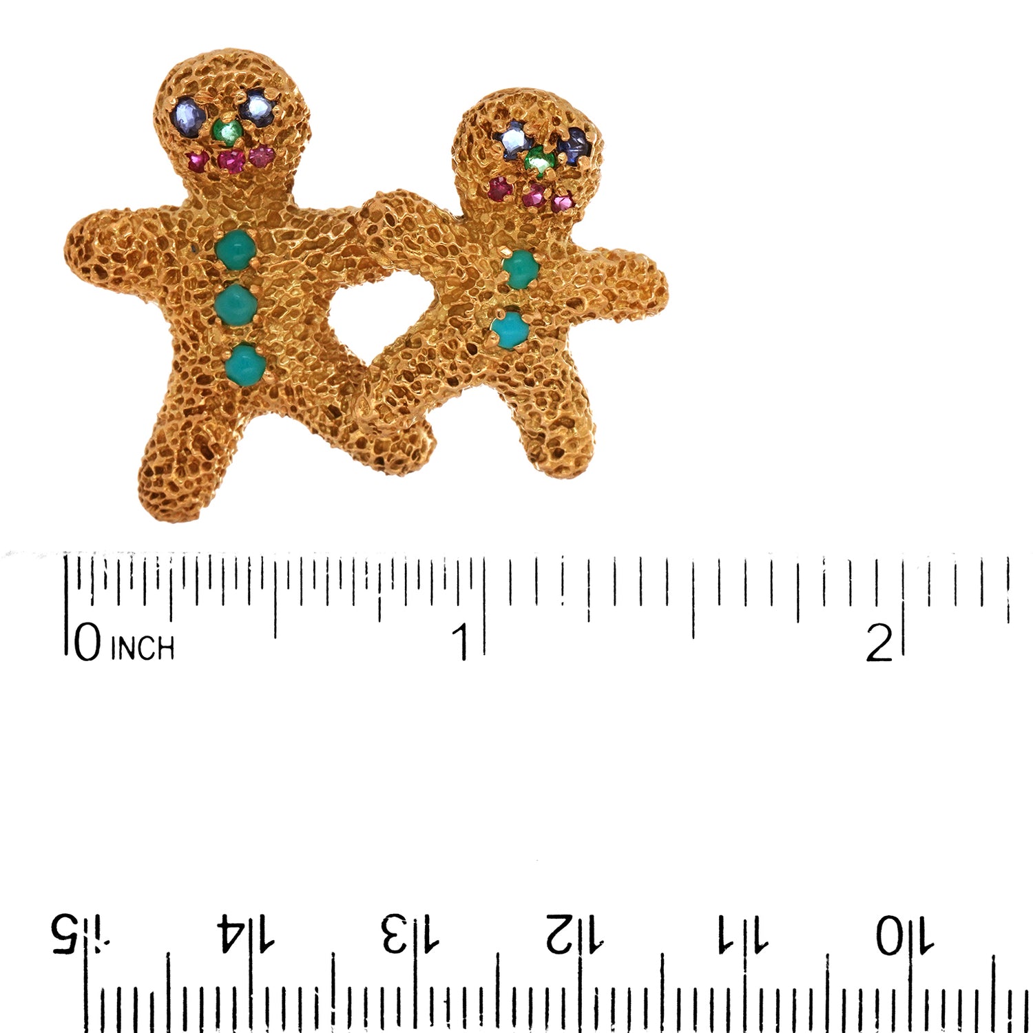 Circa 1960s, 18k, American. This utterly charming 1960s gingerbread men brooch is as rare as it is fun! Beautifully made in 18k yellow gold and set with sapphires, rubies, emeralds and Persian turquoise, the look is holiday happiness perfection! Excellent condition.