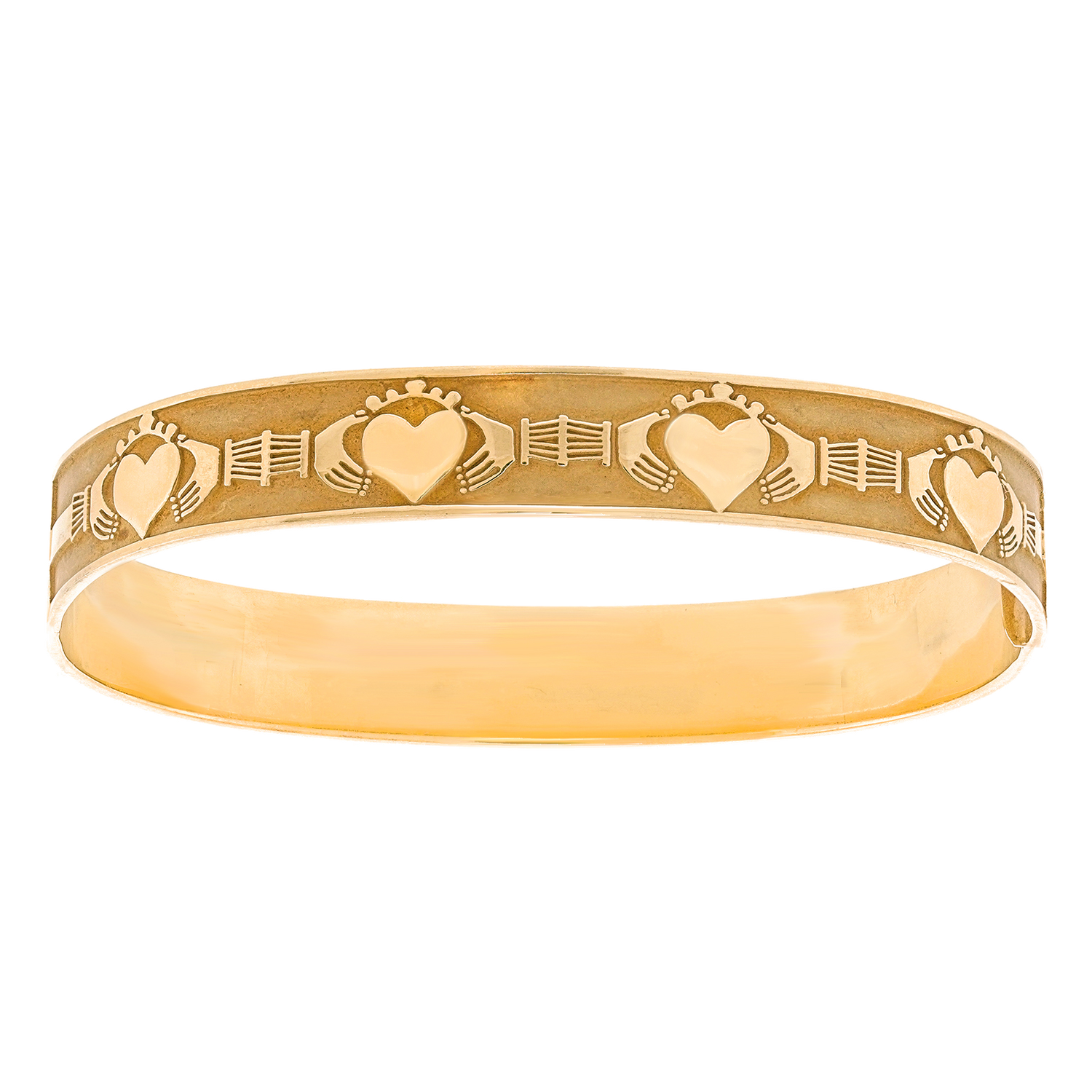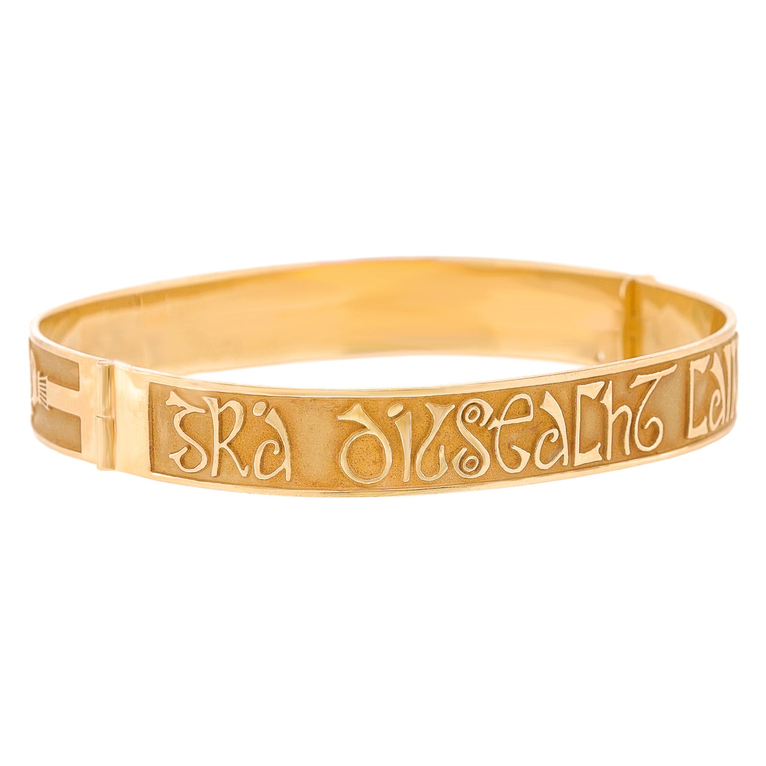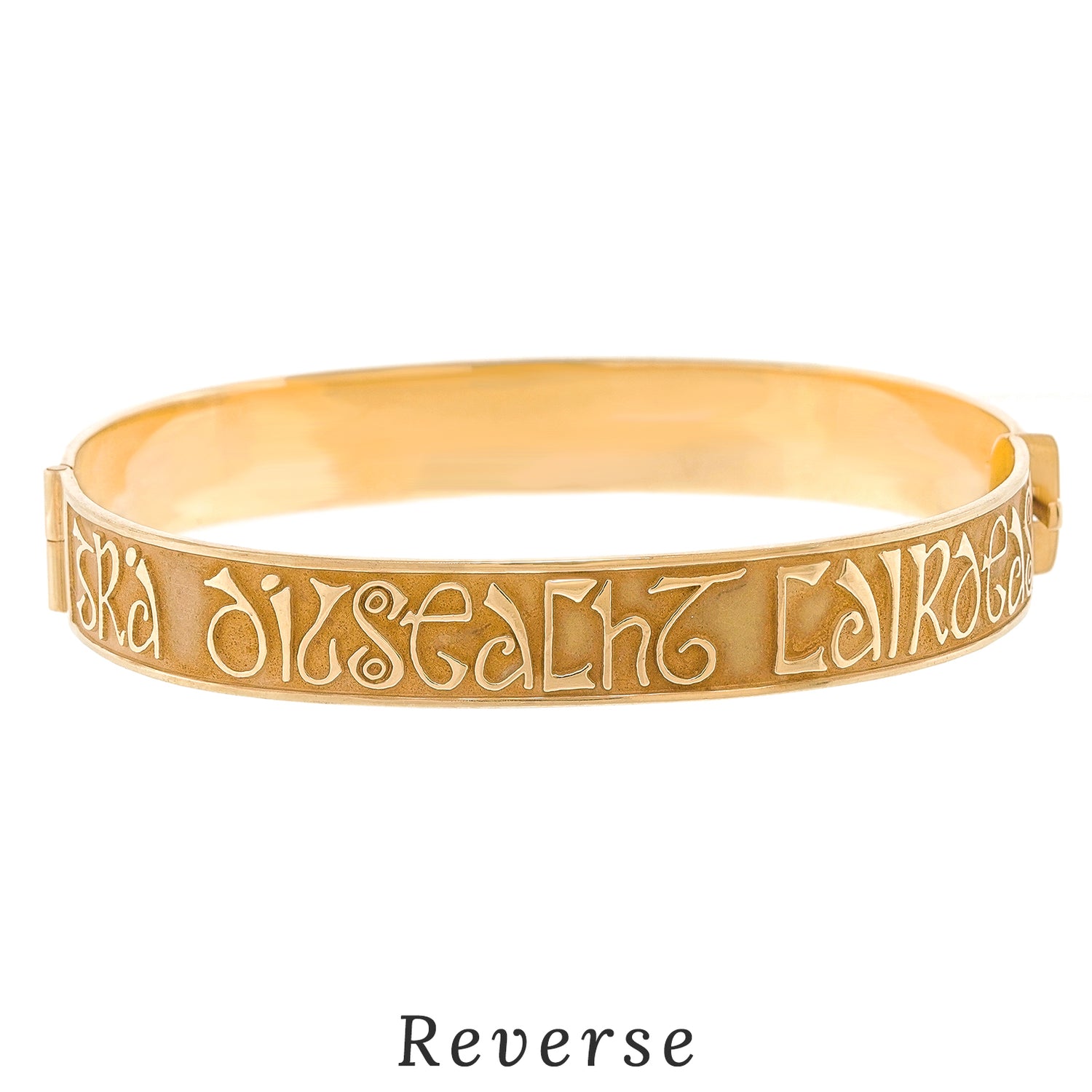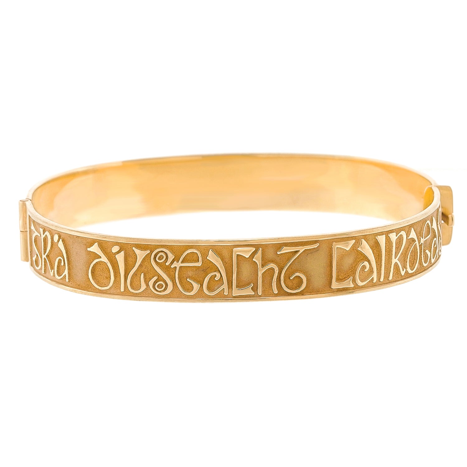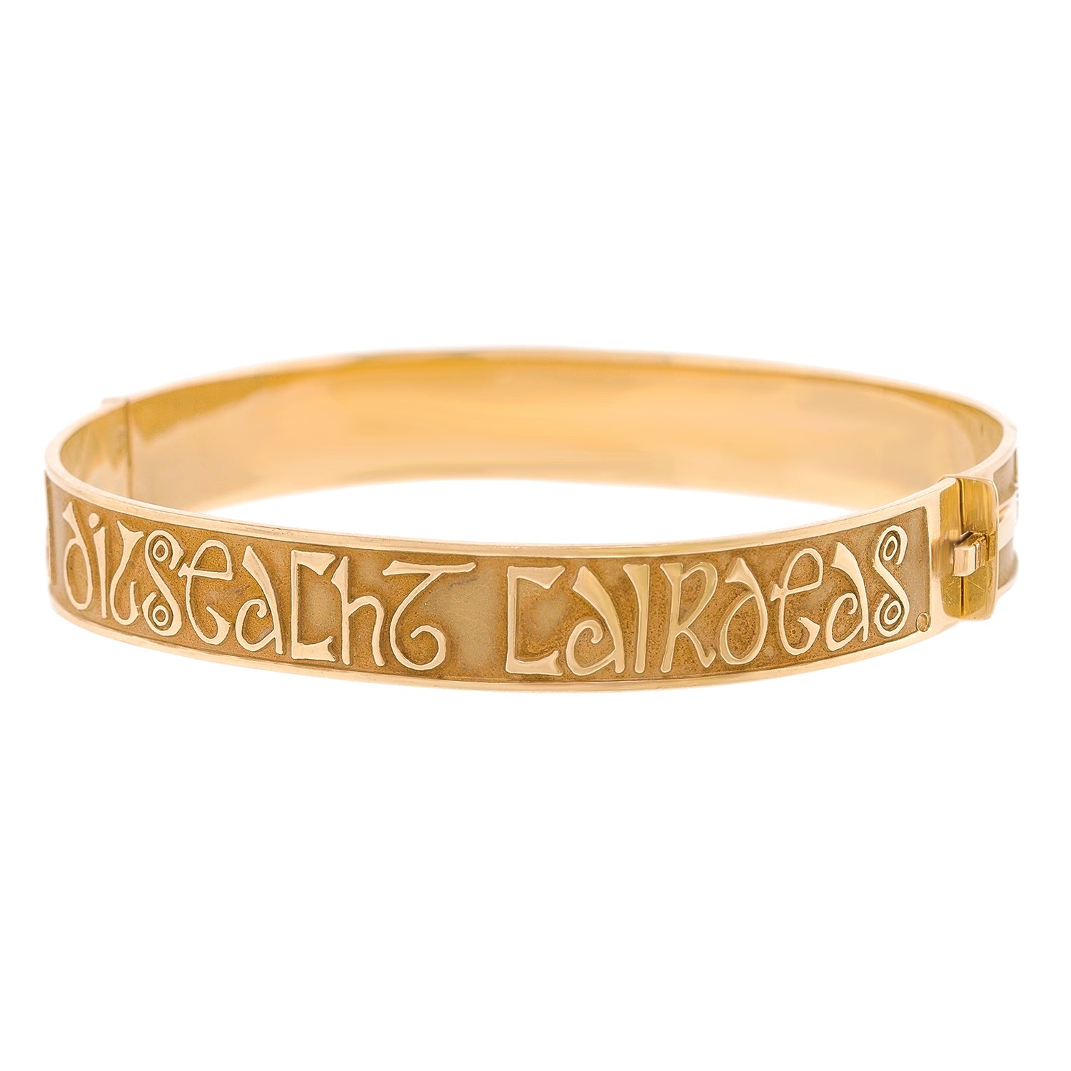 Circa 1991, 14k, Dublin, Ireland. "Grá dílseacht cairdeas" in Irish translates to "Love, Loyalty, Friendship". Both sides of this gorgeous 14k yellow gold bracelet celebrate this very Gaelic sentiment. The words in Irish on one side and the Claddagh on the other. Beautifully made and rather rare in gold, this bracelet is in excellent condition.