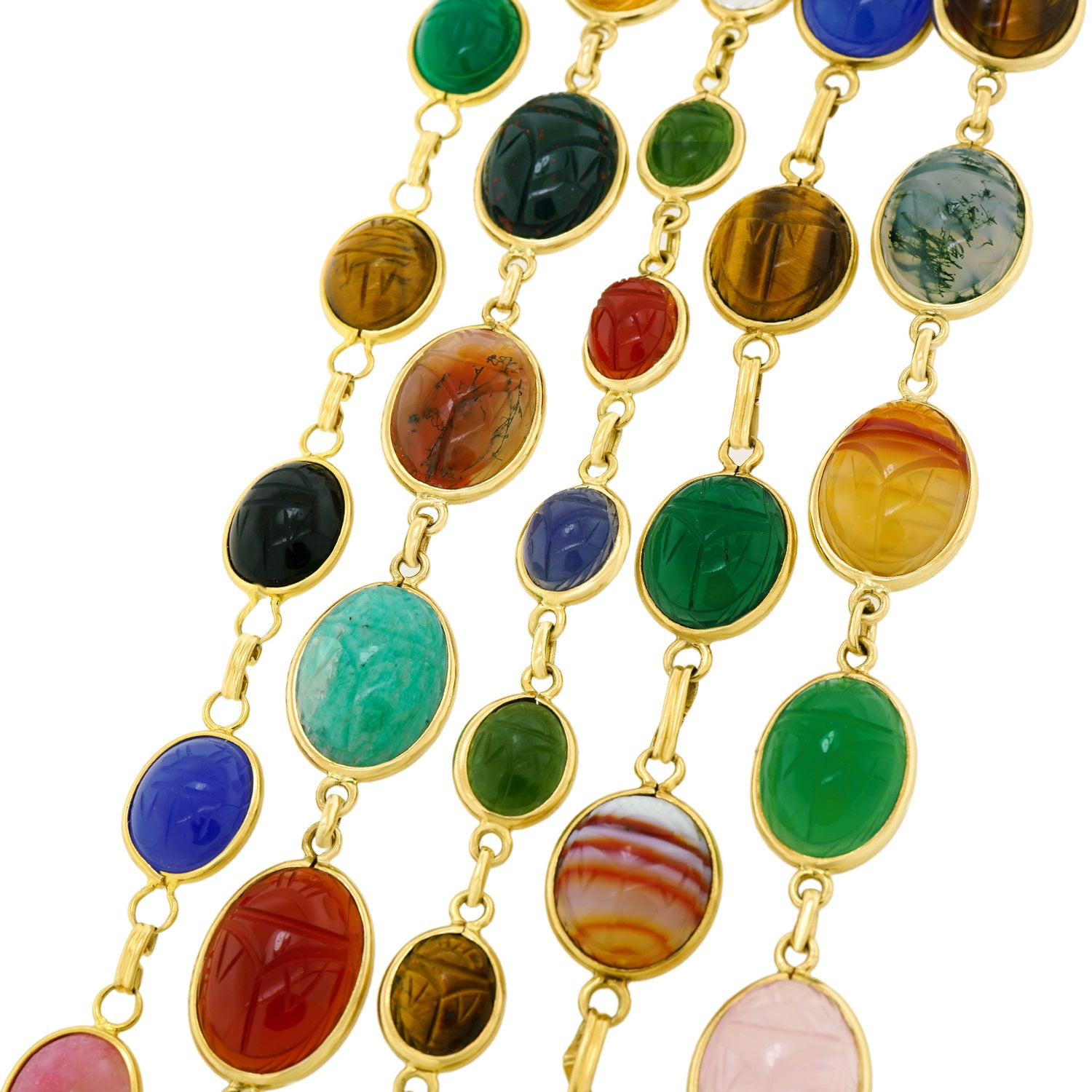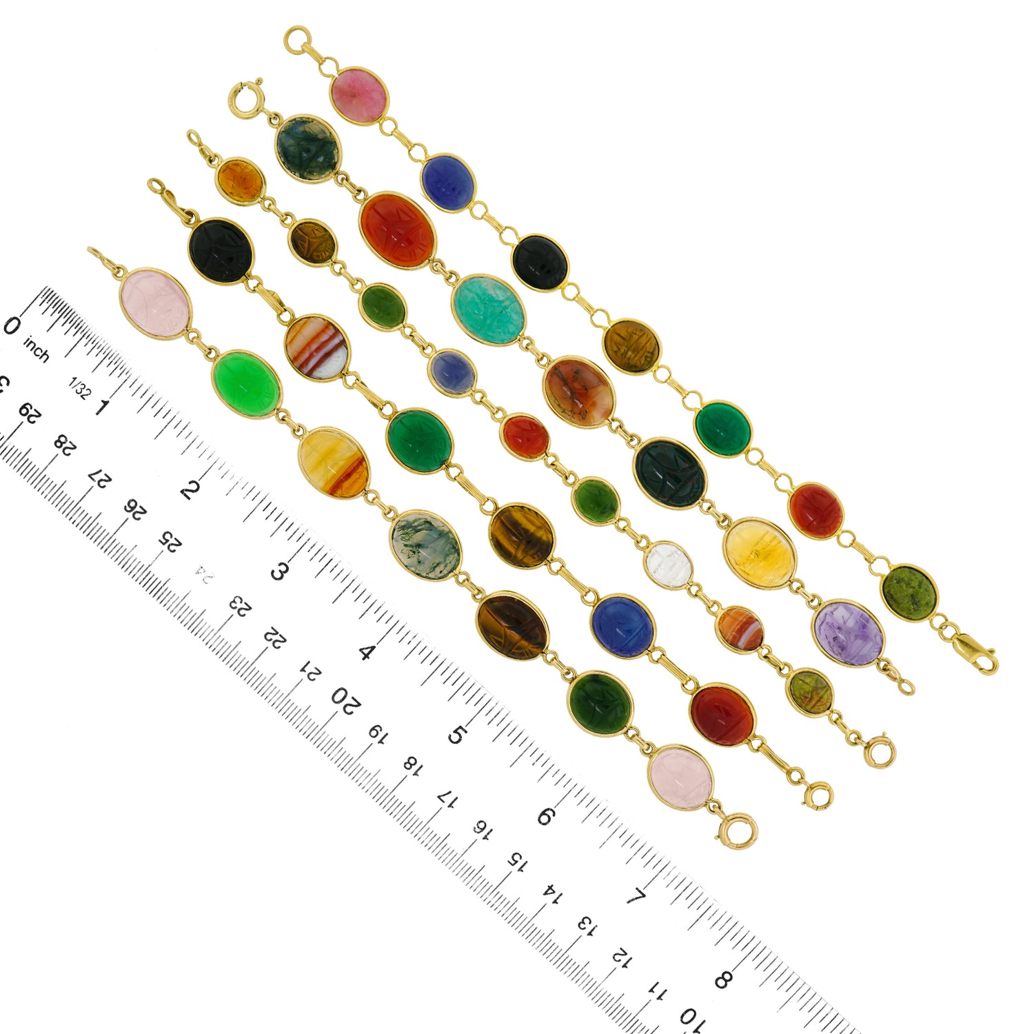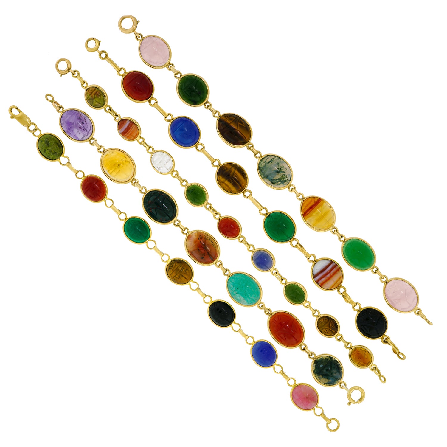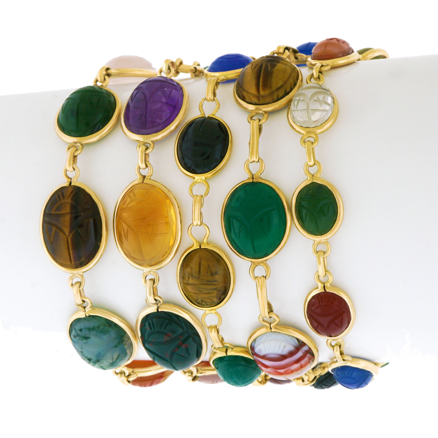 Circa 1950s, 14k, American.  Multiples are a thing and these 5 scarab bracelets are fifties fashion at their colorfully vintage best! From ripped jeans to business casual, they will add playful chic to any look. Well made with amethyst, agate, pink quartz, carnelian, tiger's eye, quartz, citrine, bloodstone, and more, they are in excellent condition.