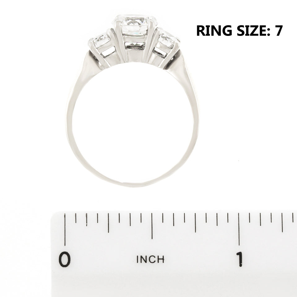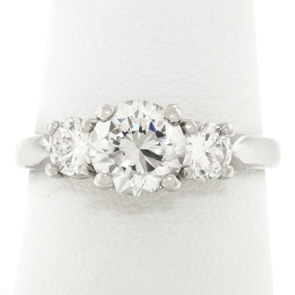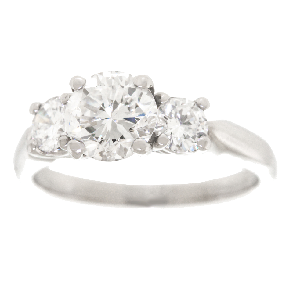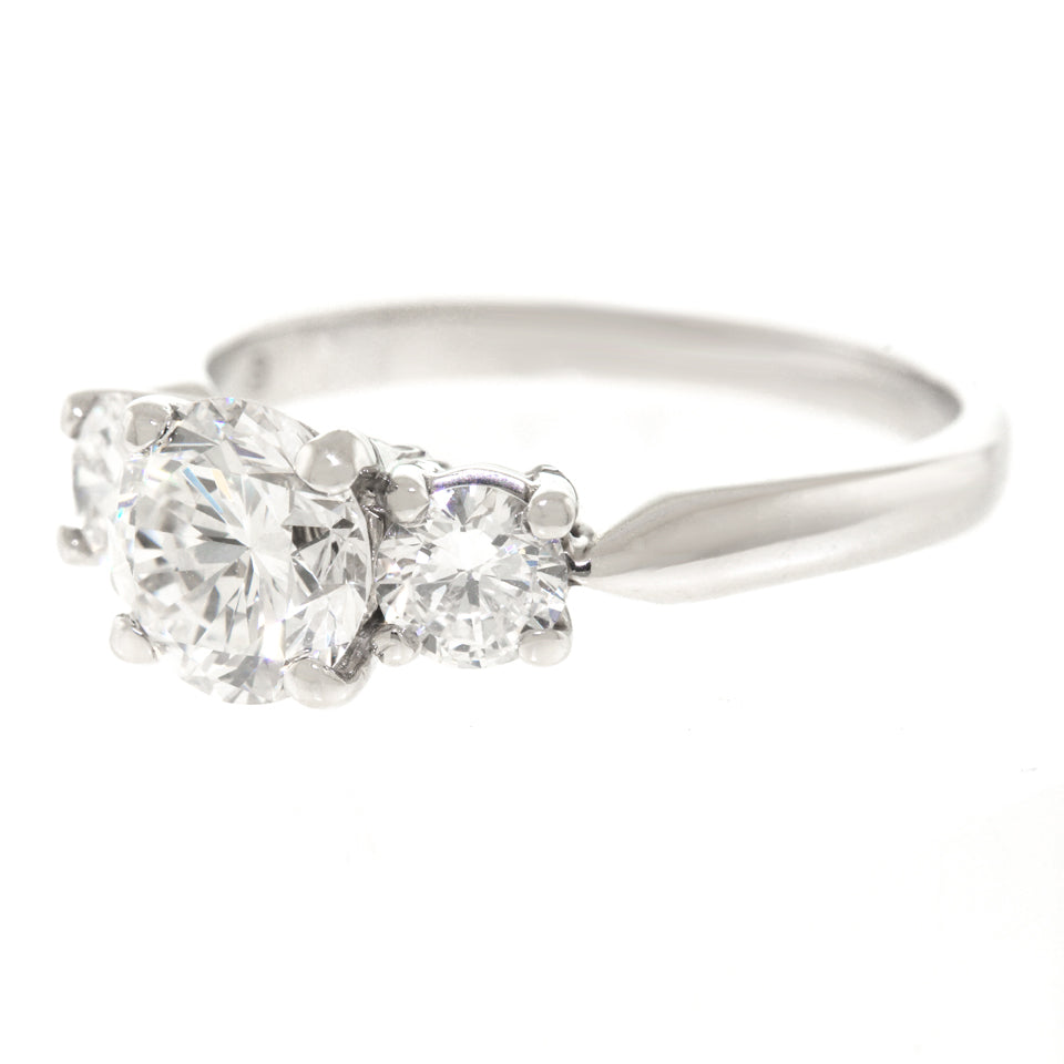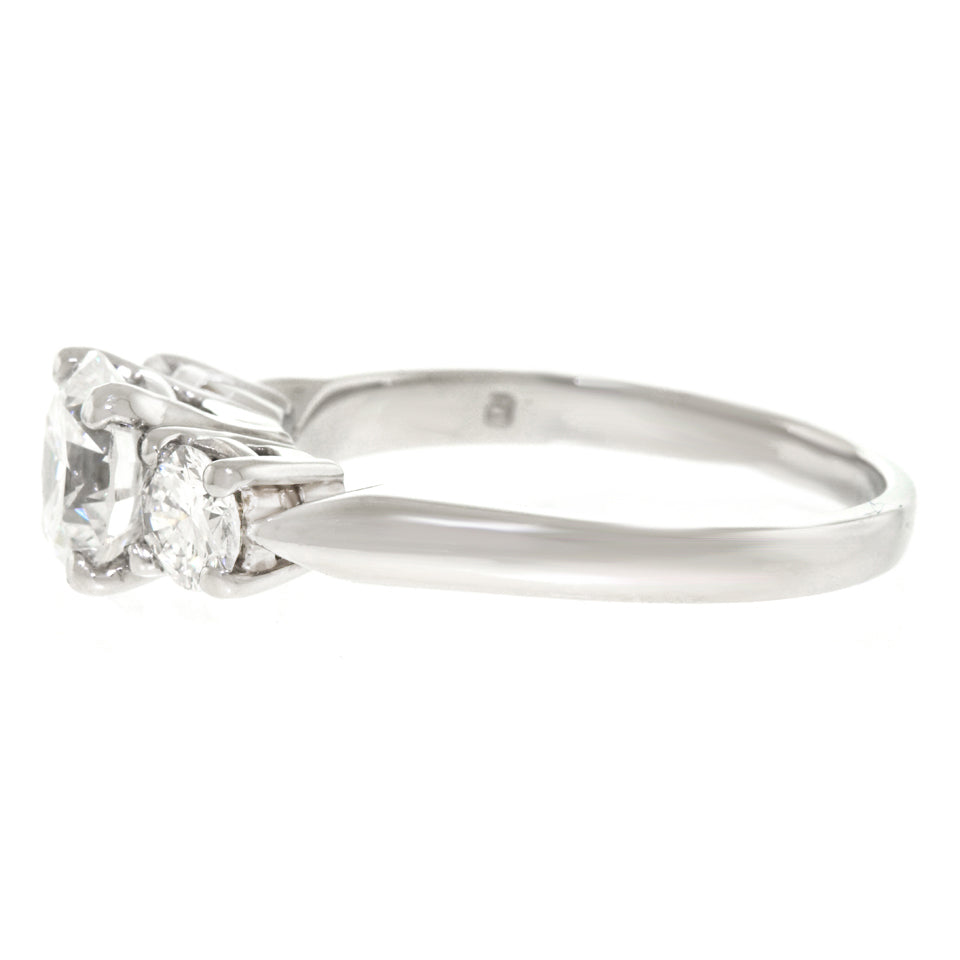 Circa 1990s, Platinum, American.  This classic three-stone ring is about superb diamonds, tasteful styling and fine craftsmanship. The brilliant white 1.20 carat center diamond is G color and VS1 clarity (accompanied by an SSEF Swiss Gemological laboratory certificate), and the two .25 carat side stones are H color and SI1 clarity. Its timeless look is underscored by exceptional fabrication.