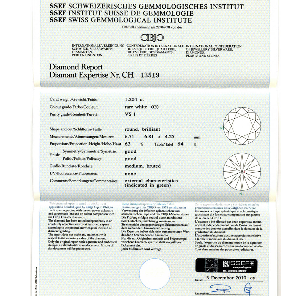 Certificates: Laboratory certificate issued for 1.20ct diamond by SSEF, the Swiss Gemological Institute, similar to GIA with the same or more rigorous standard for grading.