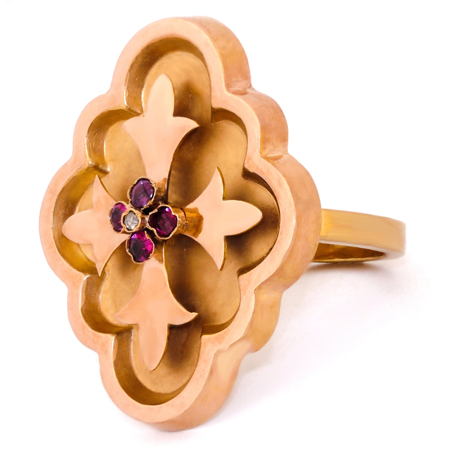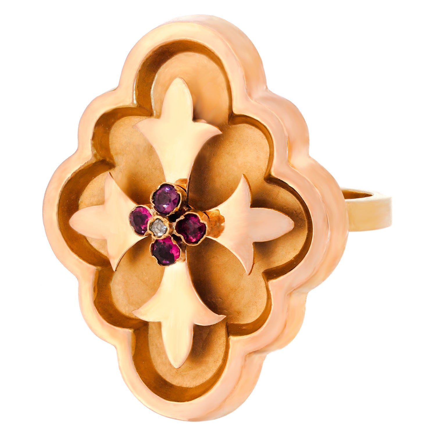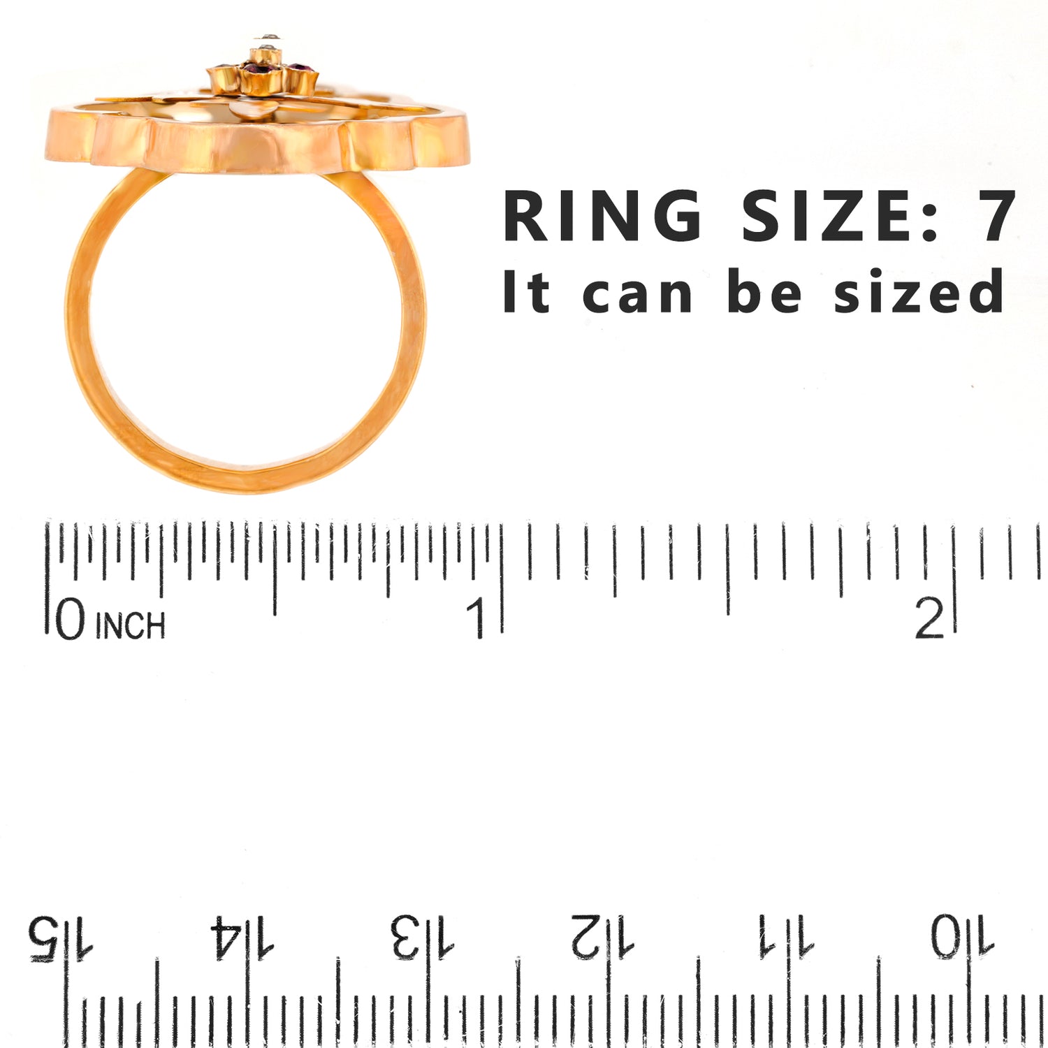 Circa 1960s, 18k/14k, American.  Gothic pop art American sixties style!  Think posh motorcycle rings on the cover of Vogue, authentic verve, American cool! The perfect casual gold accessory to add a one-of-a-kind look to everyday moments of fashion. Well made in 18 and 14-karat gold and set with purple Almandine garnets, this ring is in excellent condition.