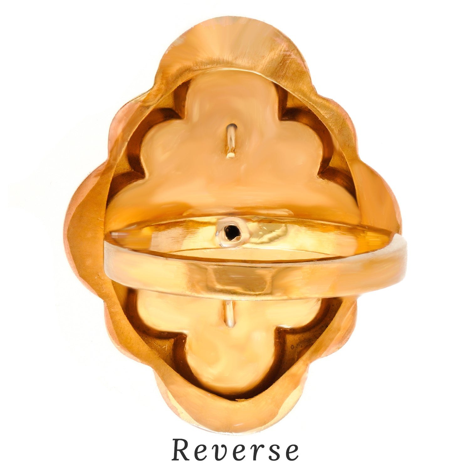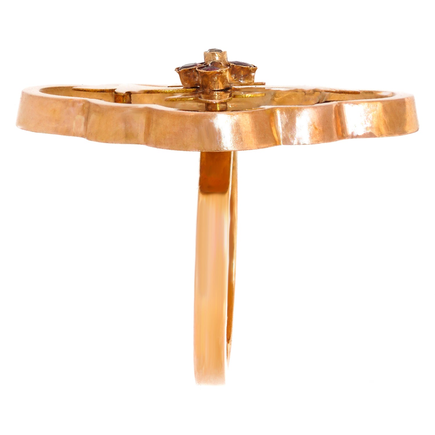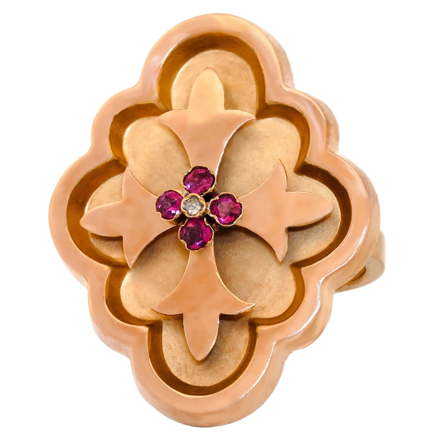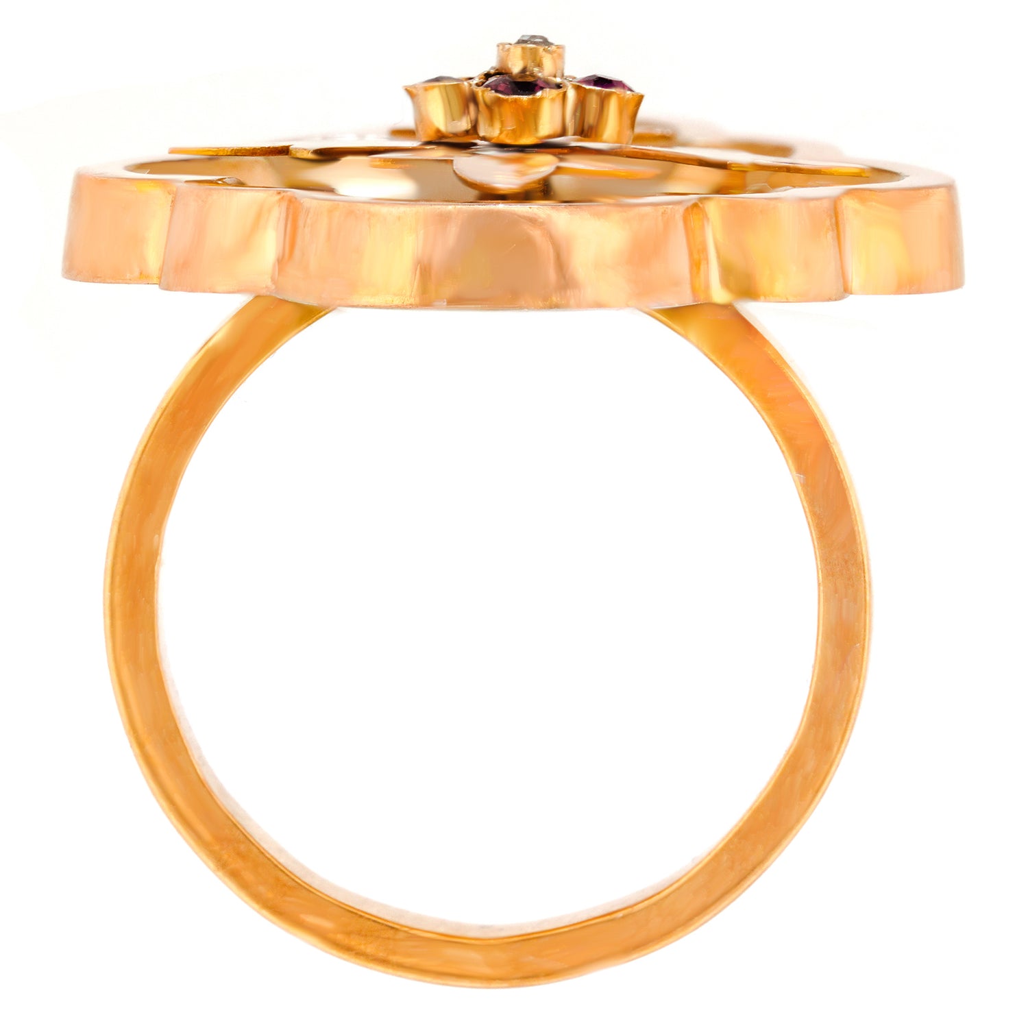 Circa 1960s, 18k/14k, American.  Gothic pop art American sixties style!  Think posh motorcycle rings on the cover of Vogue, authentic verve, American cool! The perfect casual gold accessory to add a one-of-a-kind look to everyday moments of fashion. Well made in 18 and 14-karat gold and set with purple Almandine garnets, this ring is in excellent condition.