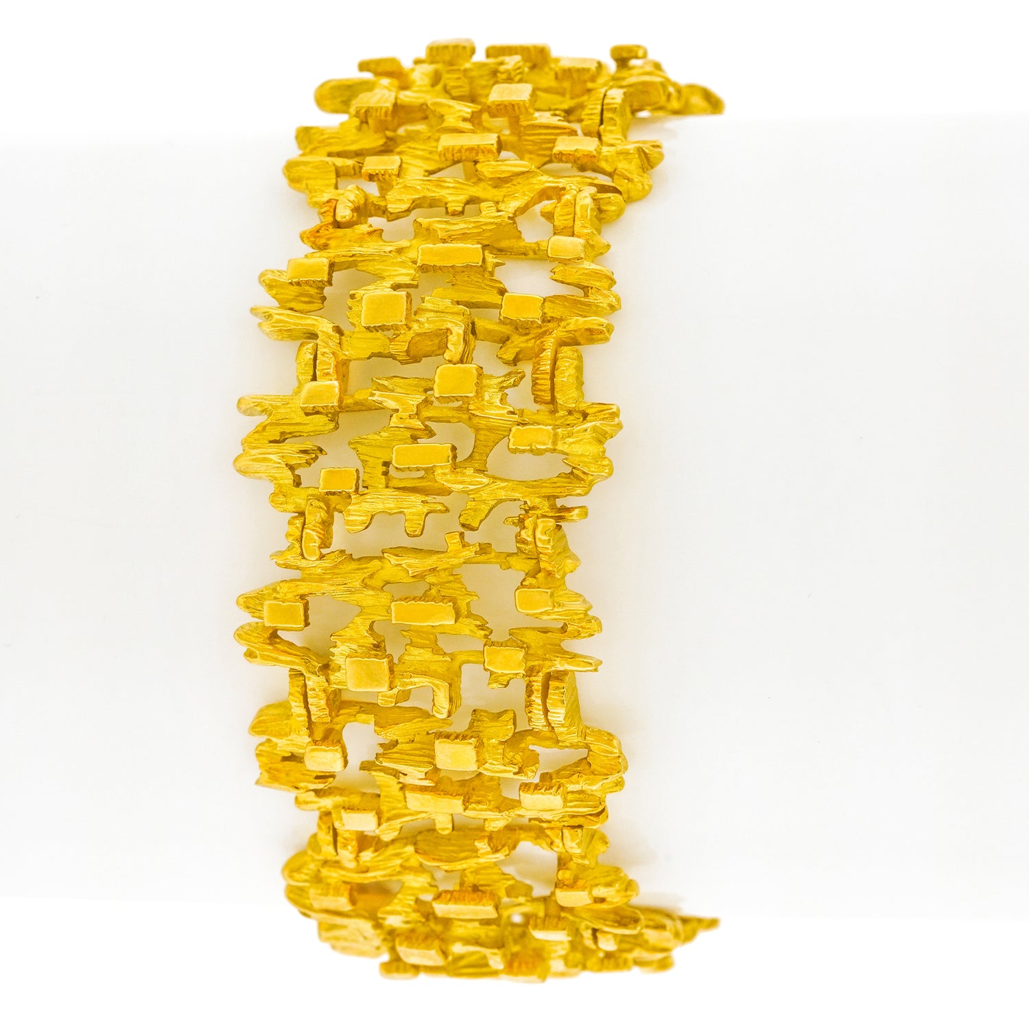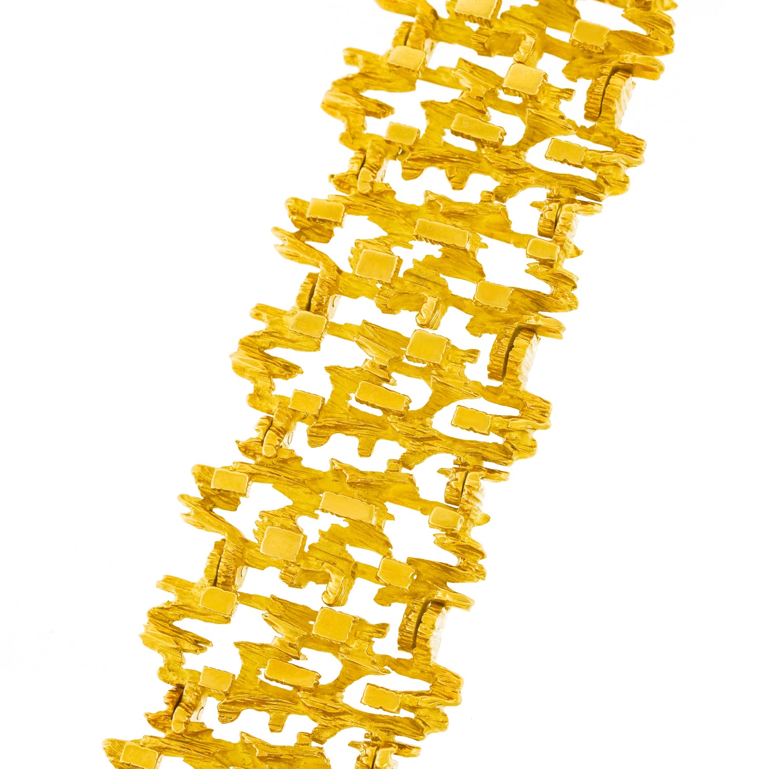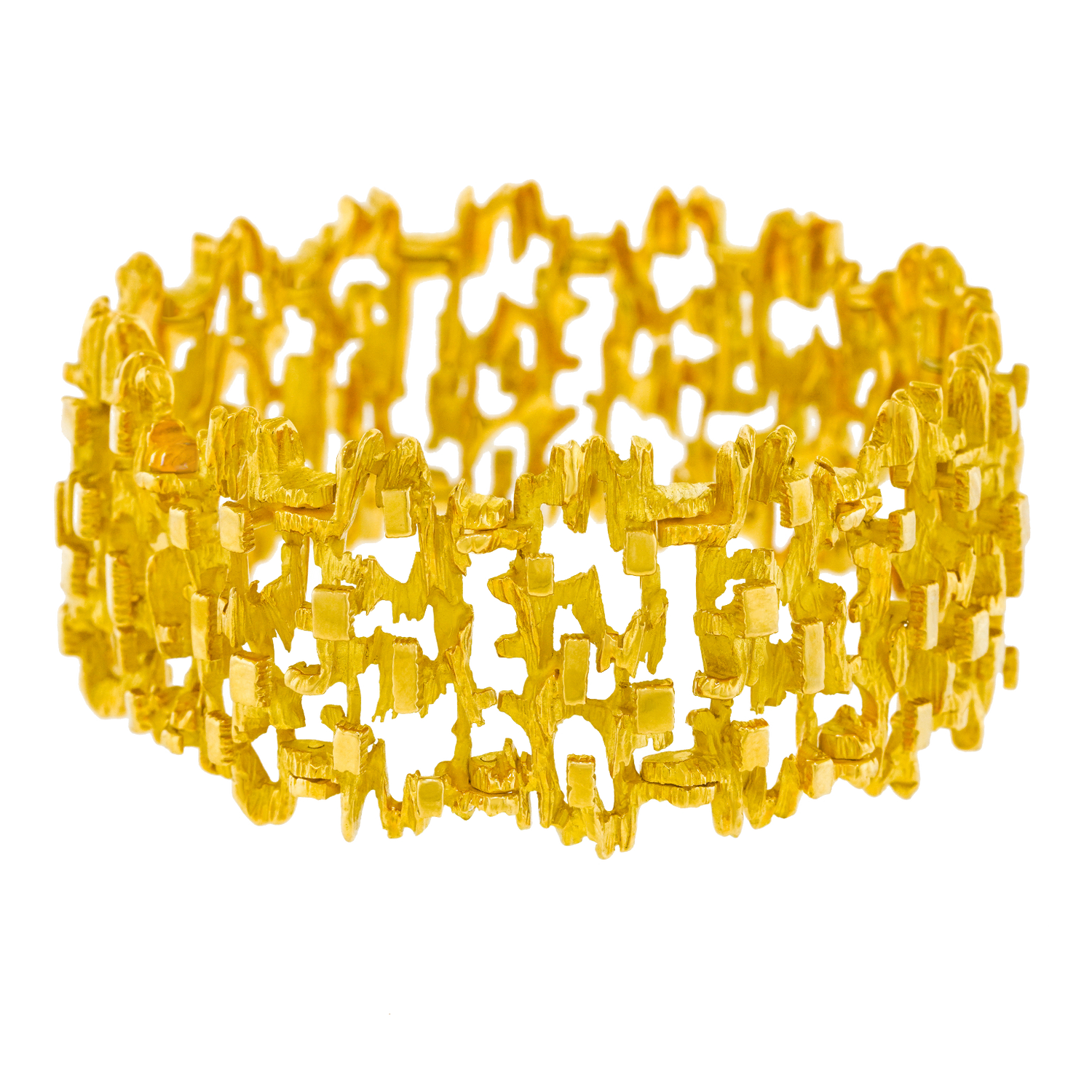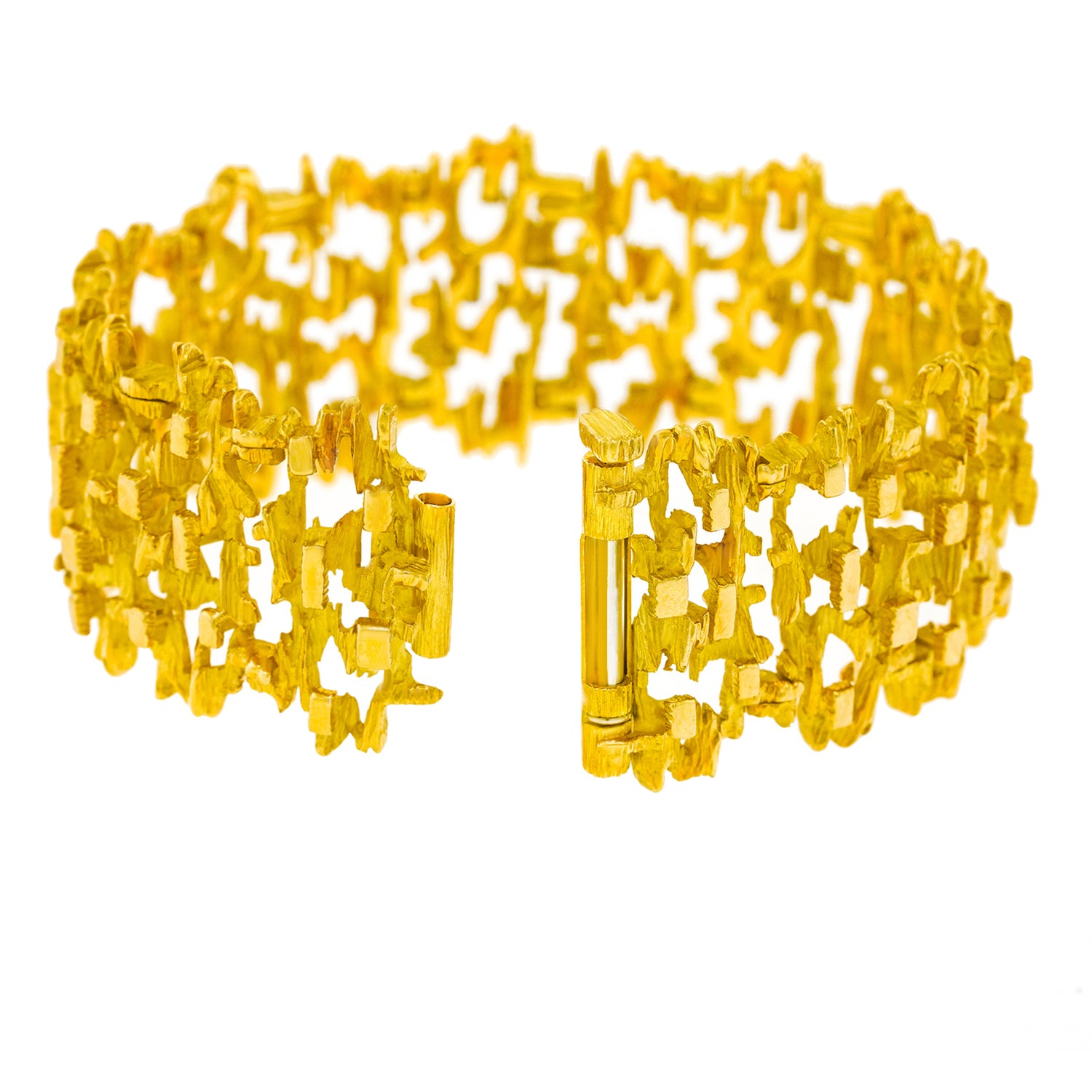 Circa 1970s, 18k, by Gubelin, Switzerland. Modernism ruled the mid-century fashion world and this tasteful bracelet from Gubelin is a stellar example. The Andrew Grima-inspired design has never gone out of production, (every few years Gubelin produces a few pieces). (Ours was made in the 1970s.) Casual enough for heels and jeans, it has an artistic authority that makes it a great match for cocktails or ball gowns. Excellent condition.