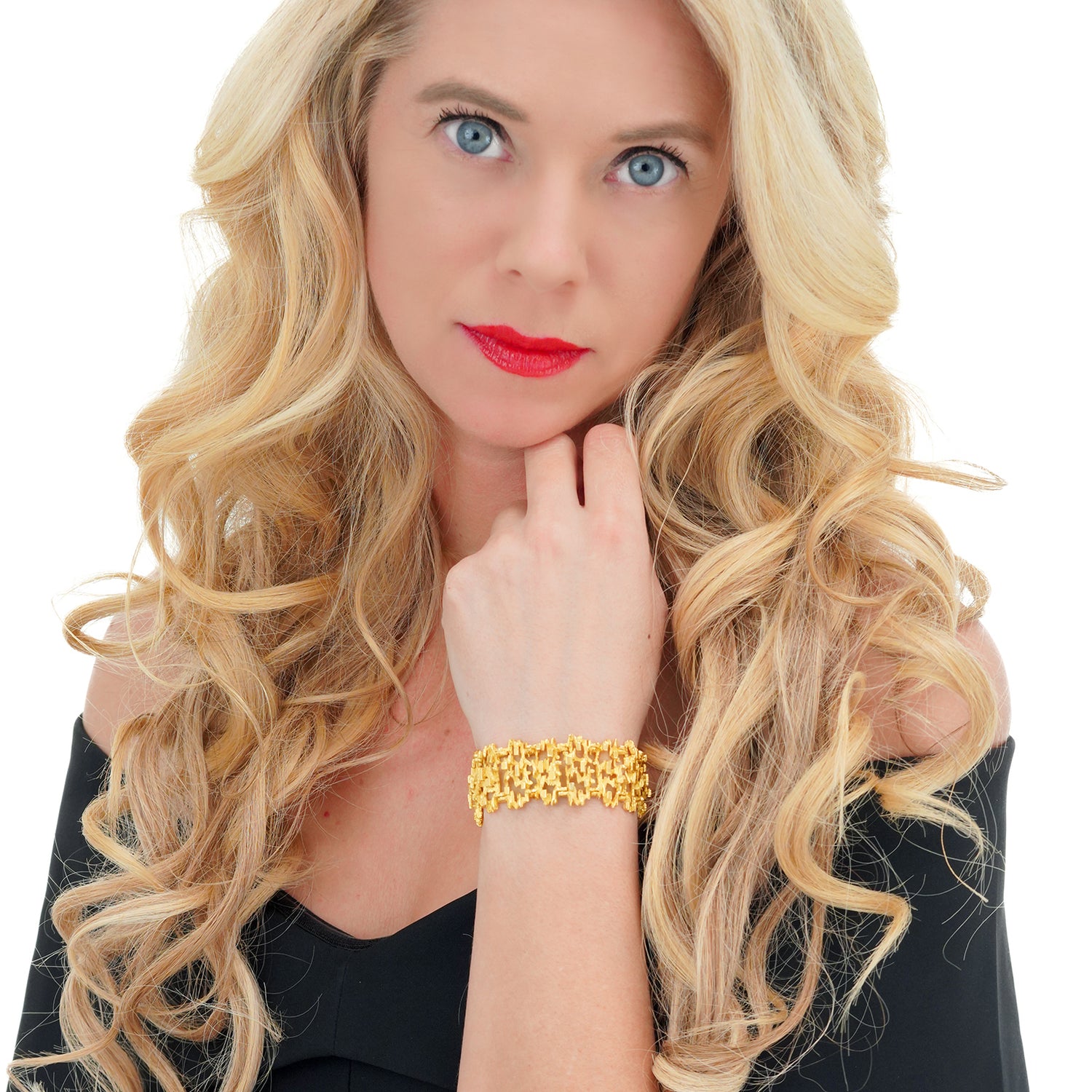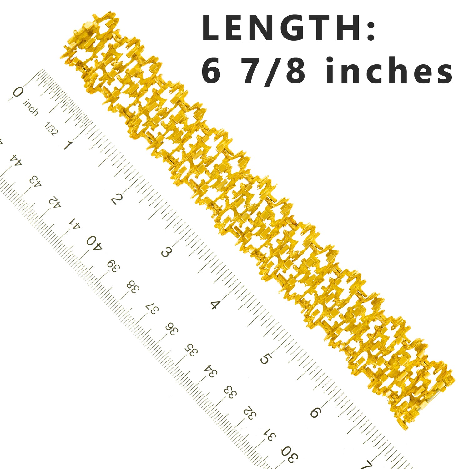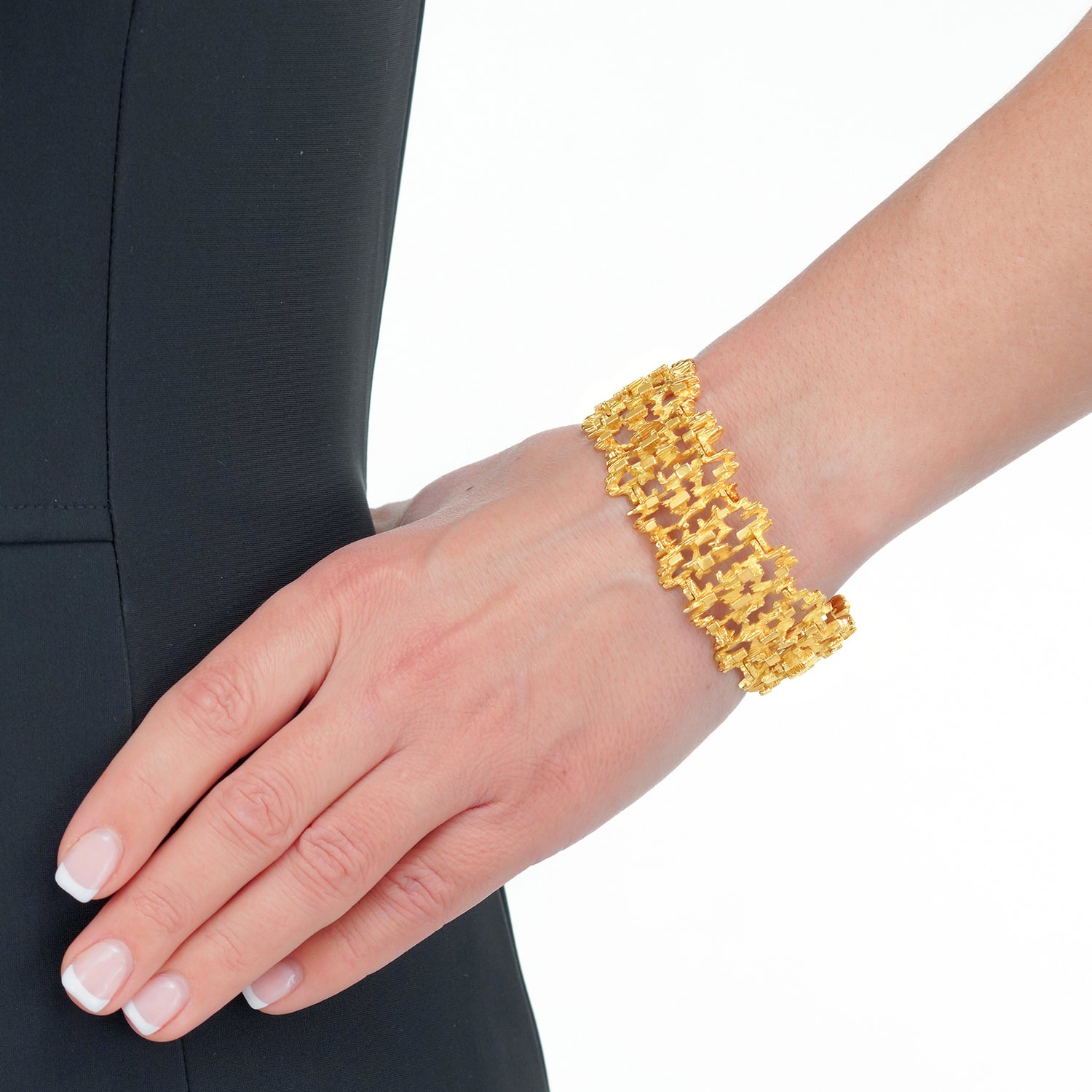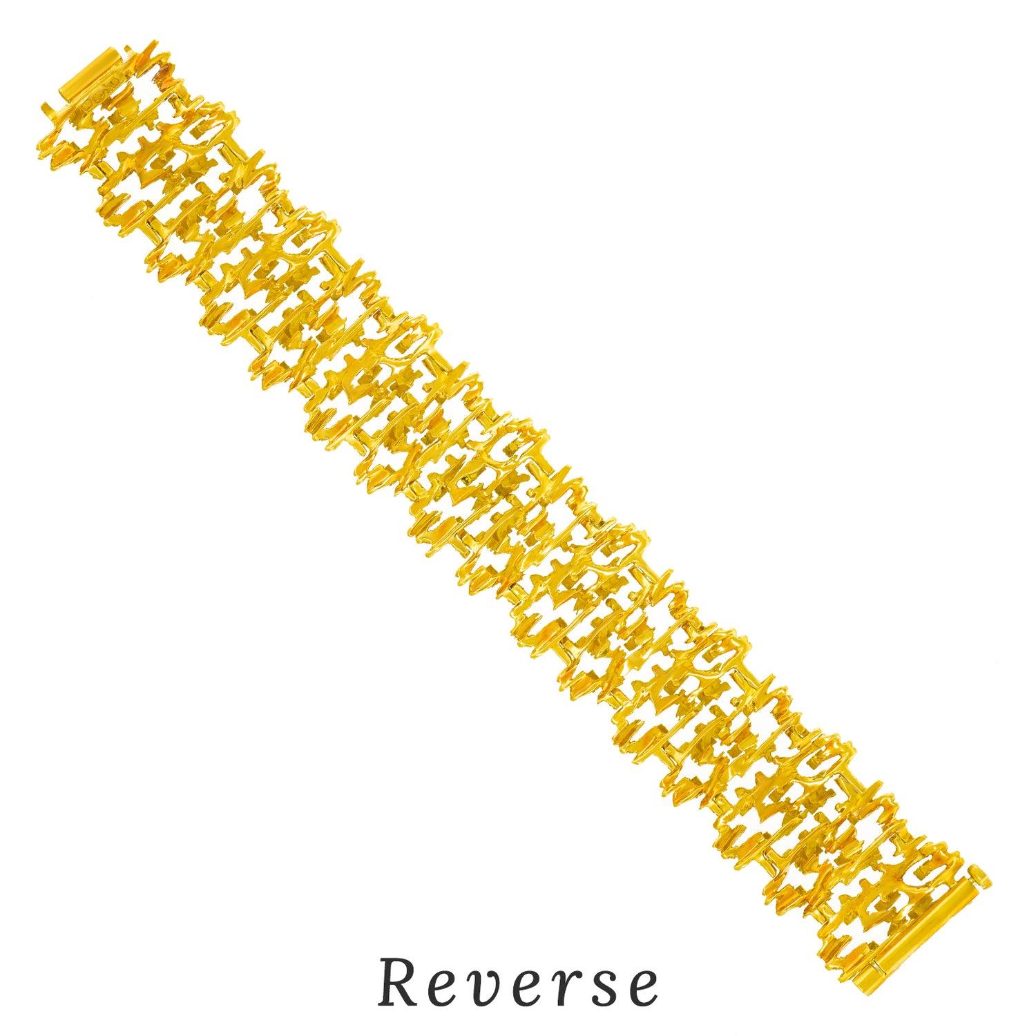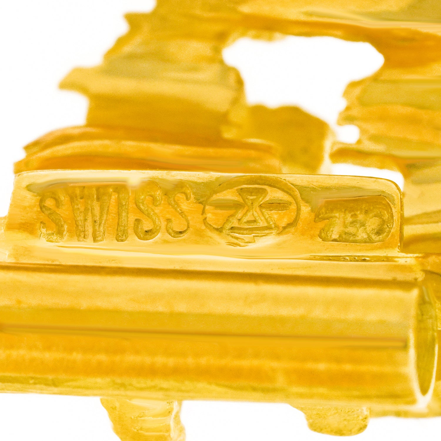 Circa 1970s, 18k, by Gubelin, Switzerland. Modernism ruled the mid-century fashion world and this tasteful bracelet from Gubelin is a stellar example. The Andrew Grima-inspired design has never gone out of production, (every few years Gubelin produces a few pieces). (Ours was made in the 1970s.) Casual enough for heels and jeans, it has an artistic authority that makes it a great match for cocktails or ball gowns. Excellent condition.