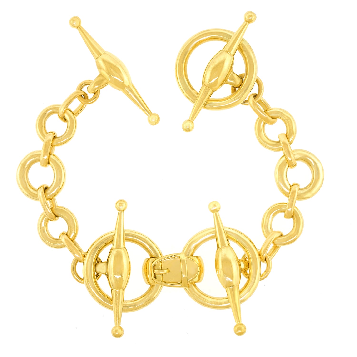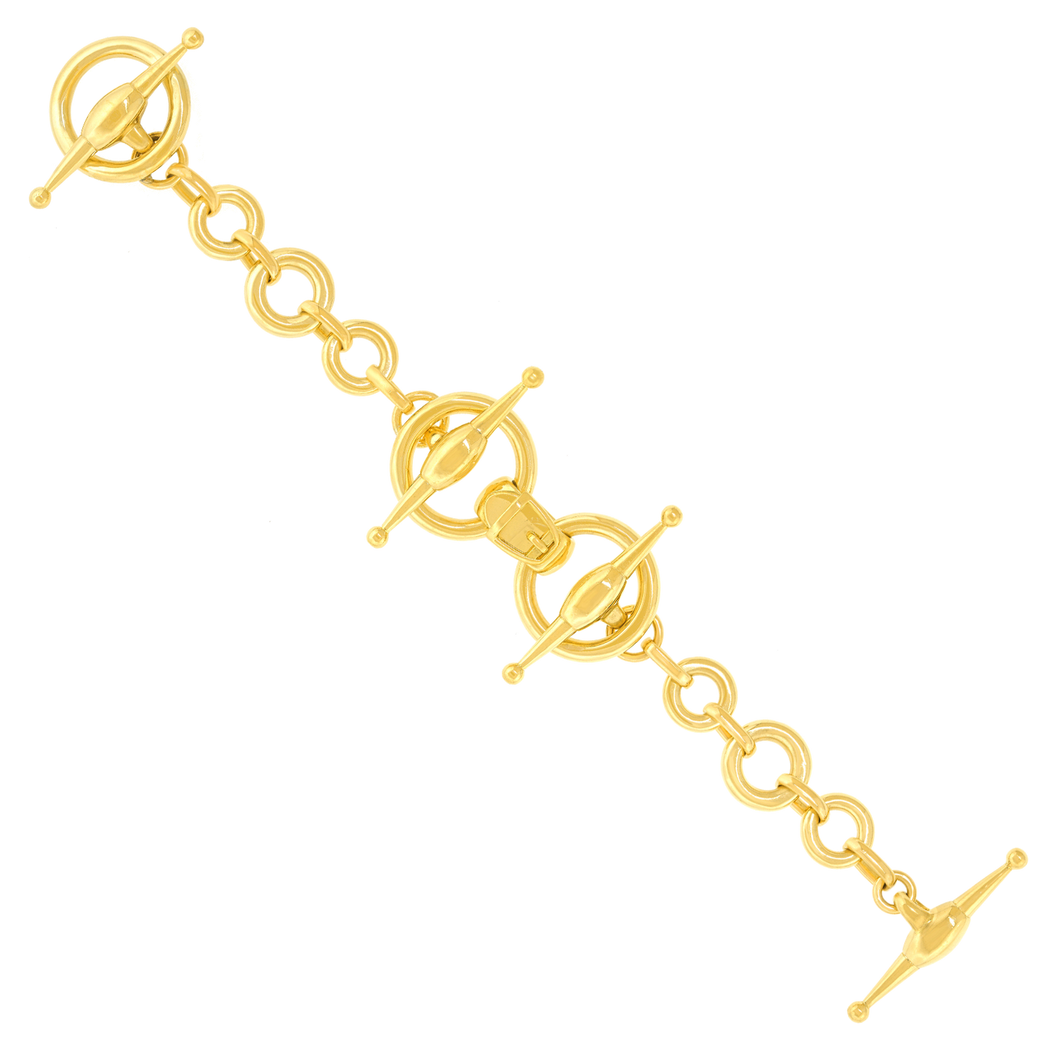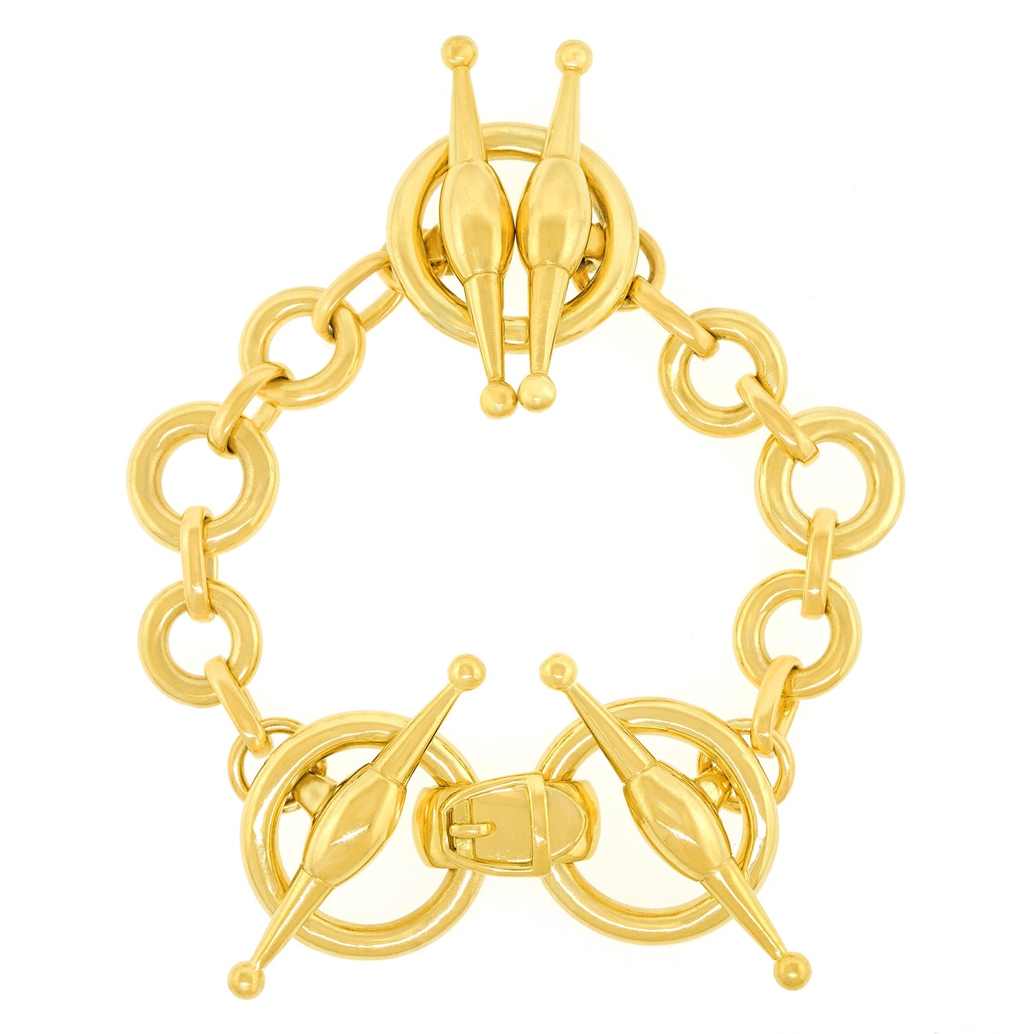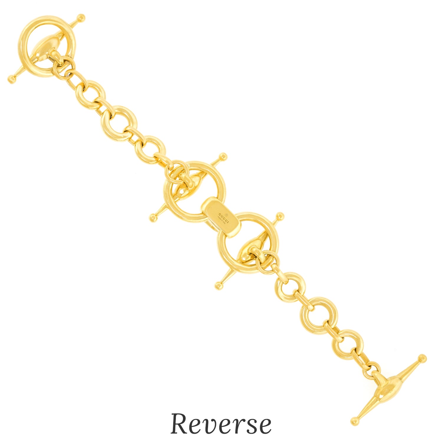 Circa 1990s, 18k, by Gucci, Italy. This gorgeous Gucci bracelet in the ever-stylish horse bit motif, is effortlessly town and country chic. Finely made in polished eighteen-karat yellow gold, it is a particularly robust version ...timelessly Gucci. Excellent condition.