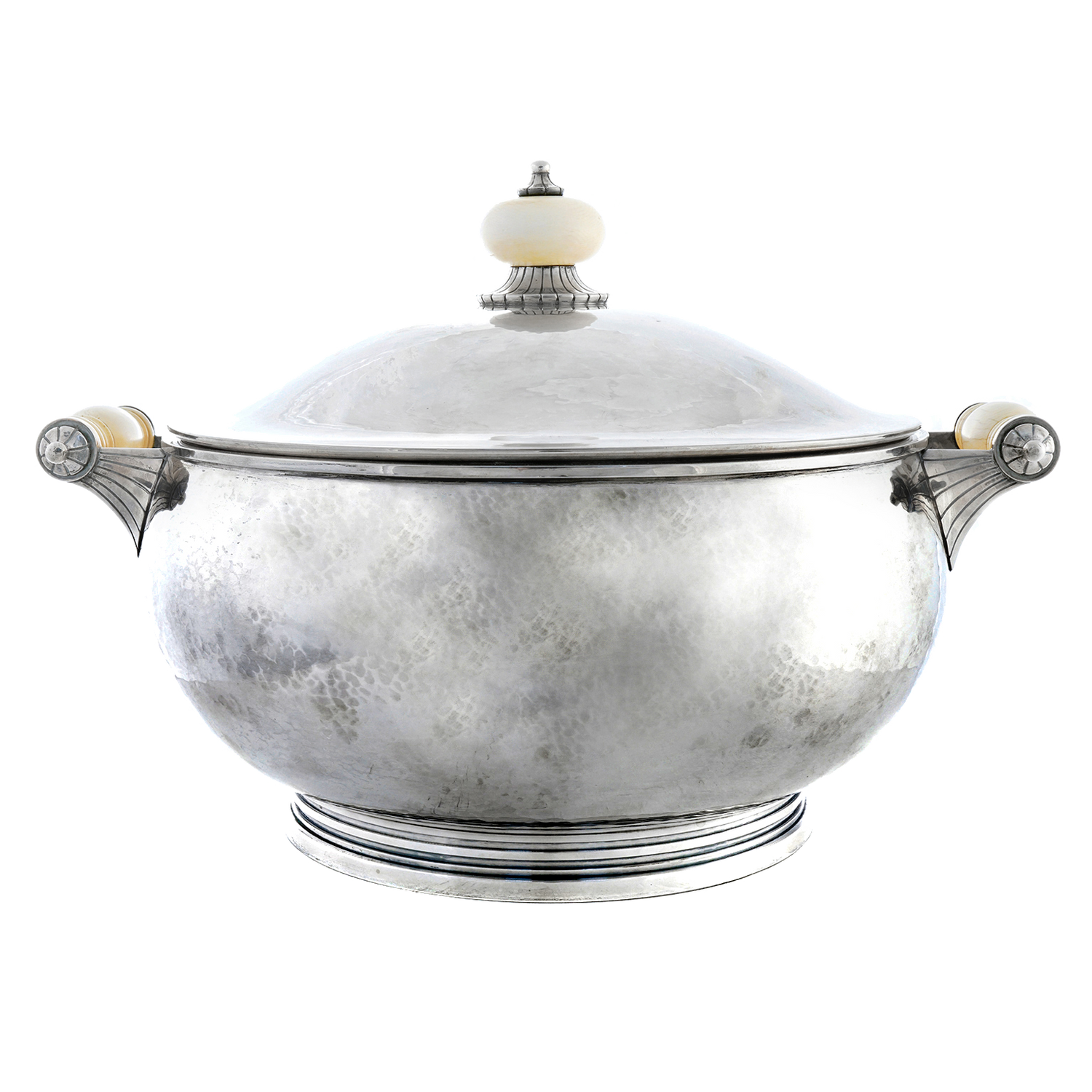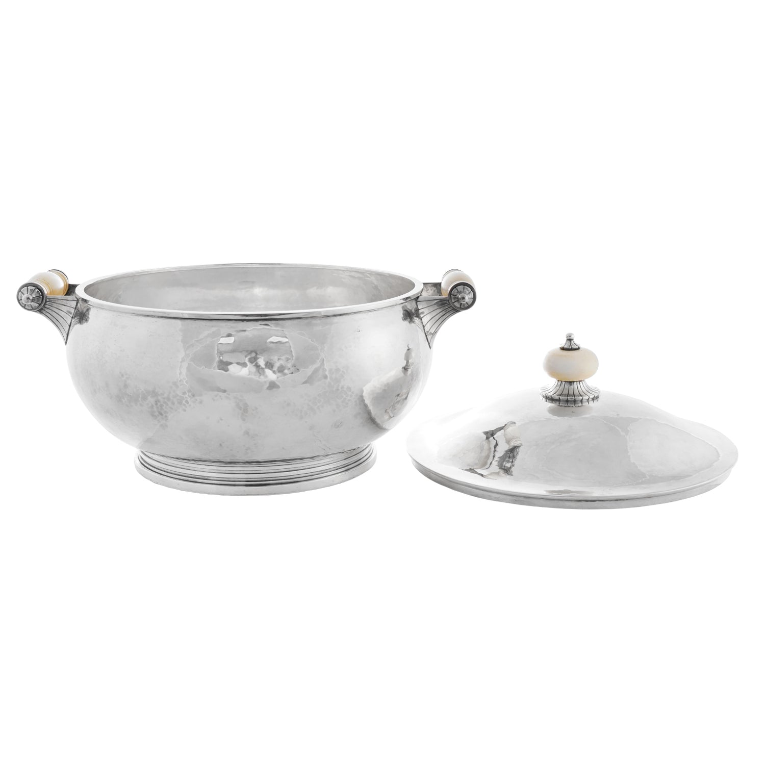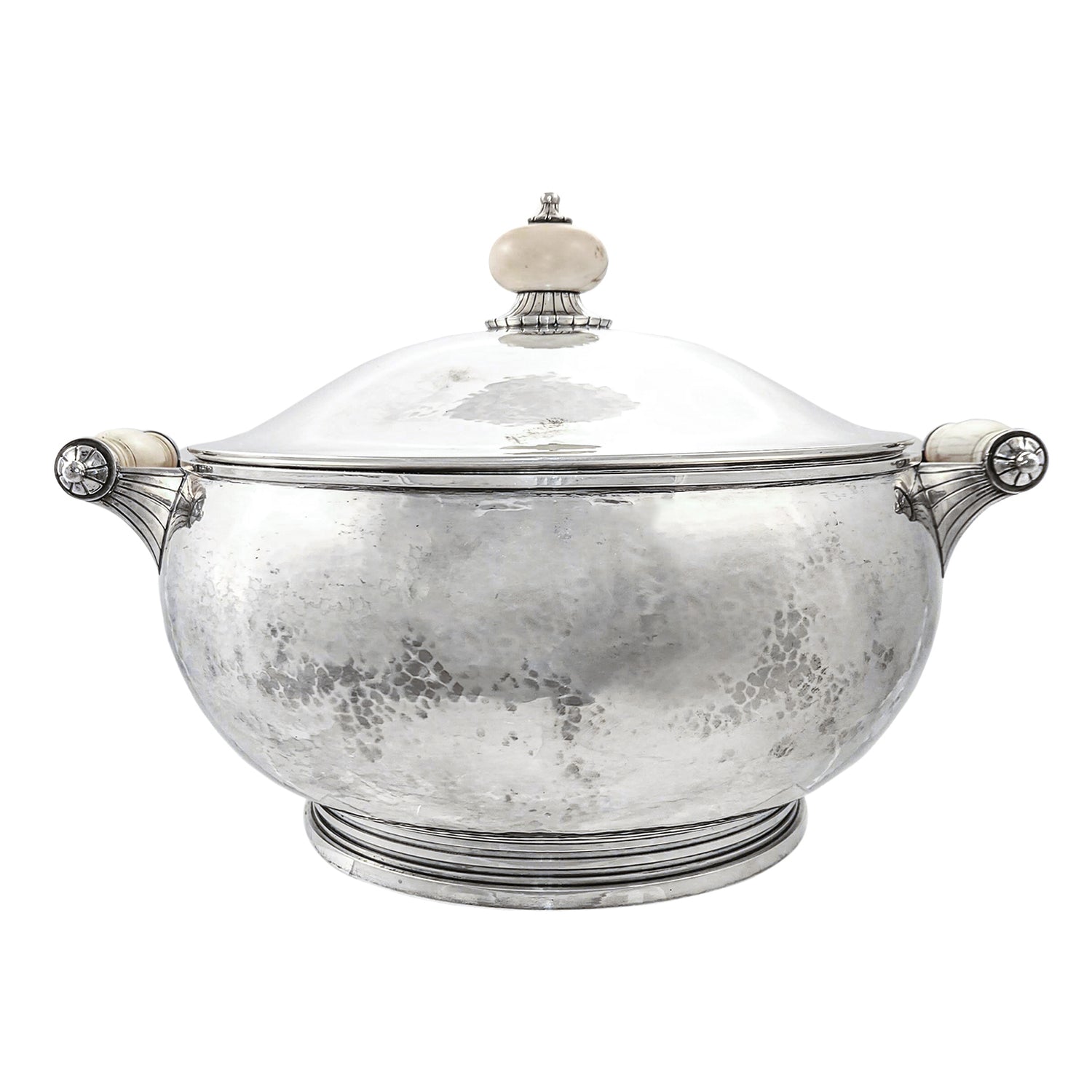 Circa 1950s, Sterling, by C.C. Hermann, Copenhagen, Denmark. Hand hammered, this fabulous covered tureen is an early example of the CC Hermann silversmithy (1949-1992). Displaying a serene form and generous size, it is both functional and decorative, perfect for an understated table setting. Very good condition, with a monogram on the underside noted. Also noted, the handles are of an unknown material, possibly bone, or Hippo tooth.