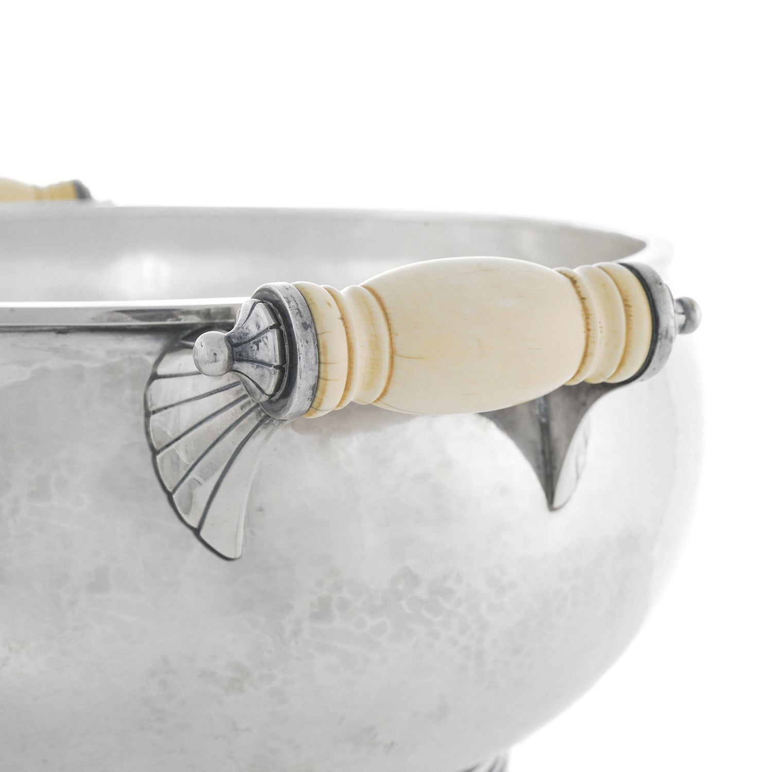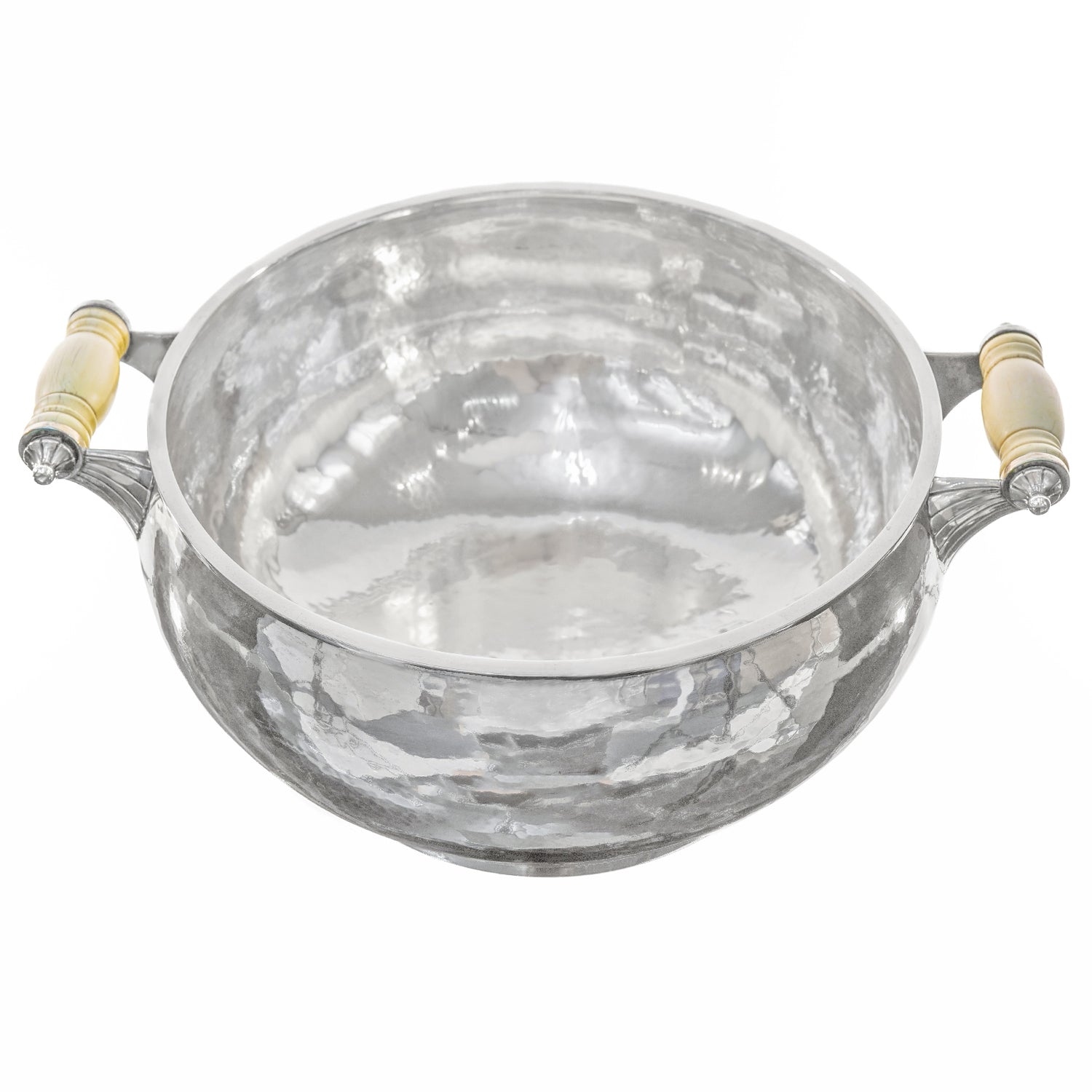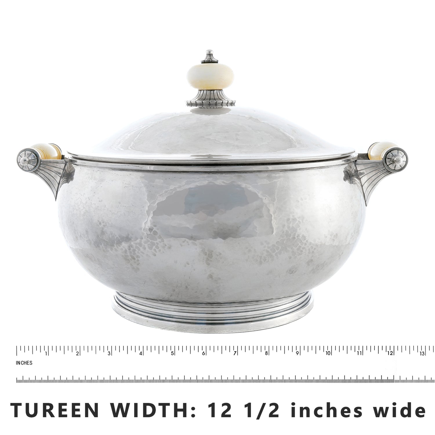 Circa 1950s, Sterling, by C.C. Hermann, Copenhagen, Denmark. Hand hammered, this fabulous covered tureen is an early example of the CC Hermann silversmithy (1949-1992). Displaying a serene form and generous size, it is both functional and decorative, perfect for an understated table setting. Very good condition, with a monogram on the underside noted. Also noted, the handles are of an unknown material, possibly bone, or Hippo tooth.