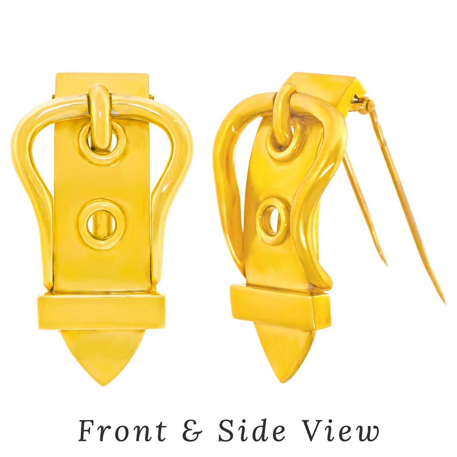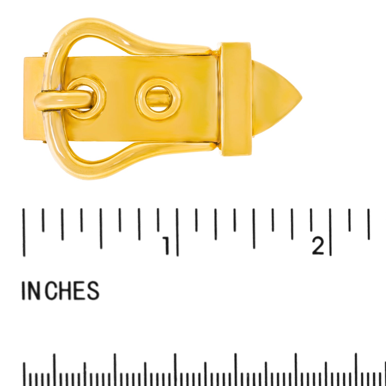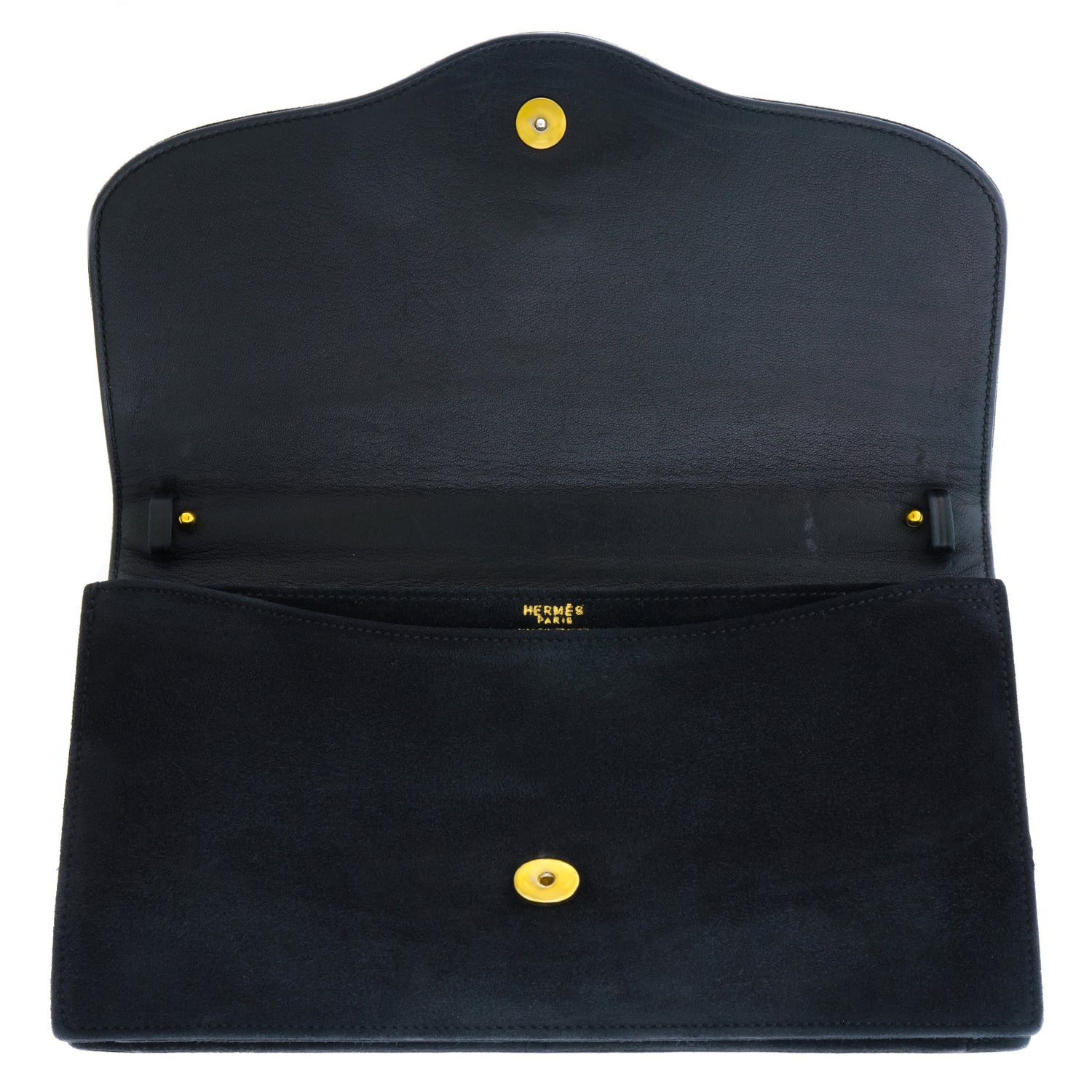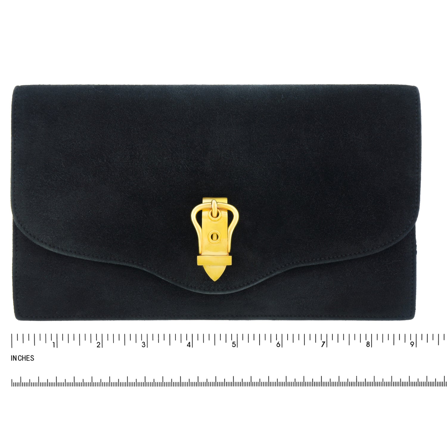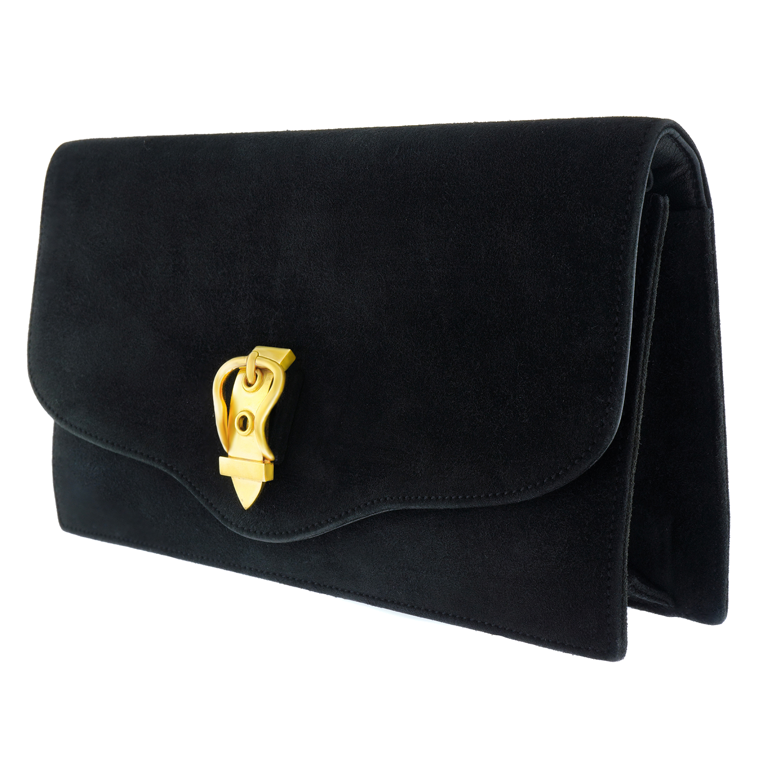 Circa 1975, 18k, by "Hermès, France.   This spectacular Hermès handbag is decorated with a removable 18k yellow gold buckle brooch. Clutch and pin together or buckle pin worn separately, the look is sidewalk-to-catwalk chic!  Excellent condition. The suede retains a slight odor of perfume, this can be mitigated by a leather professional.