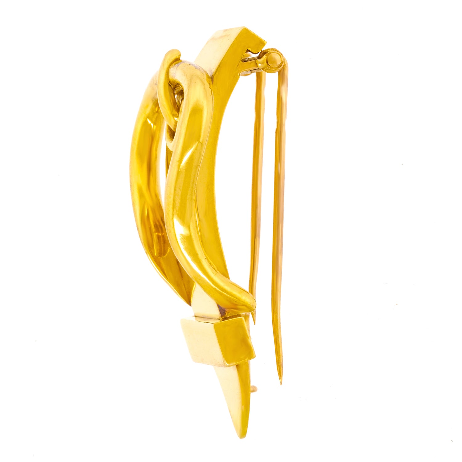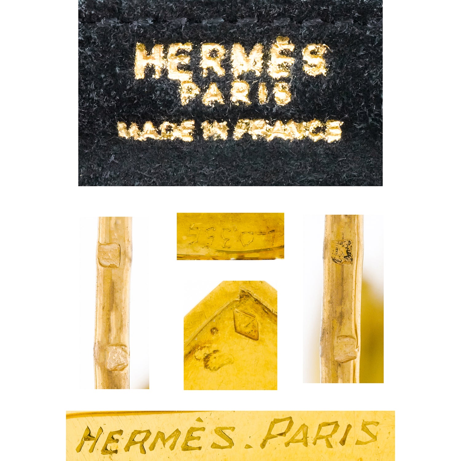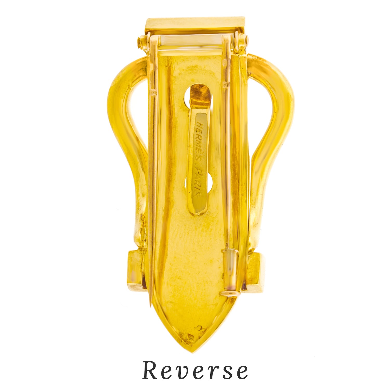 Hallmarks: On brooch, "Hermès , Paris, French eagle heads for 18k, goldsmith's mark and registration number, leather clutch is marked "Hermès , Paris, and Made in France.