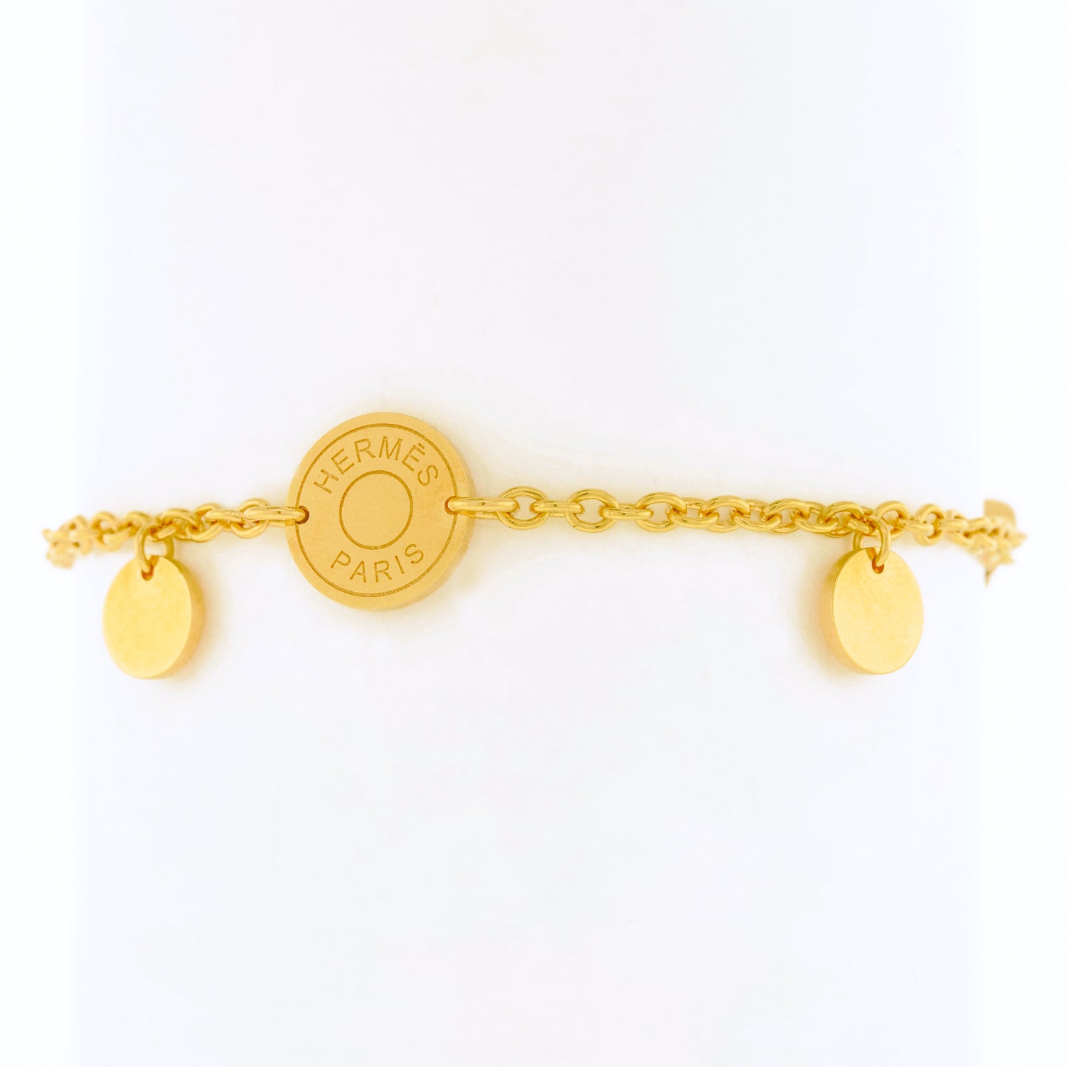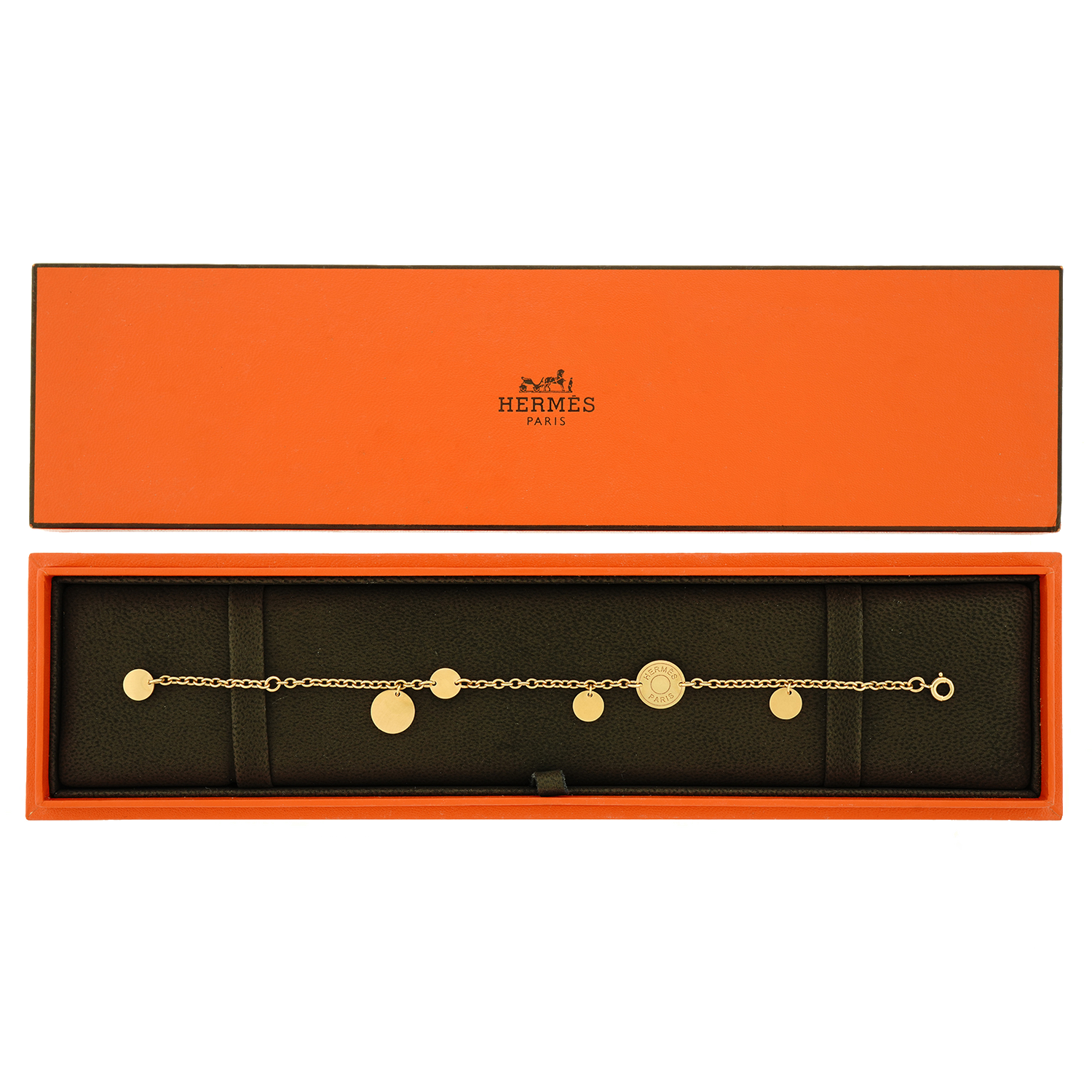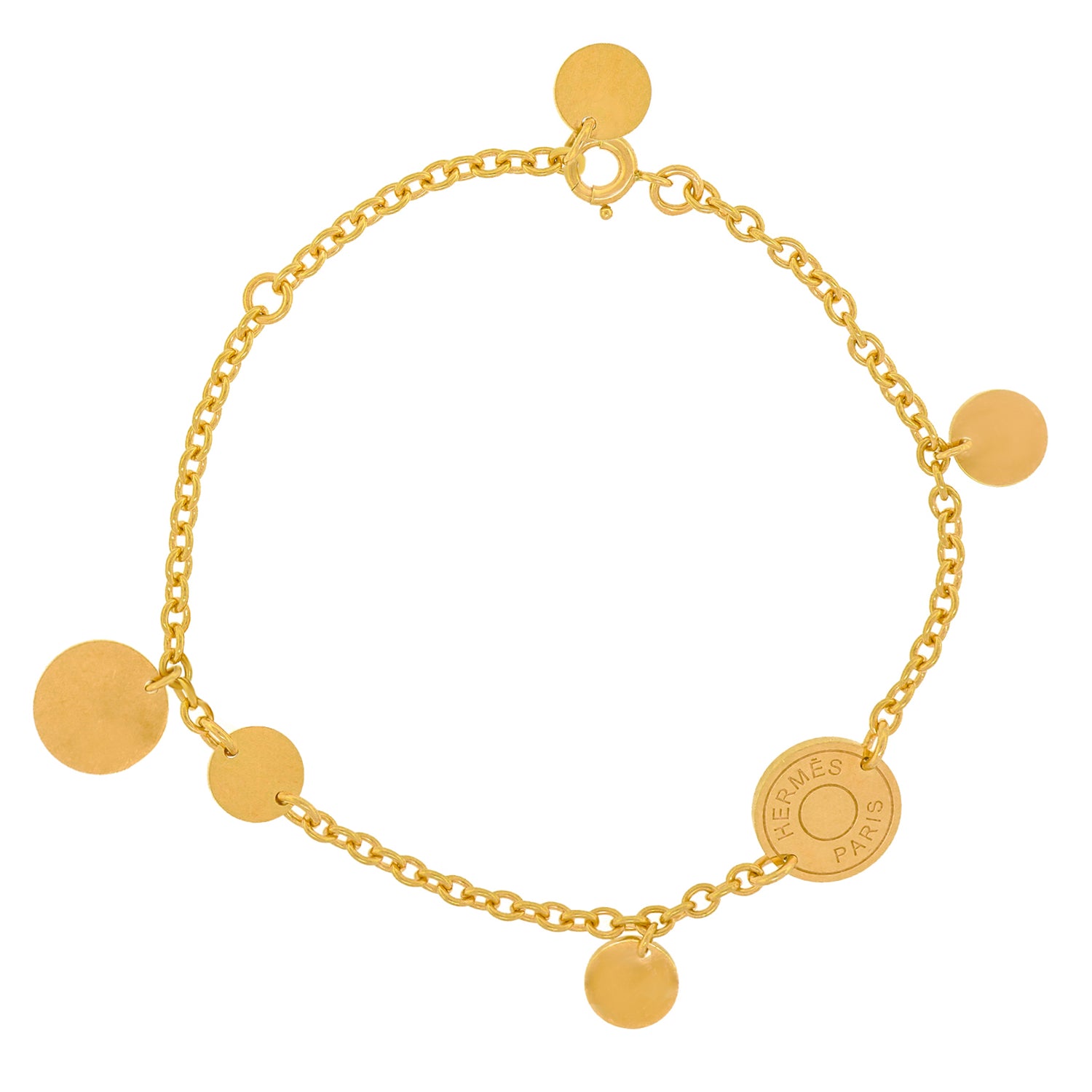 Circa 2000s, 18k, by Hermes, France. Contemporary meets classic in this playful eighteen-karat gold Hermes "confetti" bracelet. Its look is French fashion at its Parisian best. The signed "Clou de Selle" disc element featuring the name of the esteemed house, has adorned every saddle they make for two centuries, (their guarantee of stellar quality). This mark of distinction decorates this bracelet, iconically connecting past and present. Perfect on its own, delightful with a watch, or brilliant with multiples, this bracelet is in excellent condition. Comes in an original Hermes box.