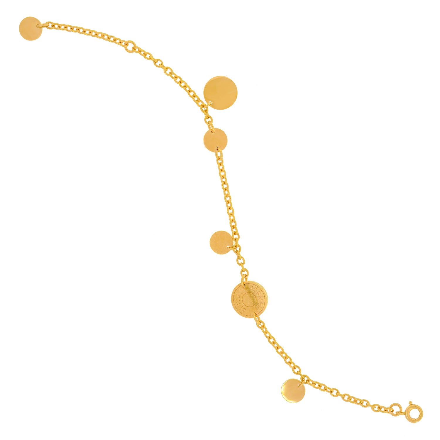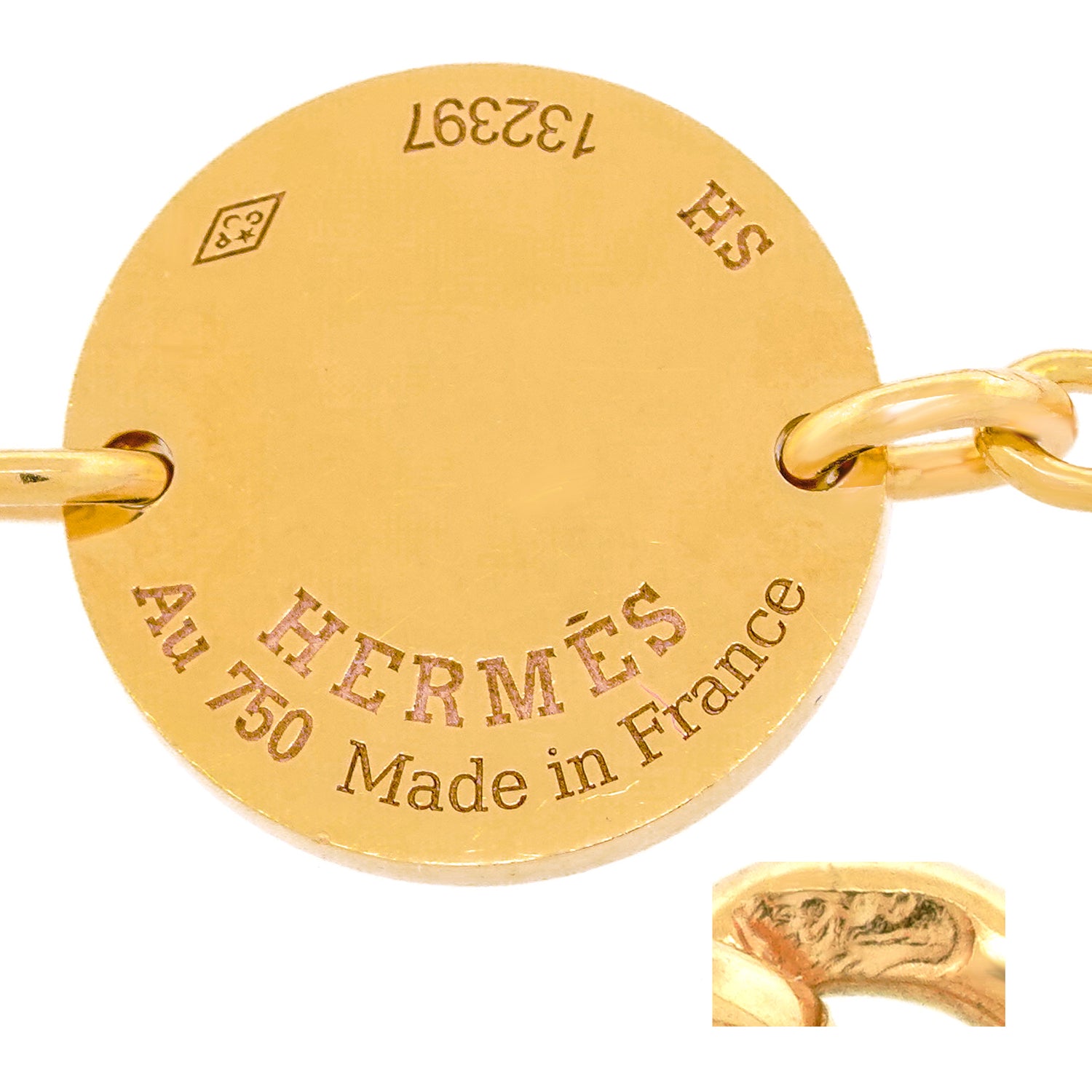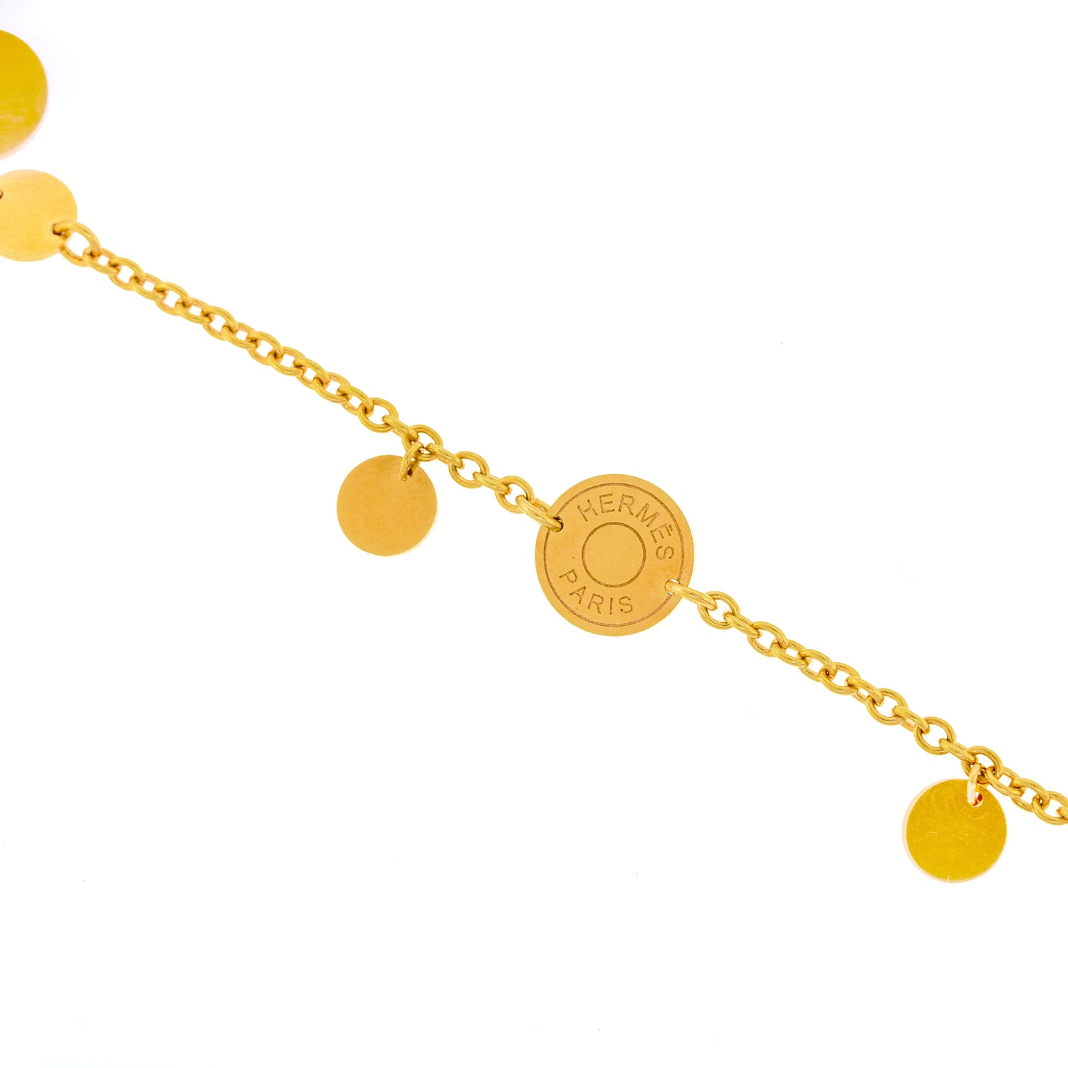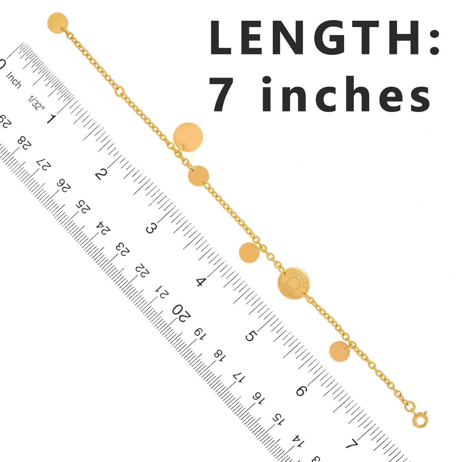 Circa 2000s, 18k, by Hermes, France. Contemporary meets classic in this playful eighteen-karat gold Hermes "confetti" bracelet. Its look is French fashion at its Parisian best. The signed "Clou de Selle" disc element featuring the name of the esteemed house, has adorned every saddle they make for two centuries, (their guarantee of stellar quality). This mark of distinction decorates this bracelet, iconically connecting past and present. Perfect on its own, delightful with a watch, or brilliant with multiples, this bracelet is in excellent condition. Comes in an original Hermes box.
