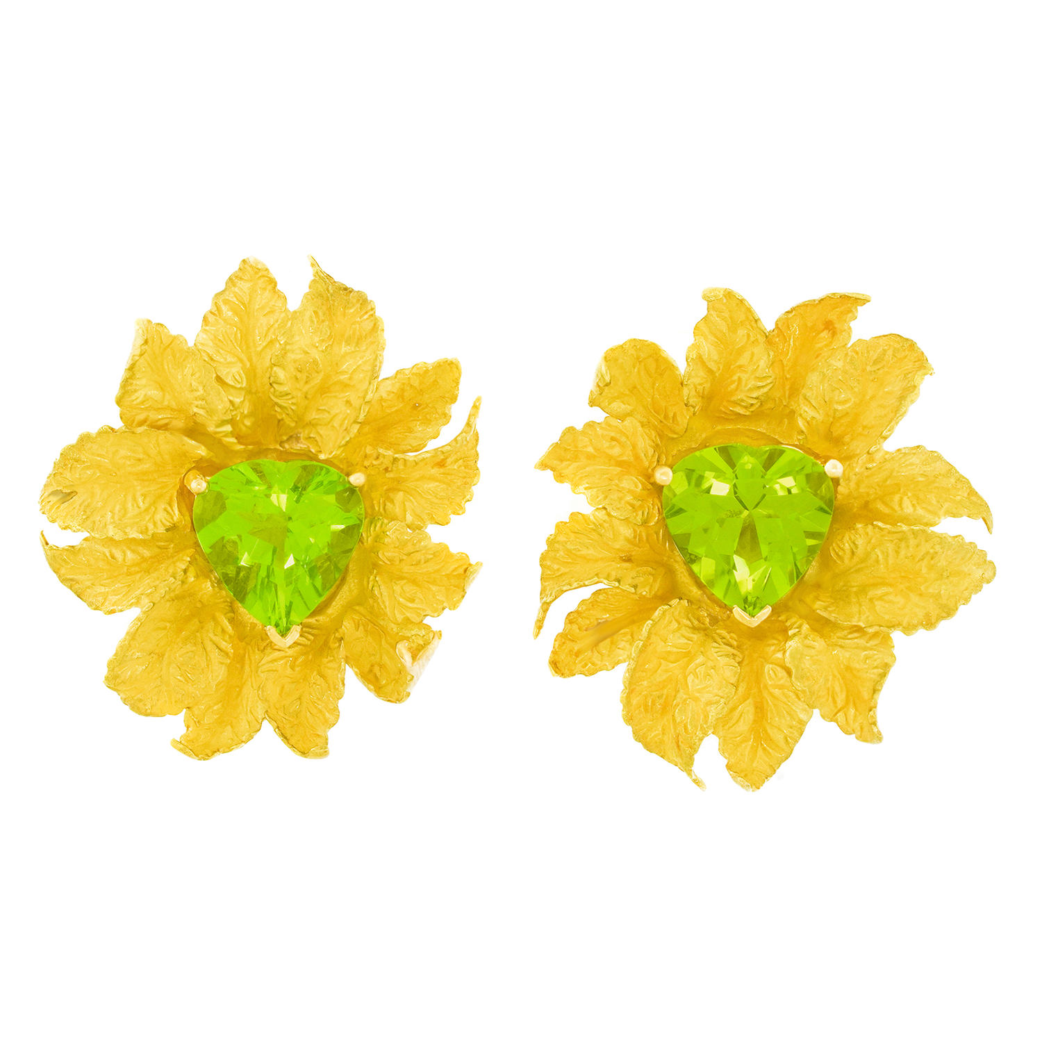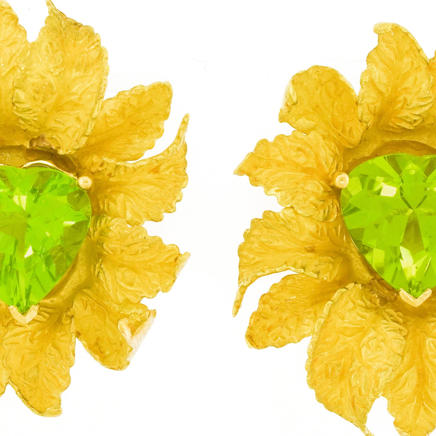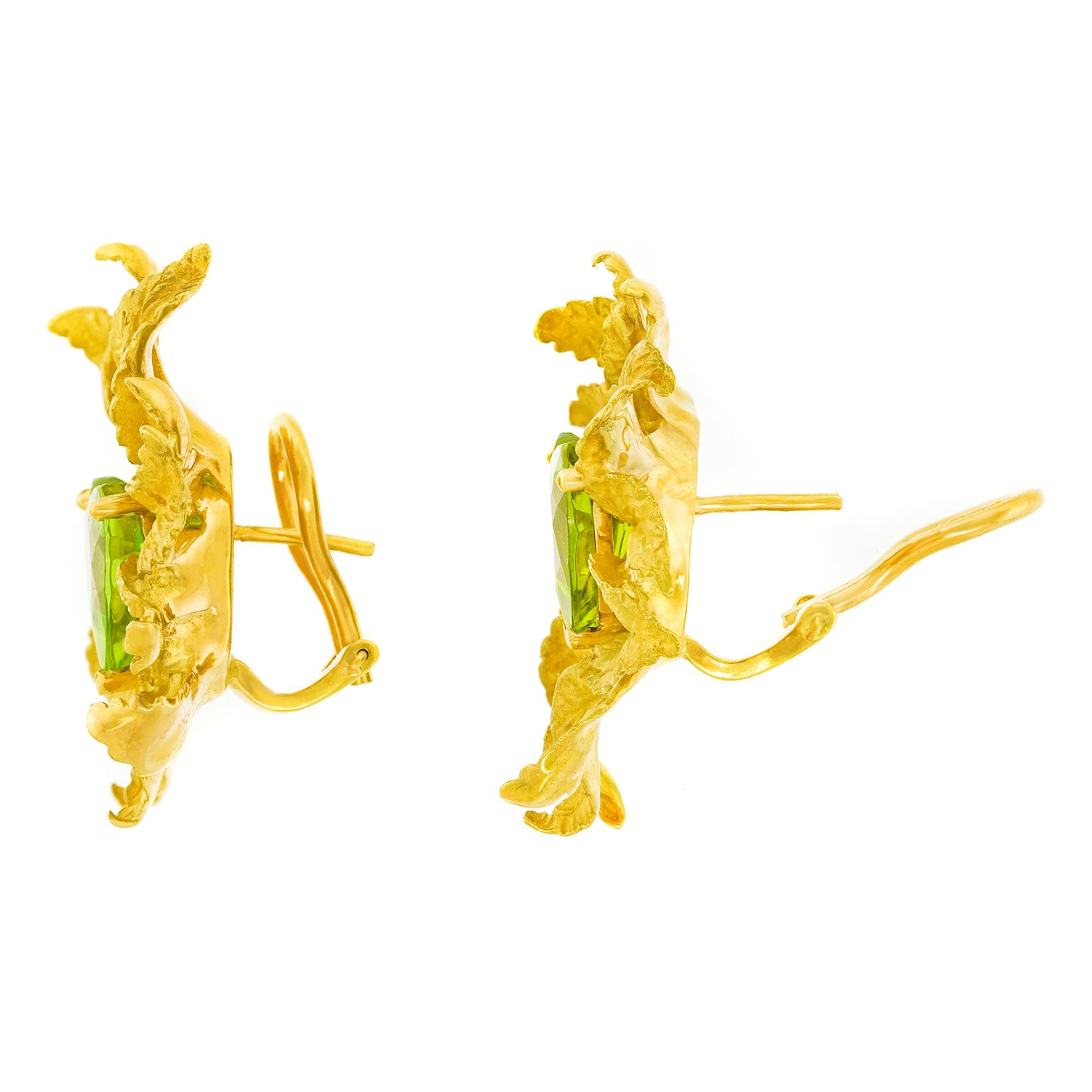 Circa 1980s, 18k, by Hermès, France. These 18k yellow gold and peridot floral earrings are delightfully, brilliantly, Hermès!  Meticulously fabricated, they are in excellent condition. The original earring backs were replaced with more comfortable contemporary ones.