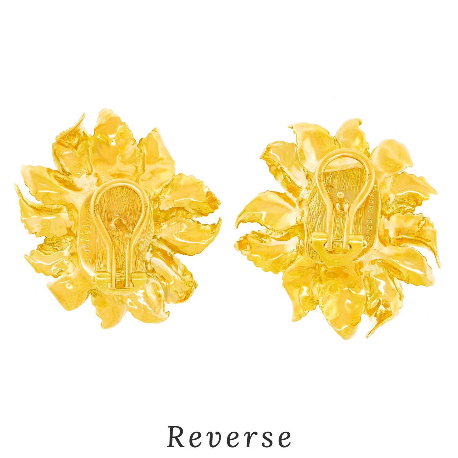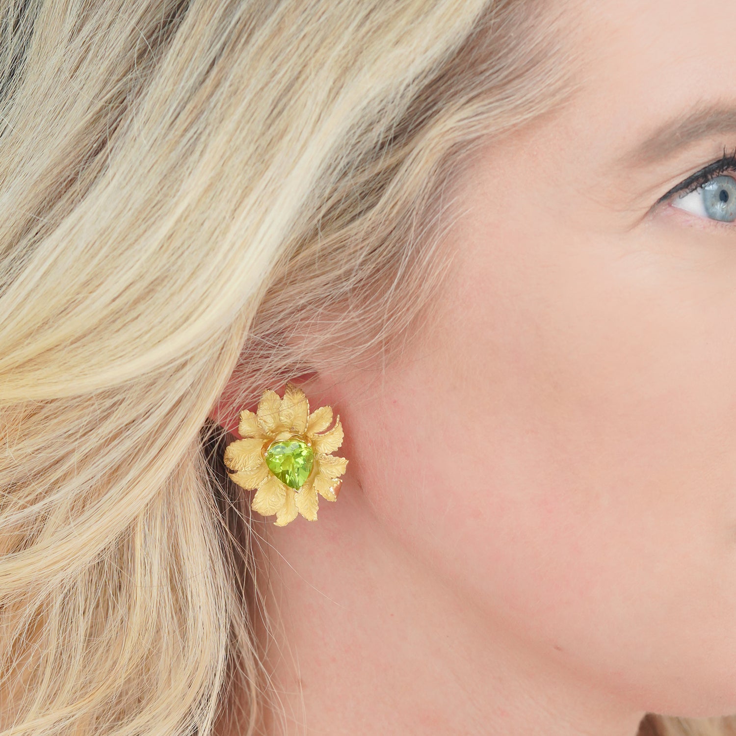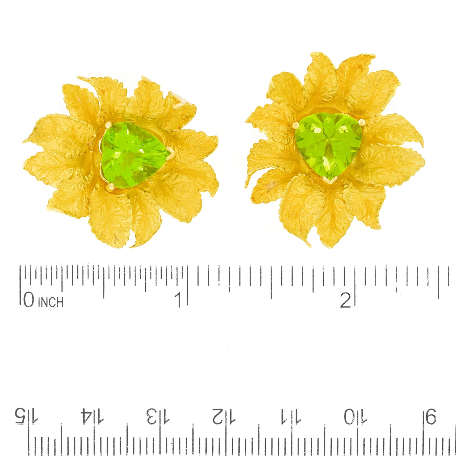 Circa 1980s, 18k, by Hermès, France. These 18k yellow gold and peridot floral earrings are delightfully, brilliantly, Hermès!  Meticulously fabricated, they are in excellent condition. The original earring backs were replaced with more comfortable contemporary ones.