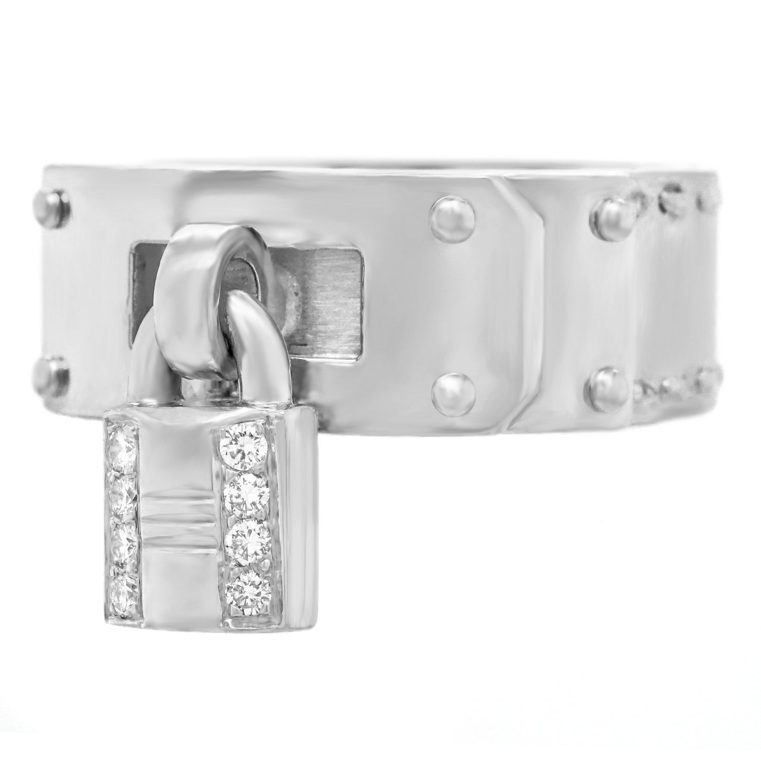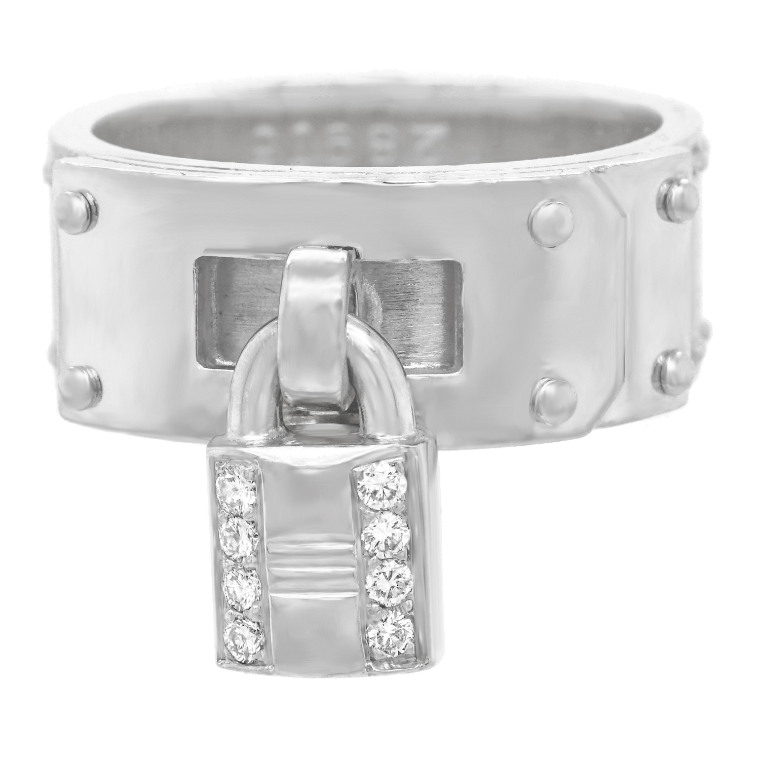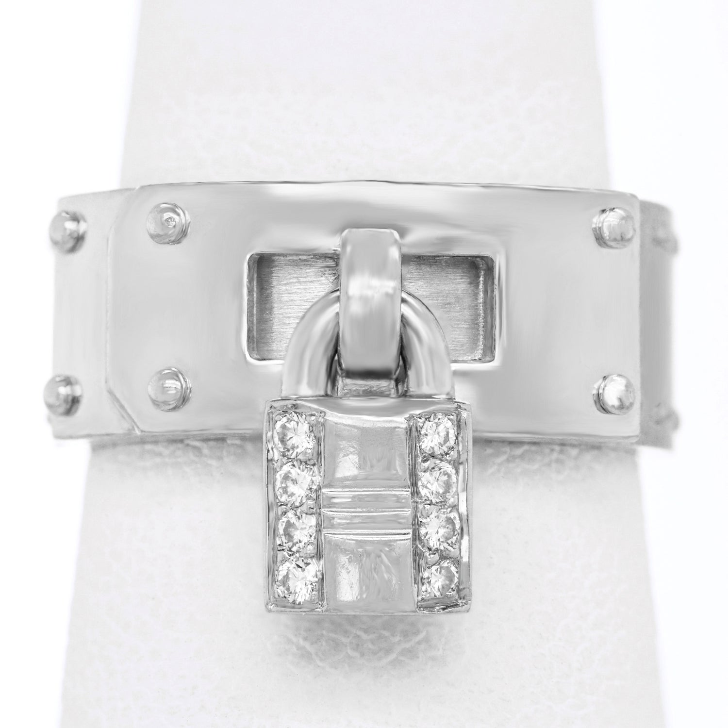 Circa 2000s, 18k, by Hermes, Paris, France. Fabulously French and brilliantly Hermes, this chic 18k ring in their iconic Kelly motif is extra "spiffy" with a diamond-set lock. From the sidewalk to the catwalk, dress it up or down to turn heads everywhere. This ring is well-made and in excellent condition.