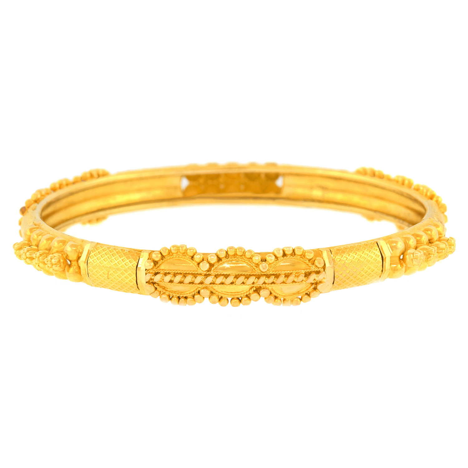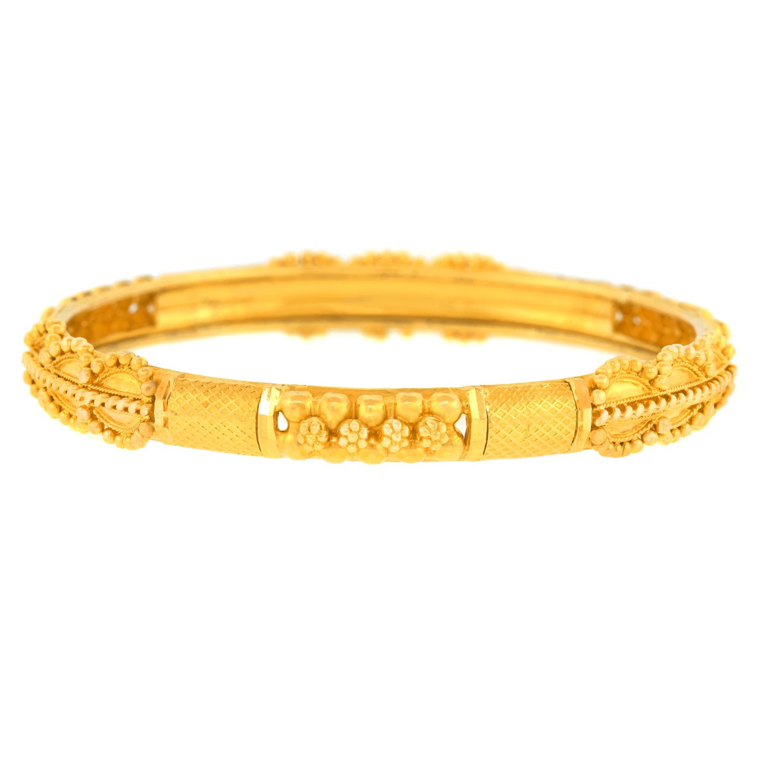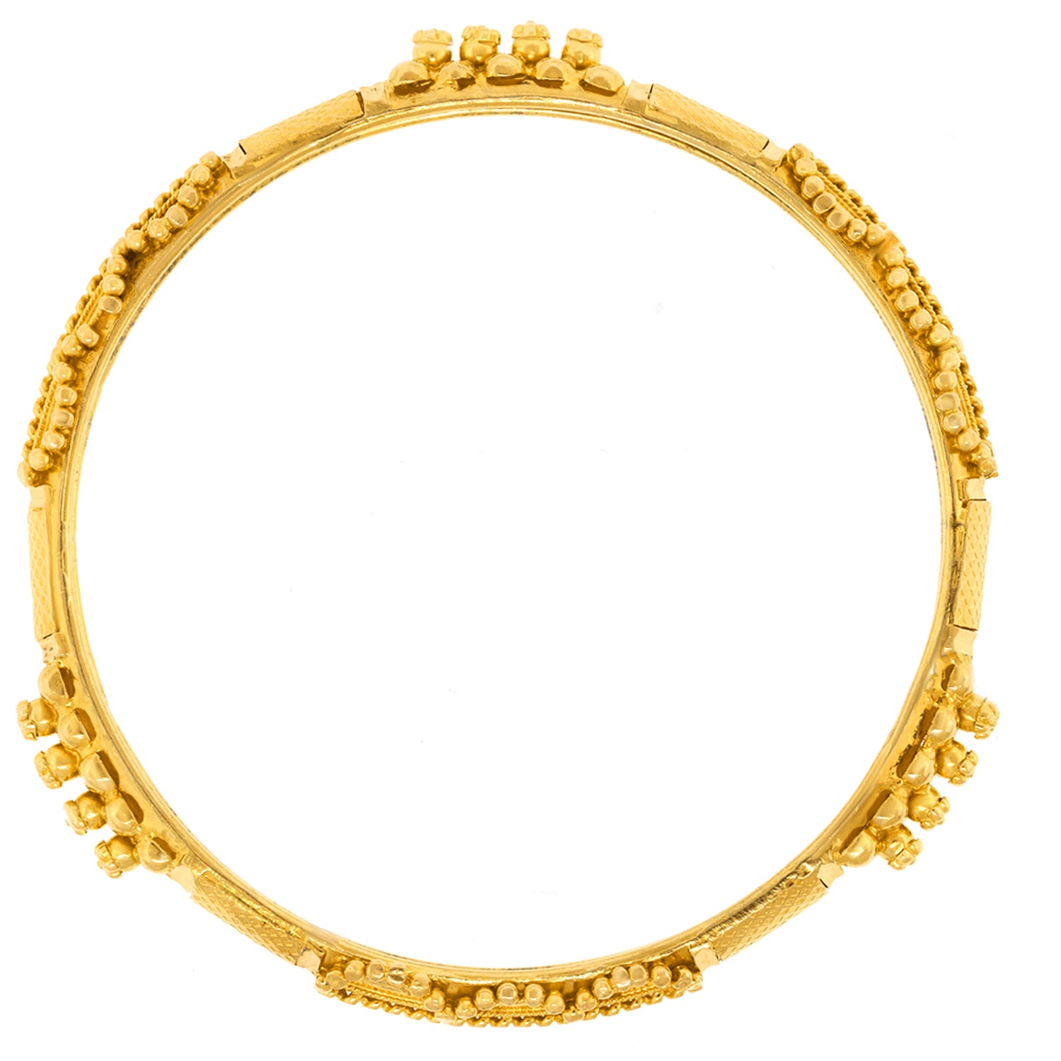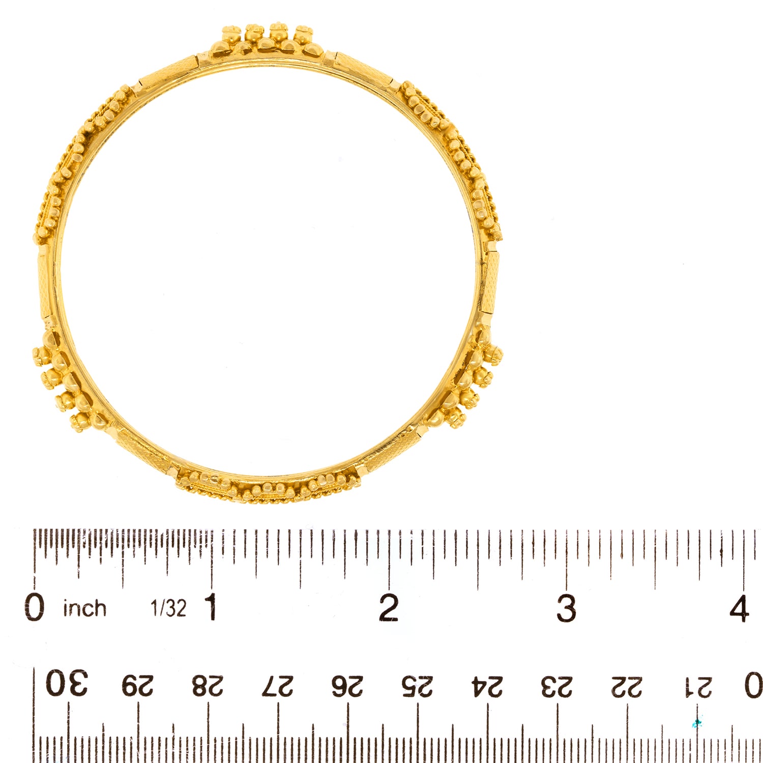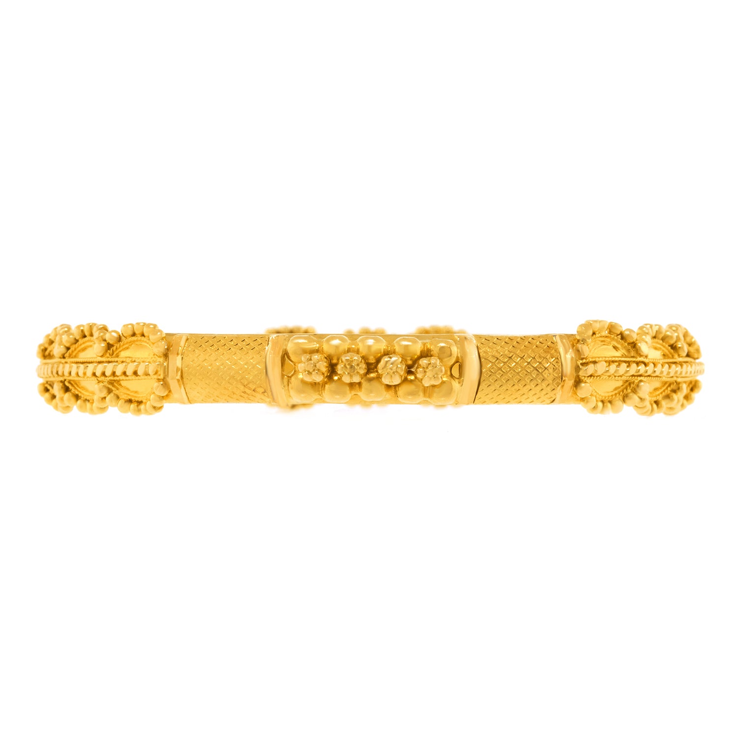 Circa 1950s, 22k, India. This wonderfully detailed, high-karat gold fifties bracelet is hippie chic at its Bohemian best. Fabulous for work or play, it easily dresses up or down. Perfect for stacking, it is well-made, and in excellent condition.