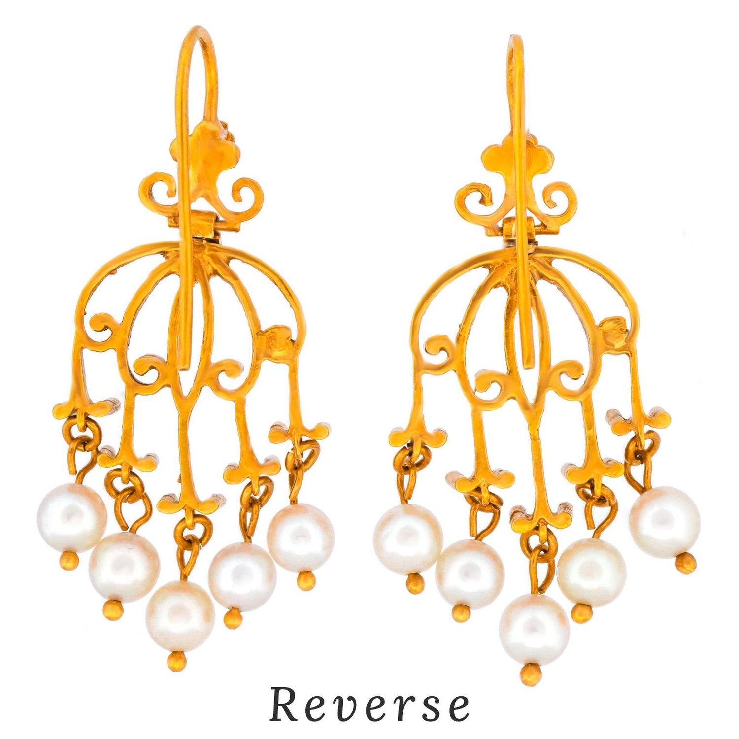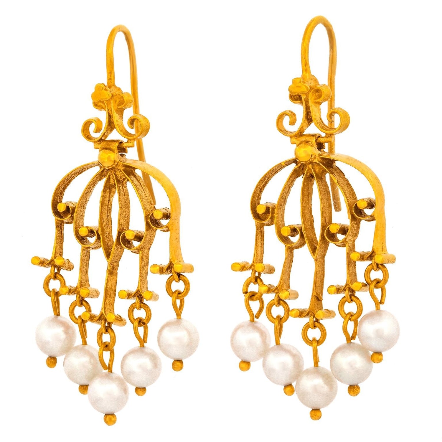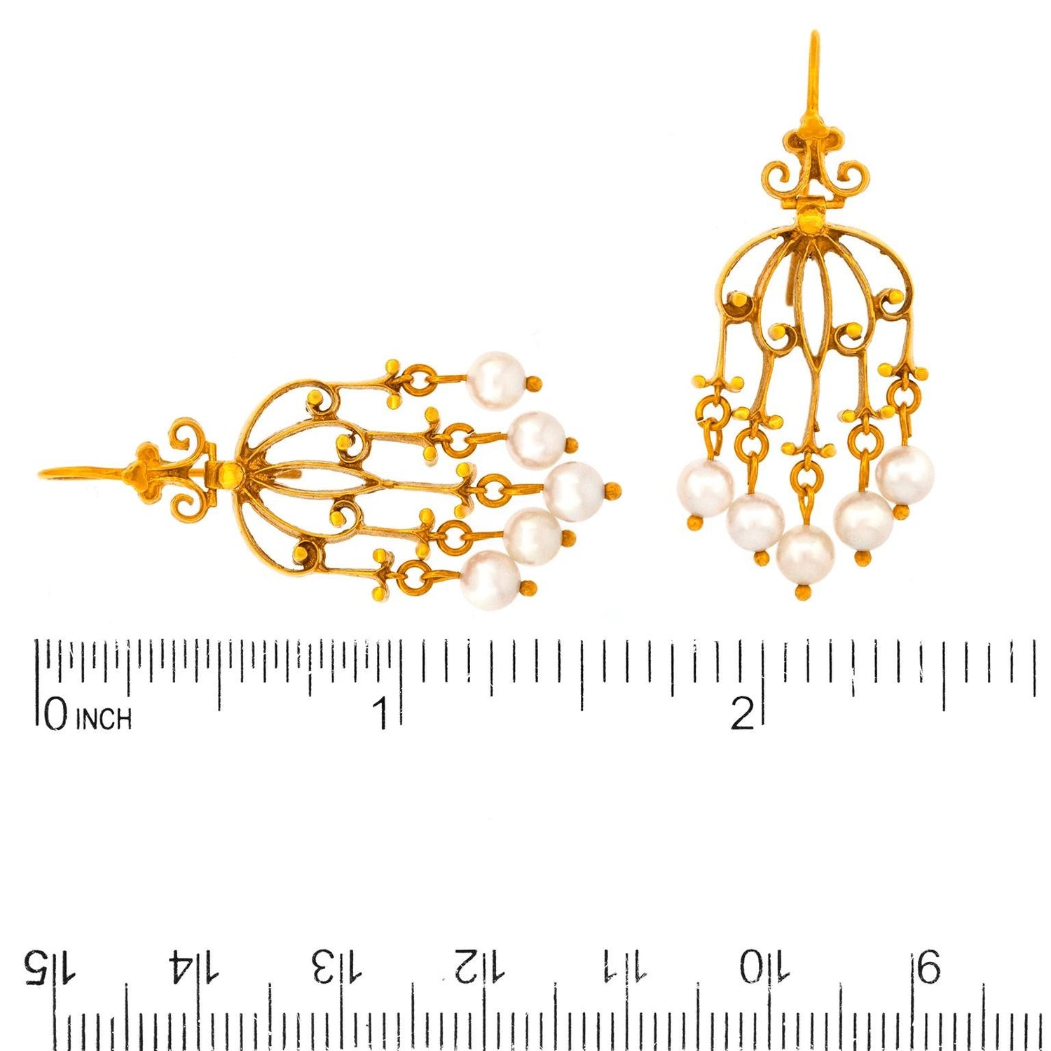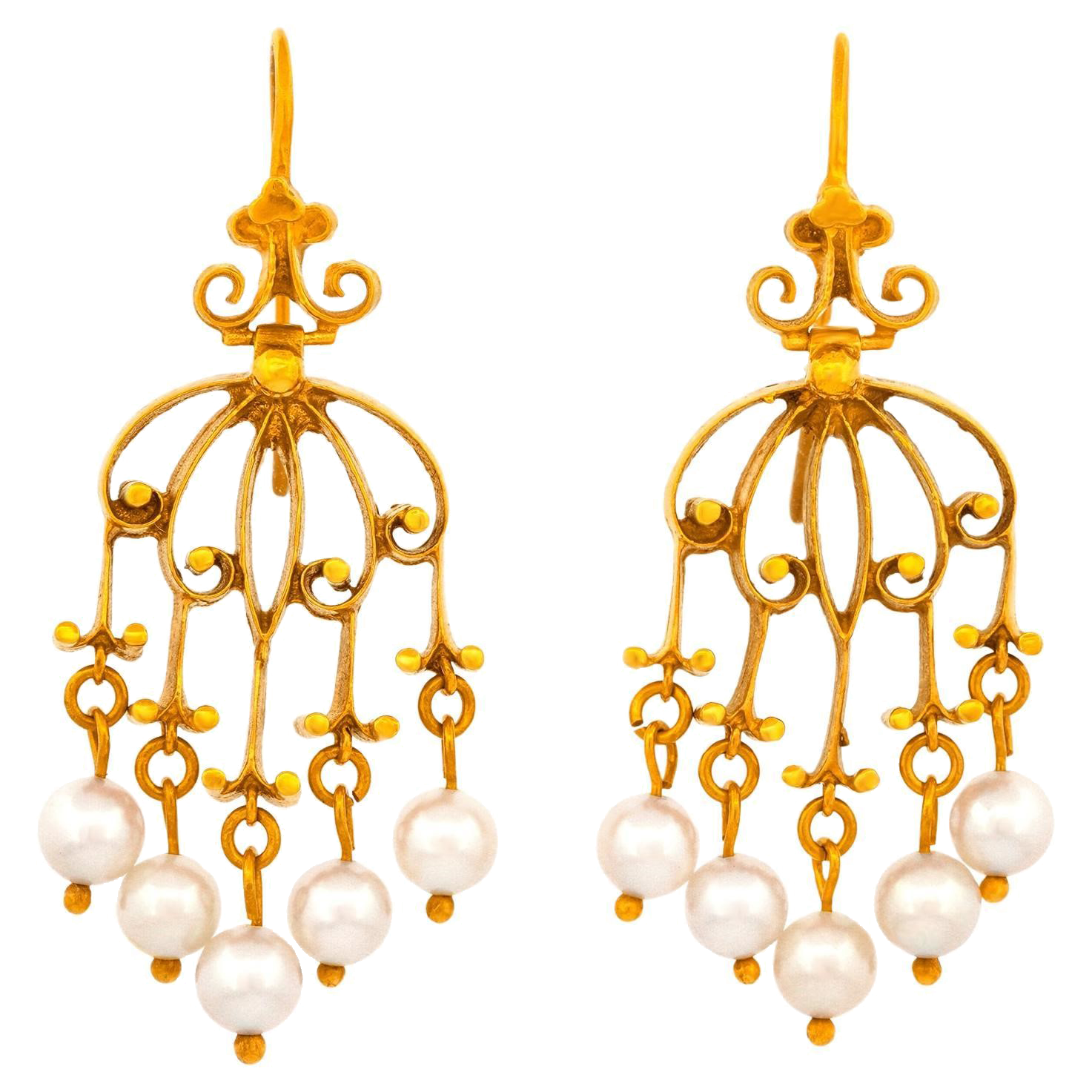Circa 1960s, 14k, American. These playful earrings feature lustrous Akoya pearls festooning a yellow-gold pop art chandelier form. Dressed up or down, on the boardwalk, or at a cocktail party, sixties jewels are vintage chic at its Bohemian best. Comfortable enough to wear all day, they are in excellent condition.