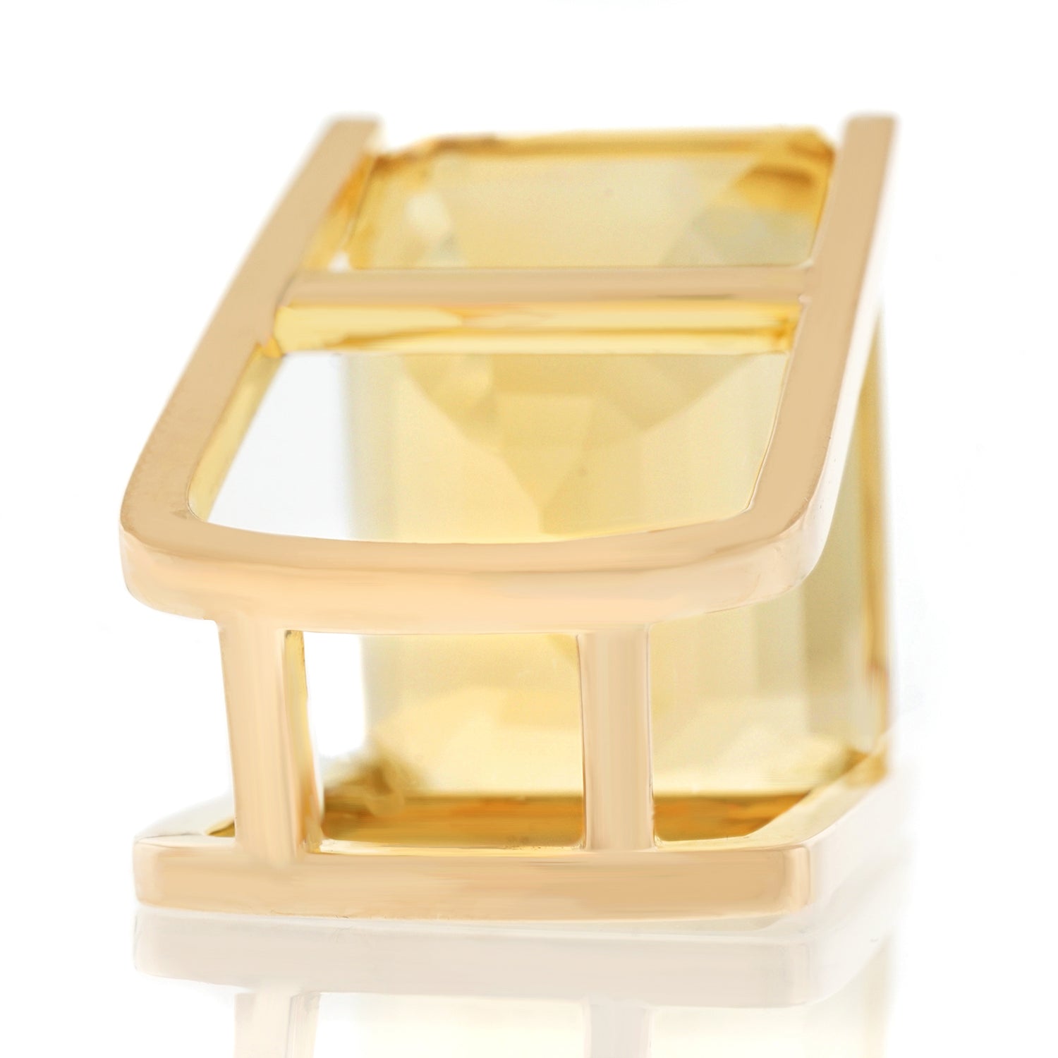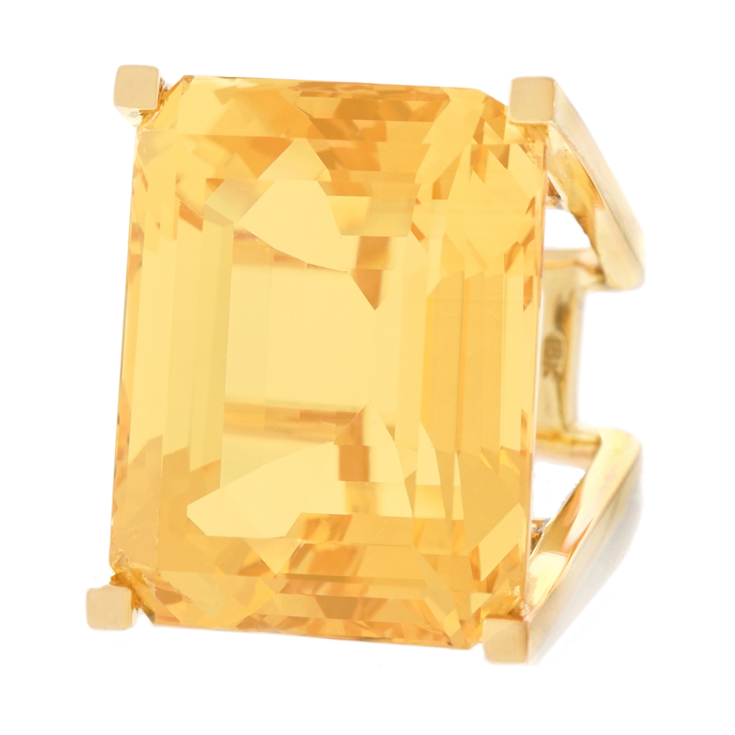 Circa 1970, 18k.   This spectacular ring features a 65 carat citrine in a visionary, modernist setting. Stripped down to the essentials, form and function become one. The vivid, yellow gold, emerald cut citrine is the perfect choice in shape and hue for this mod seventies design. Meticulously fabricated in 18k yellow gold, it is in excellent condition.