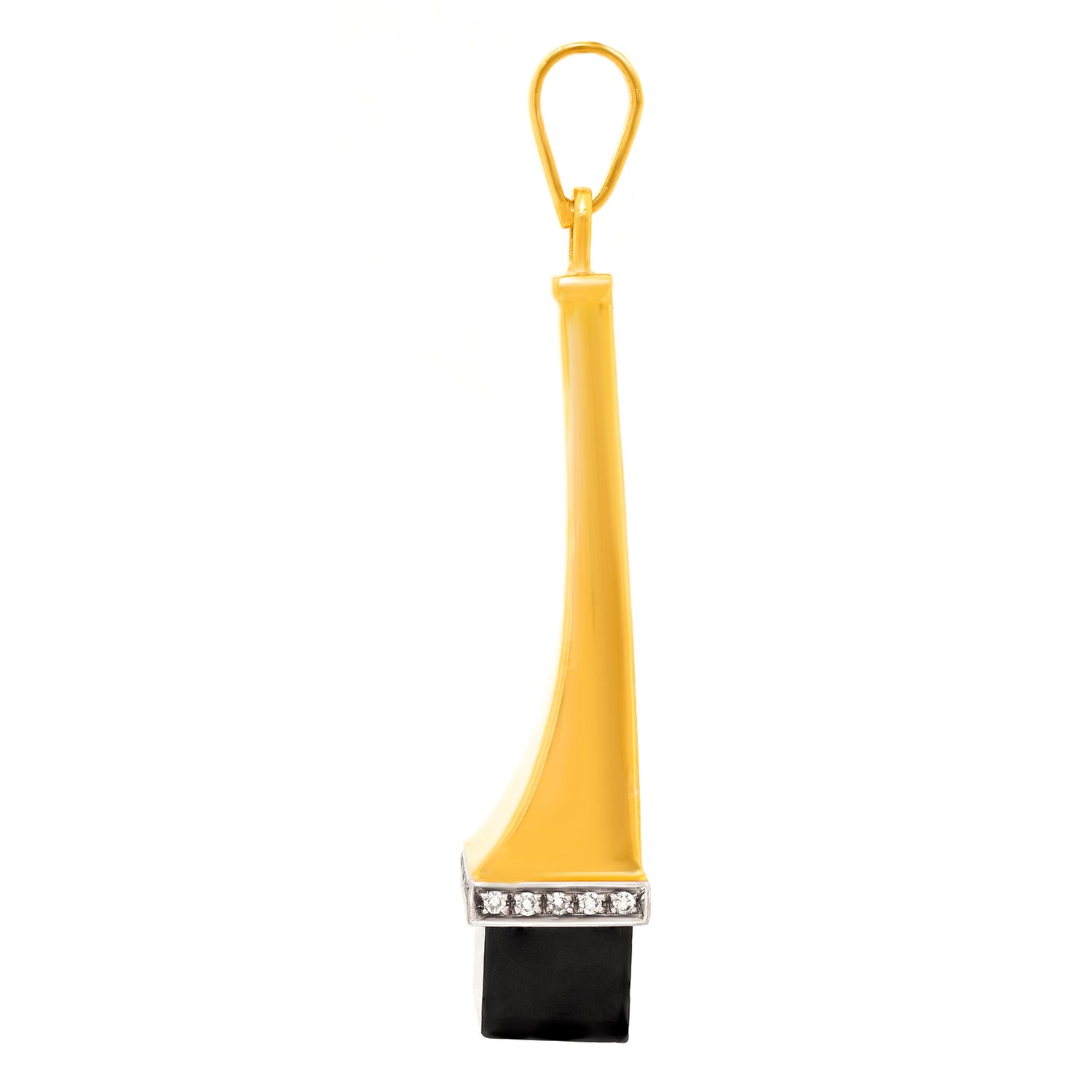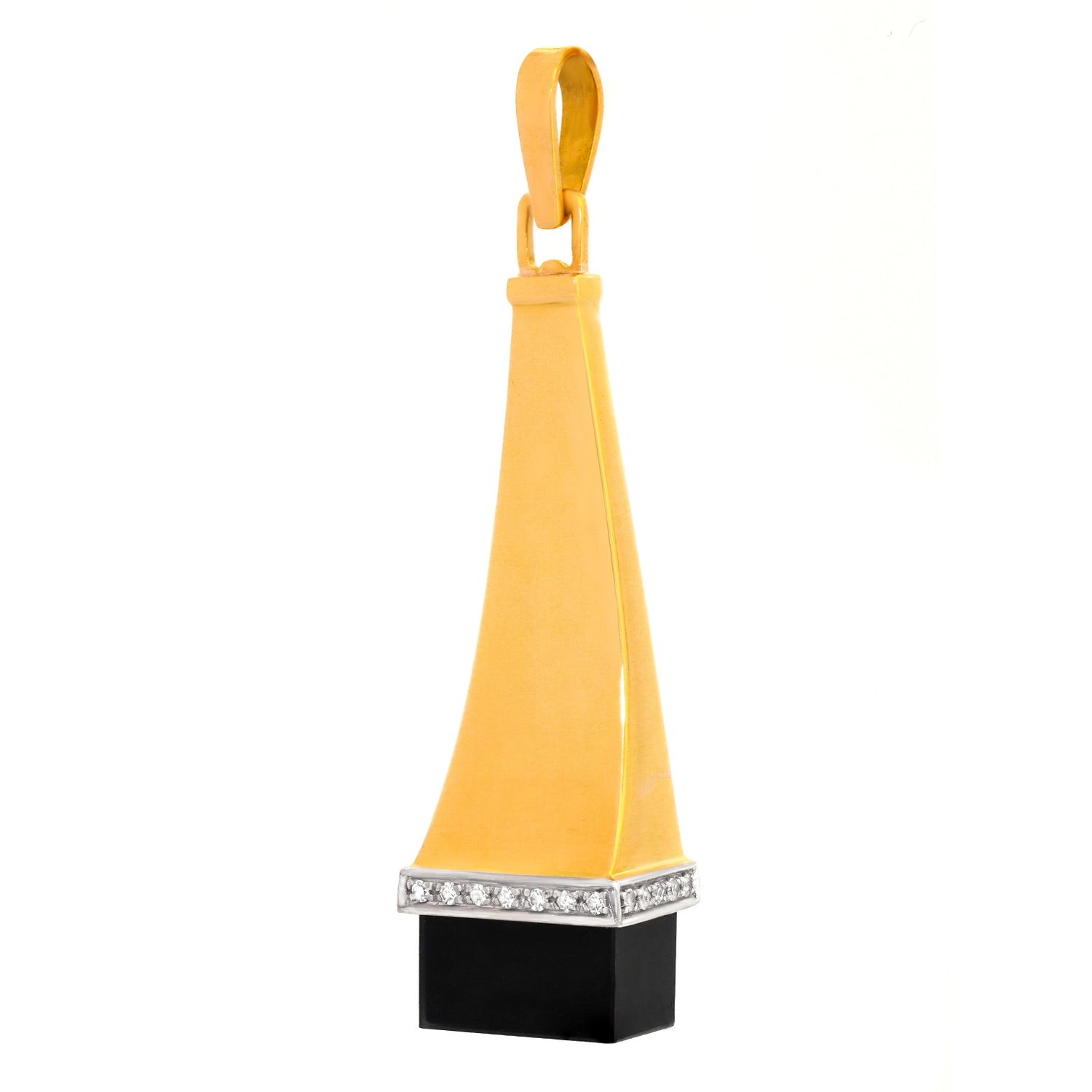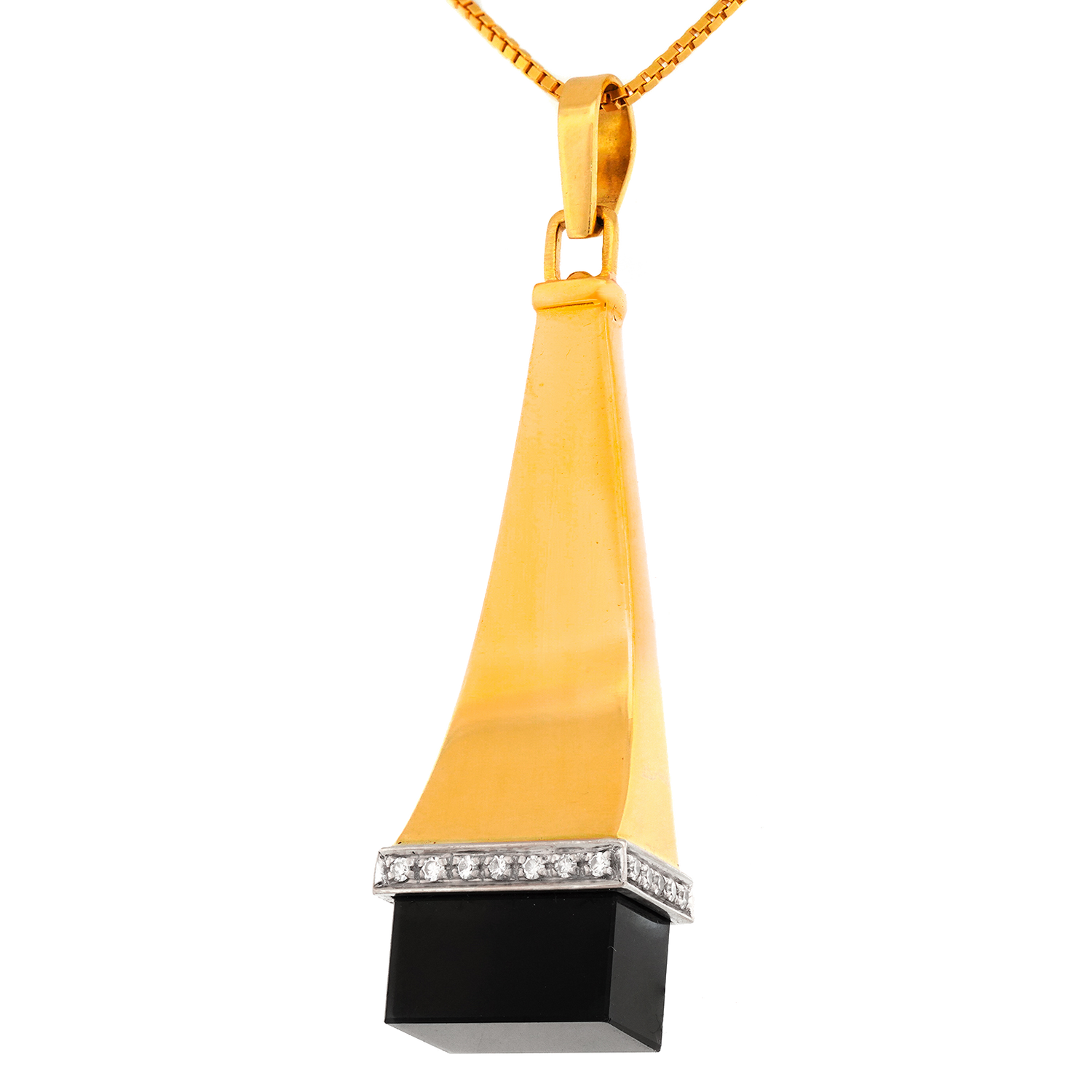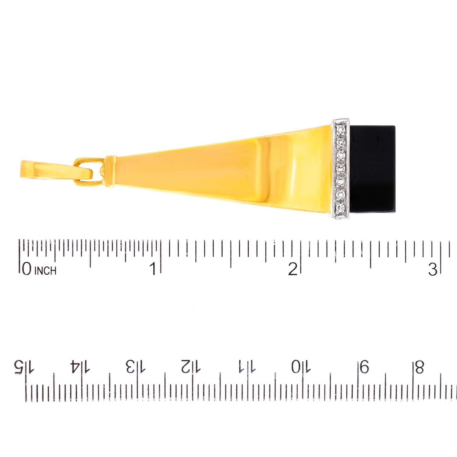 Circa 1960s, 18k, Italy. This sleek modernist pendant has a major Italian design cool factor. Its sleek wow sixties form is underscored by a crisp black onyx and sparkly diamonds combined with yellow gold. The look is elegant visual drama. Perfect with all black or white! Finely crafted in the 1960s, this pendant is in excellent condition.