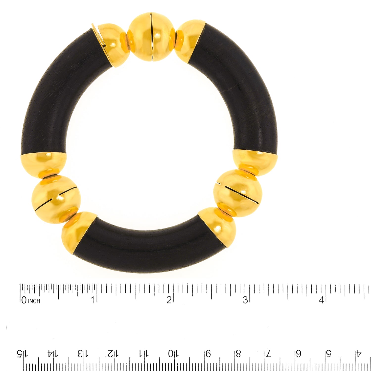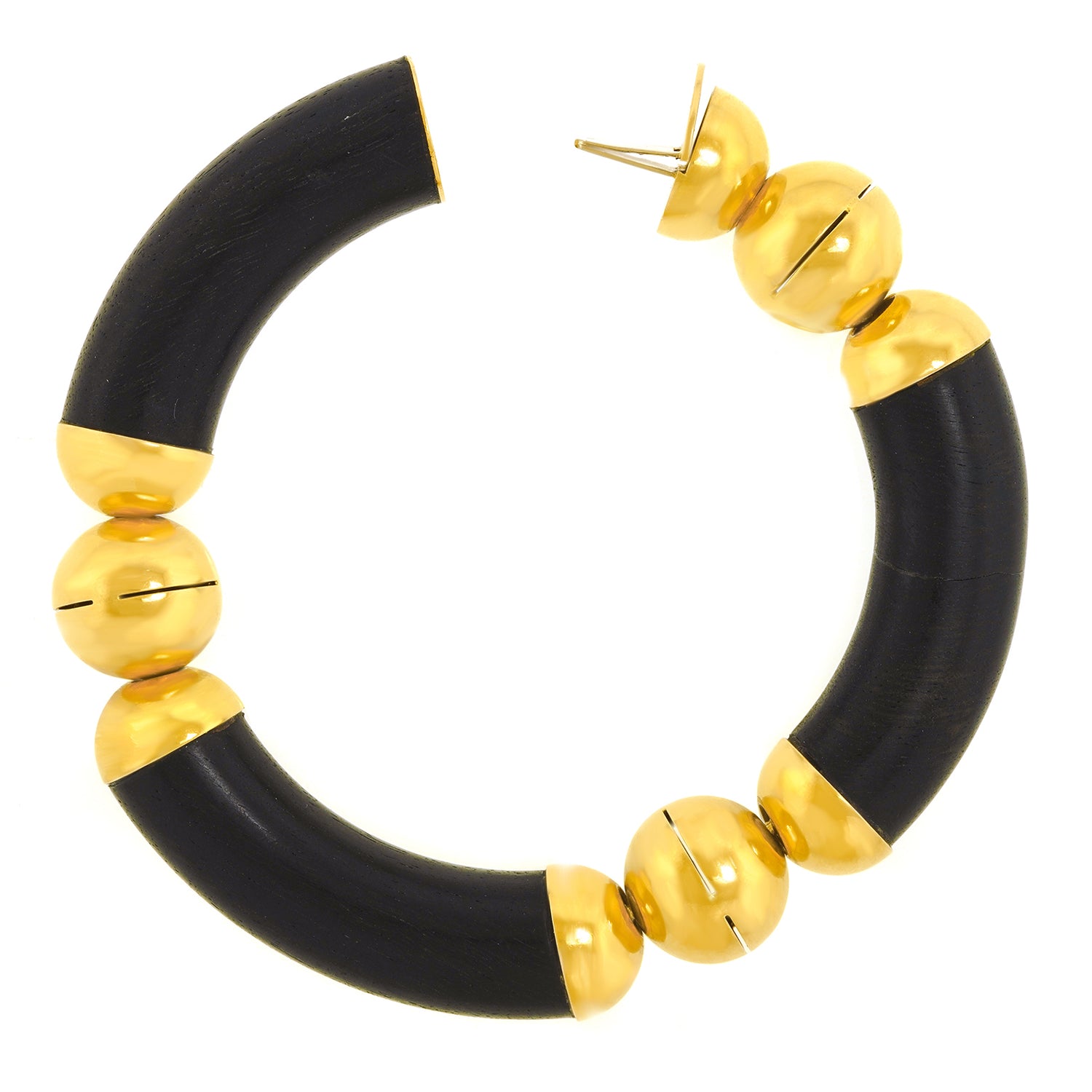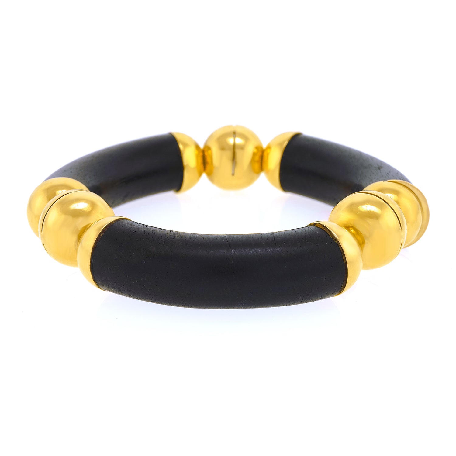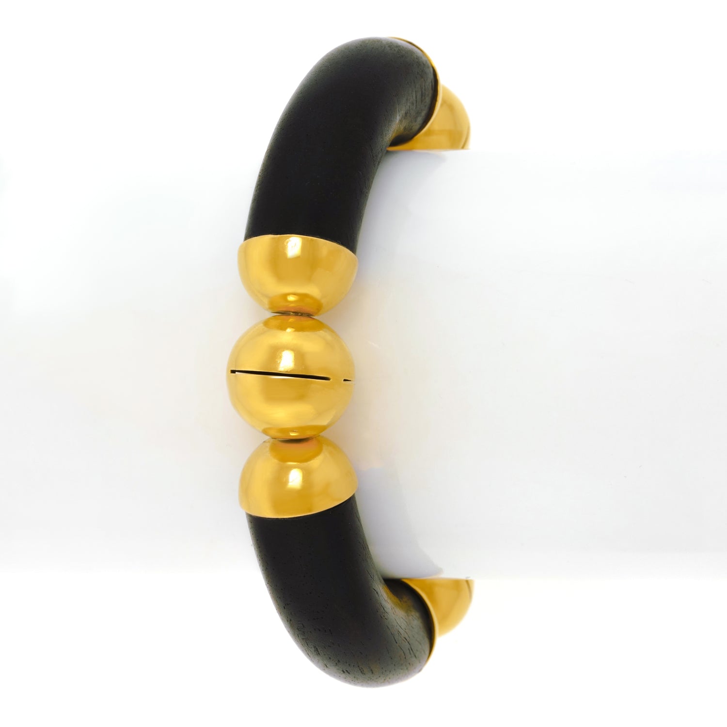 Circa 1960s, 18k, by Paul Binder, Zurich, Switzerland. Visually arresting, this Swiss modern bracelet is about contrasting shapes and textures. Bifurcated orbs of gold are interspersed with deeply-hued gold-mounted ebony. This bracelet has an edgy vibrancy underscored by an effortless sense of fashion. The look is fresh and bold, a very wearable piece of sixties Art Jewelry. Meticulously made by Paul Binder of Zurich, it is in good condition with an earlier repair to one wood link (not obvious, we could easily replace the ebony with new matching but opted to keep the original.).