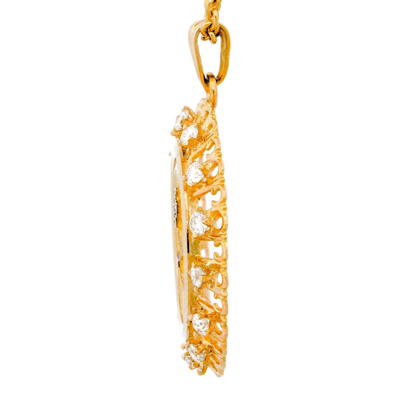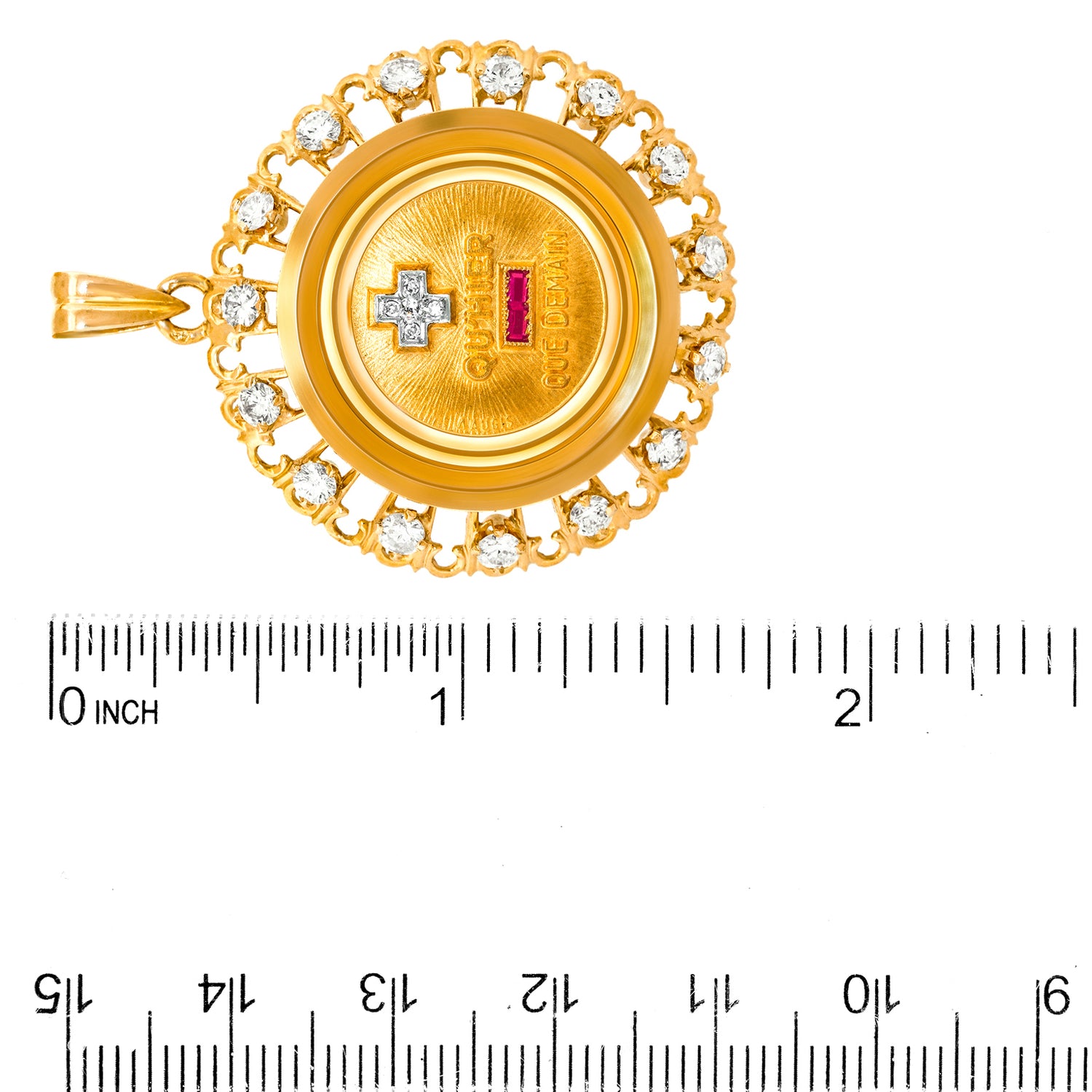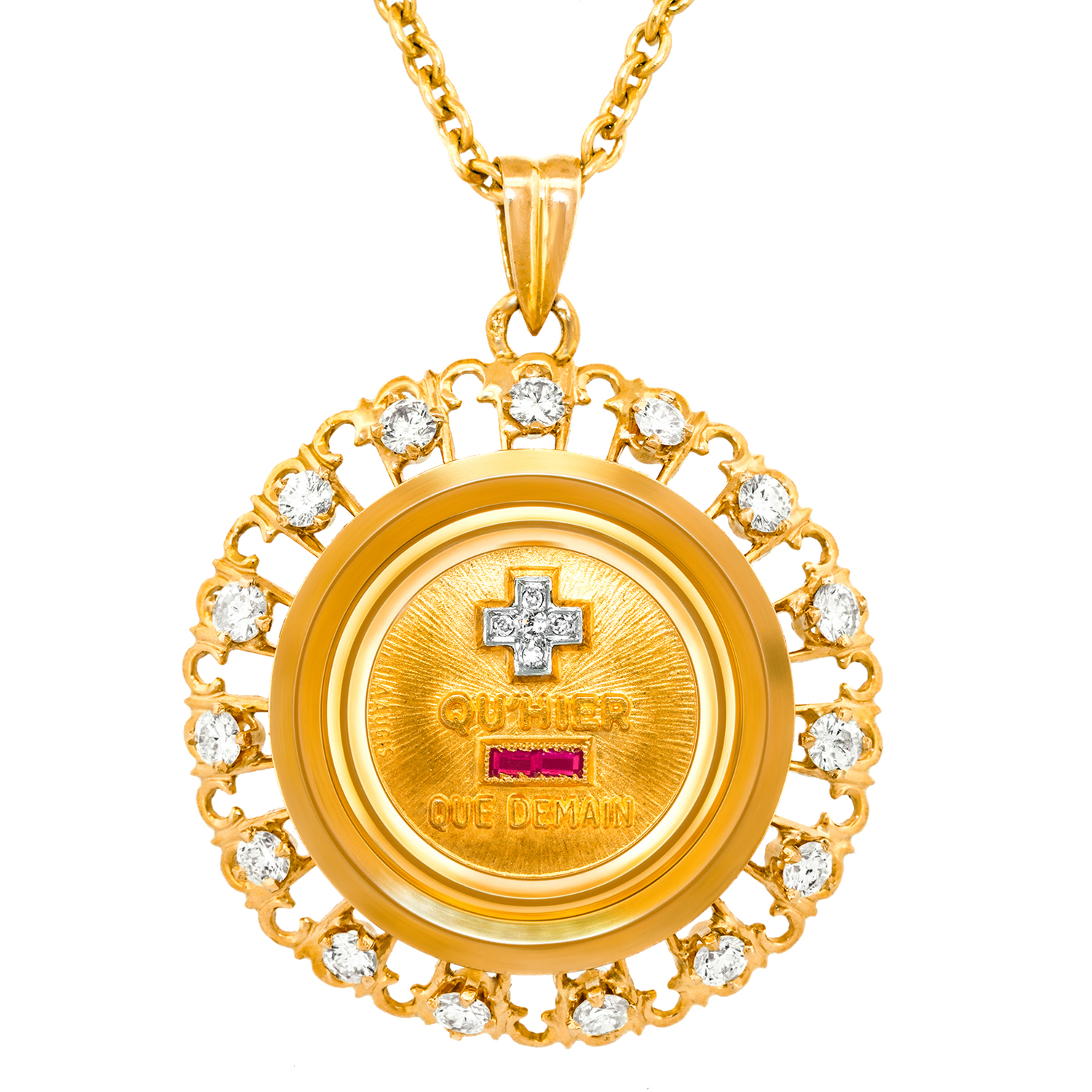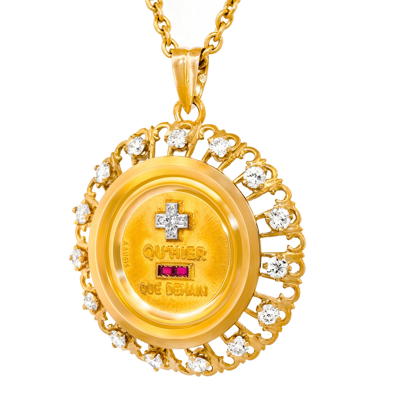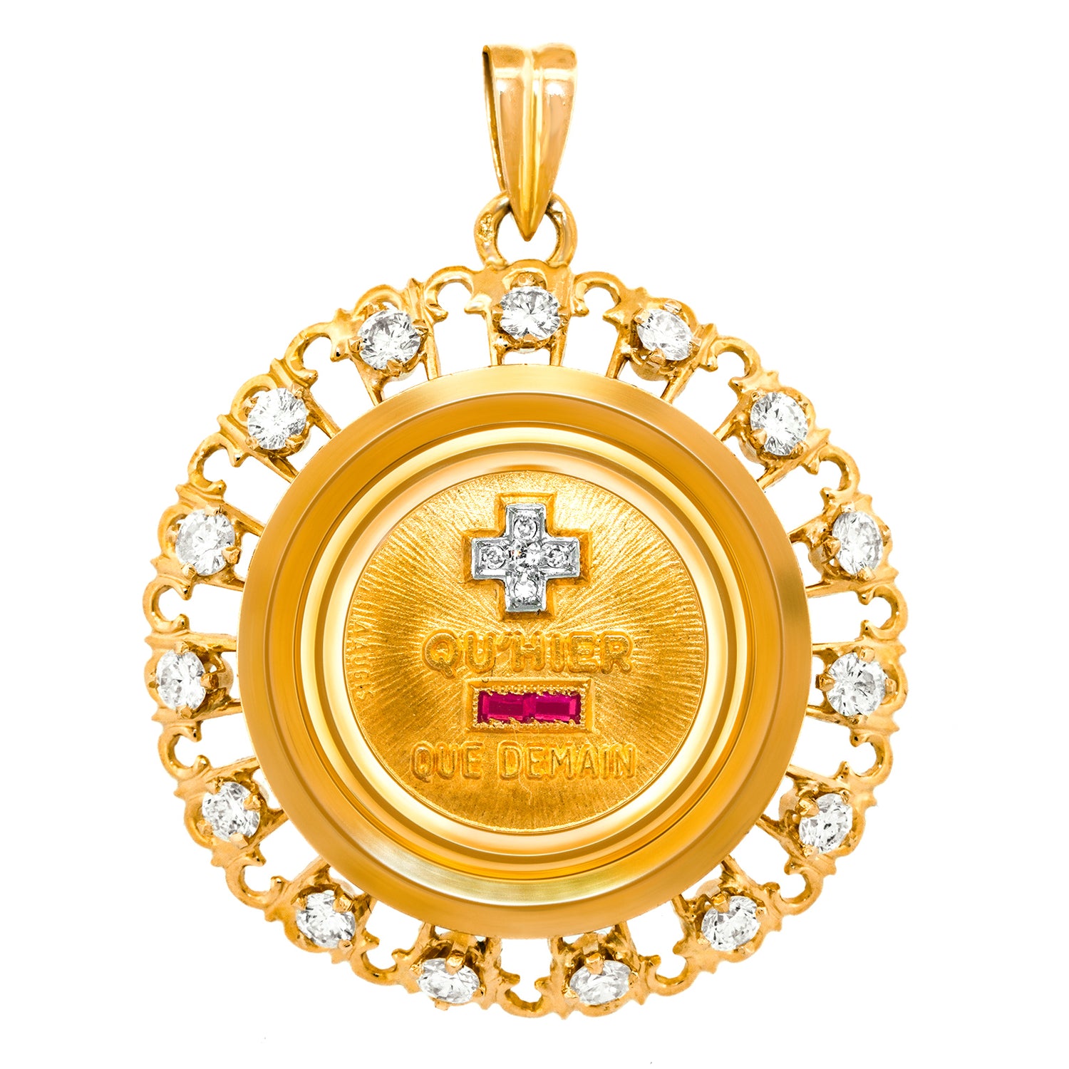 Circa 1950s, 18k, France. This chic fifties pendant with its romantic "I love you more than yesterday… less than tomorrow" message is beautifully detailed and completed by brilliant white diamonds (1.30cttw H, VS). The sentiment is all about love and commitment, timeless concepts, relevant always. Oh yes, and it's cool, hip, and actually French, …perfect with your favorite talismans all worn together. Excellent condition.