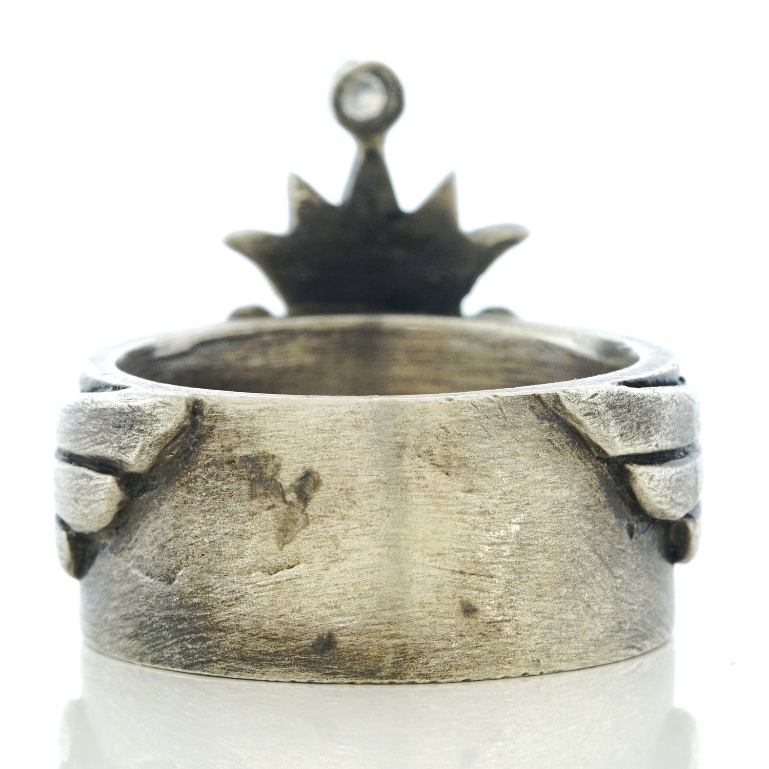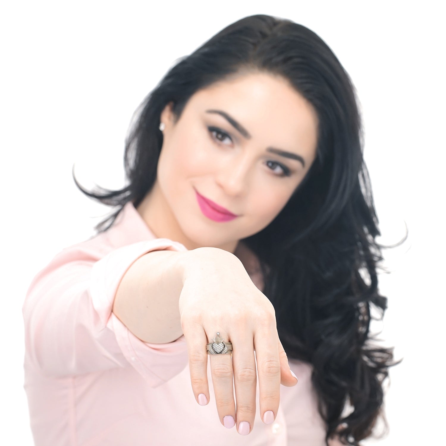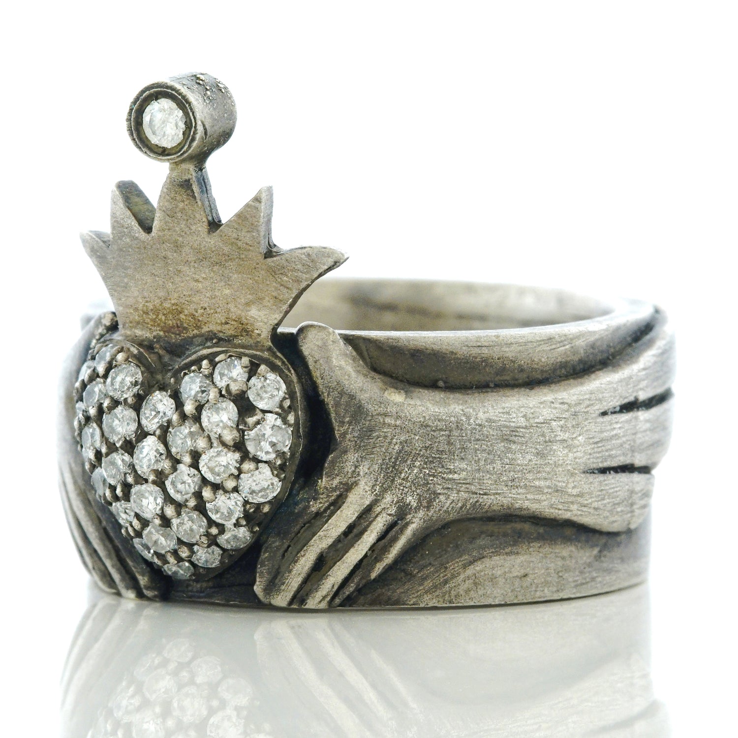 Circa  2000s, Sterling, by Irit Design, Malibu, CA.    Malibu beach rocker chic is the look that Irit Ehrlich, jewelry designer to the stars, delivers every time. This ring features a diamond-set heart, hands, and crown in her signature textured and toned silver. Often found on the red carpet, Irit designs are also flawless for everyday glamour.  This older design is a desirable earlier example of her work. Excellent condition.