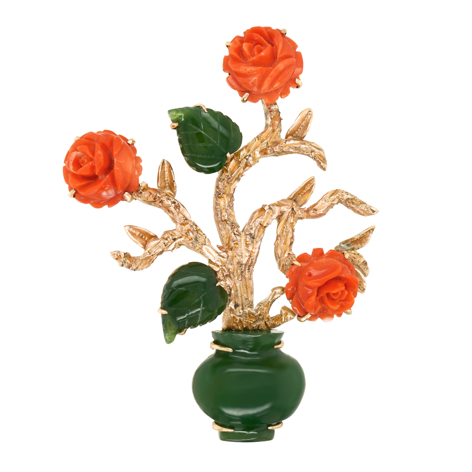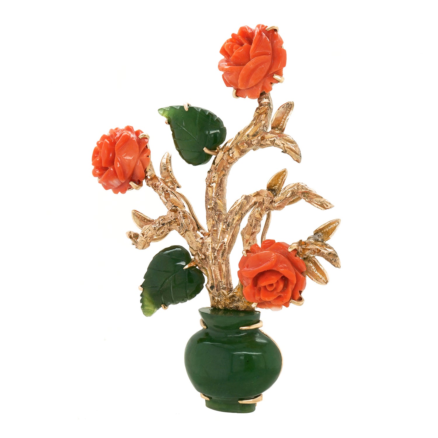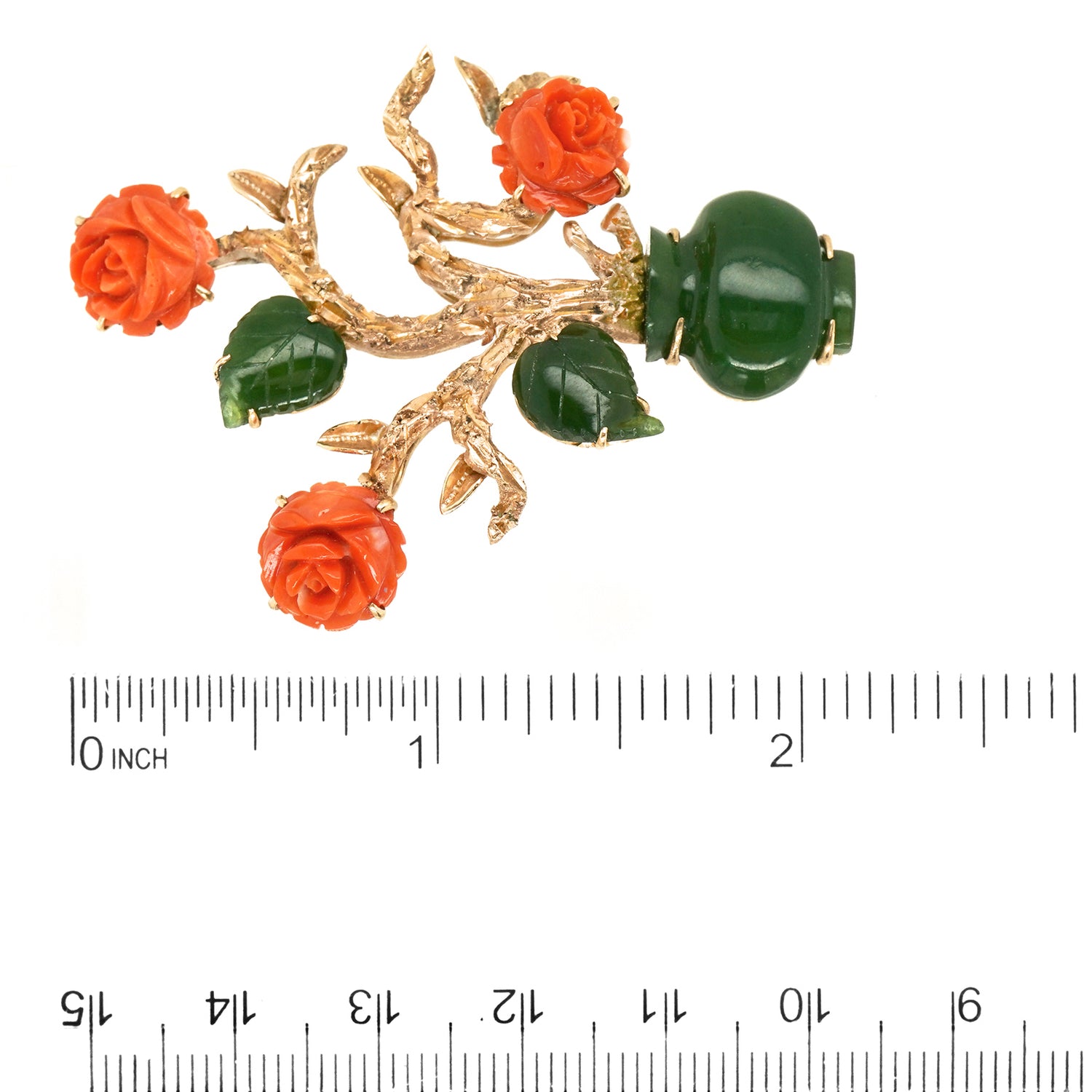 Circa 1950s, 14k, American.  This tastefully balanced brooch features a gold and jade vase that compliments the carved coral, jade, and textured gold branch of roses and leaves. Fifties fashion has a fresh playful energy that works well with today's style. Pin it to a crisp white blouse, your favorite casual dress or jacket,or your favorite gentleman's lapel.   Excellent condition.