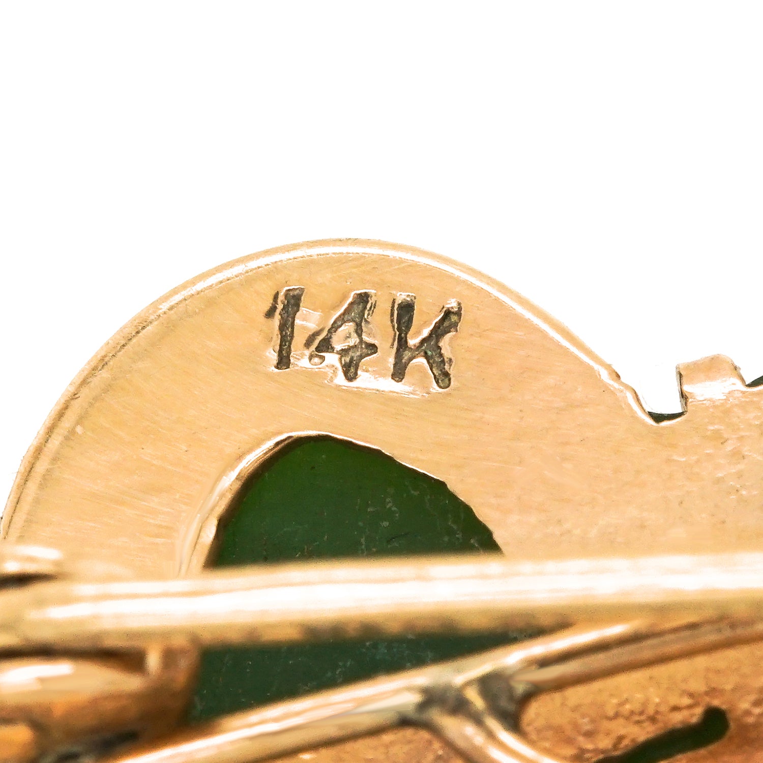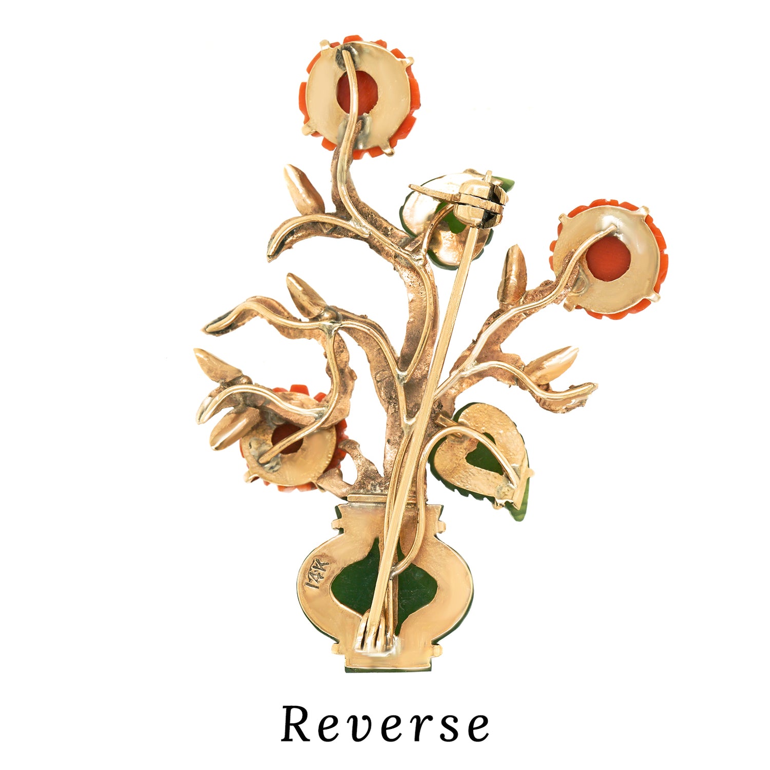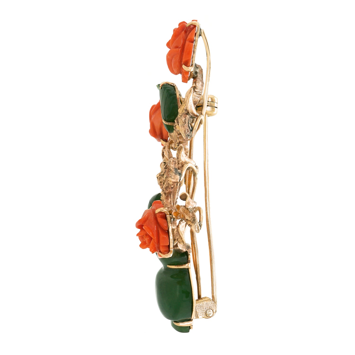 Circa 1950s, 14k, American.  This tastefully balanced brooch features a gold and jade vase that compliments the carved coral, jade, and textured gold branch of roses and leaves. Fifties fashion has a fresh playful energy that works well with today's style. Pin it to a crisp white blouse, your favorite casual dress or jacket,or your favorite gentleman's lapel.   Excellent condition.