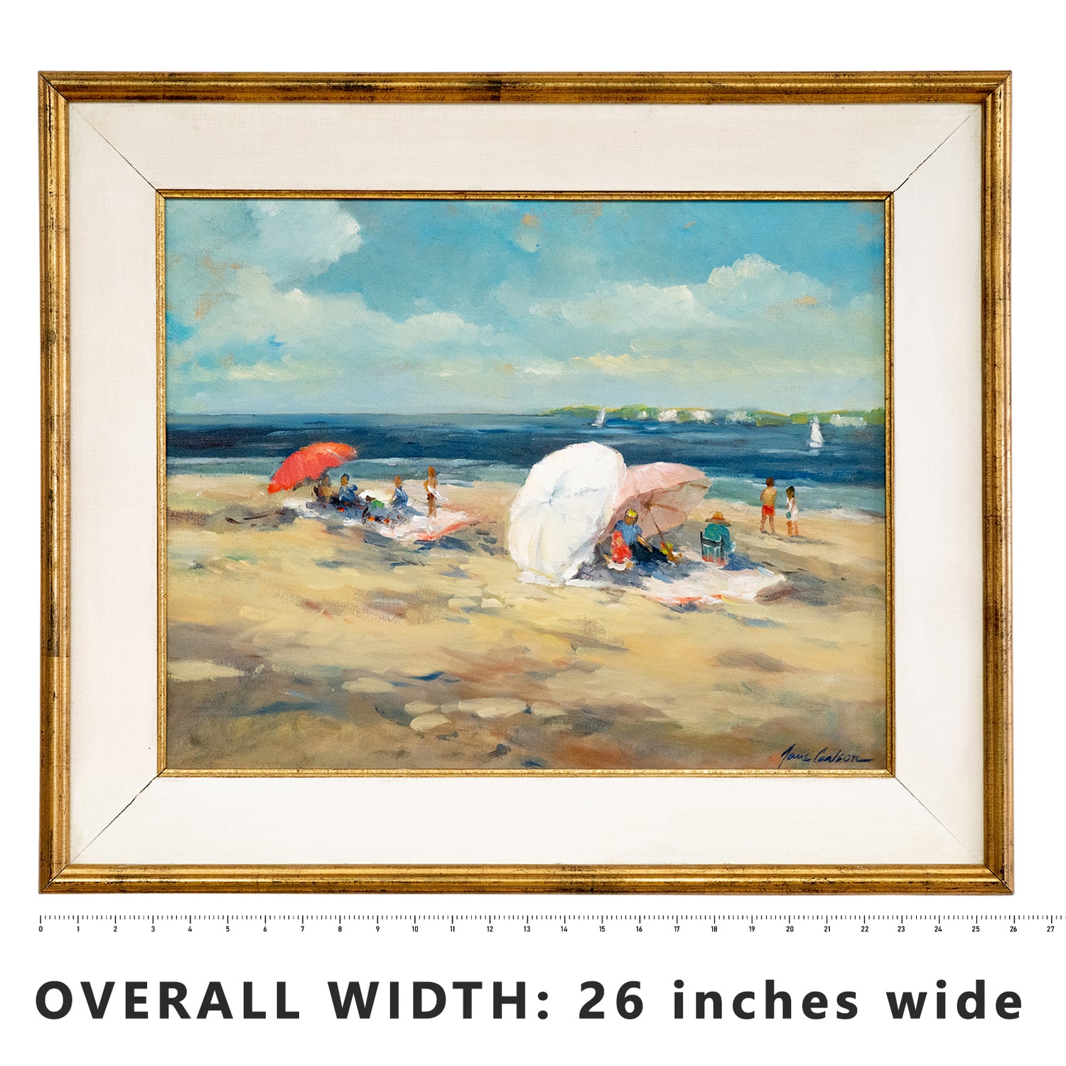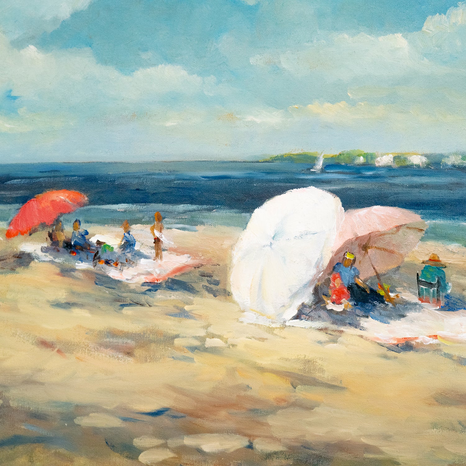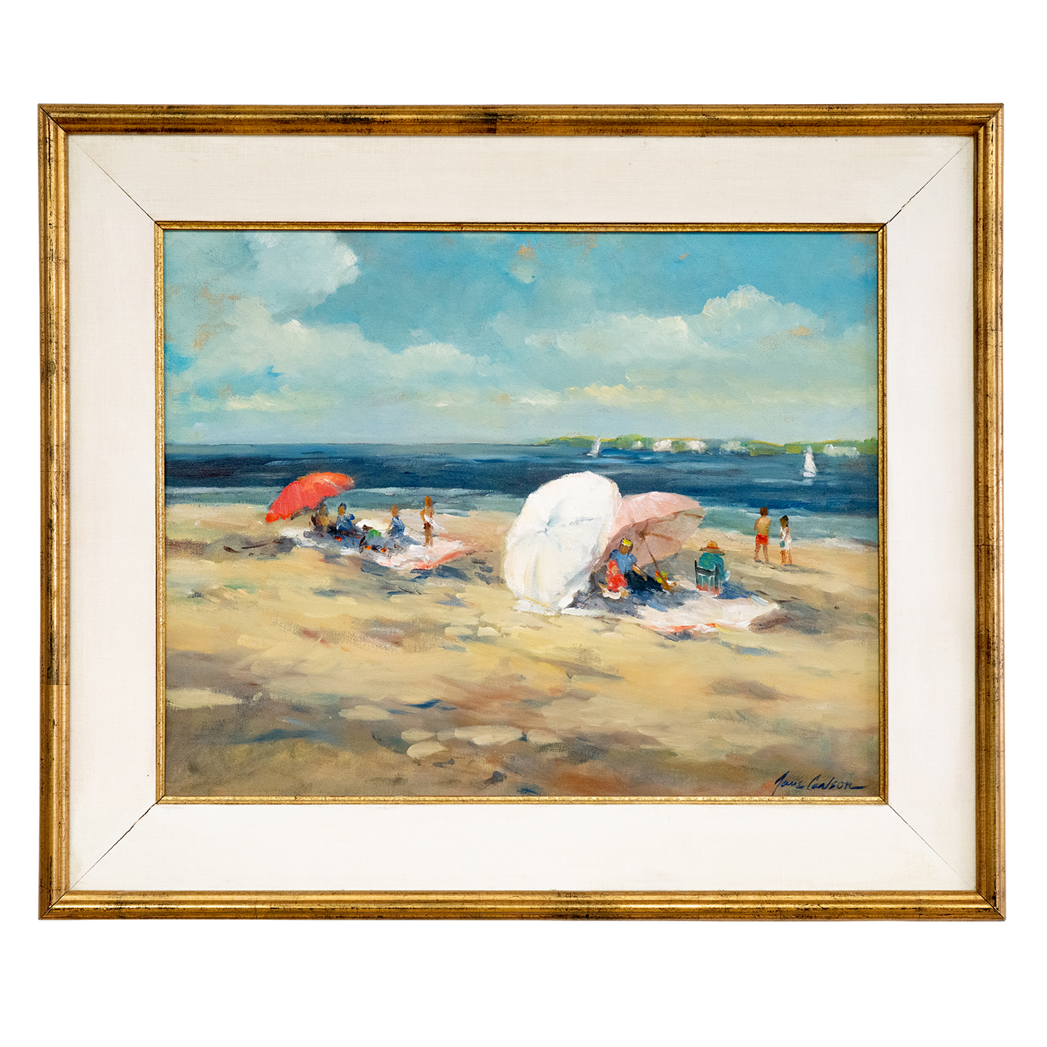 Circa 1960s, Oil on Canvas by Jane Carlson, American. Known for her impressionist style and delicate bright hues, Jane Carlson came from a long line of artists. This atmospheric painting of bathers and umbrellas on the beach is a superb example of her work. Also known for her long career as a Ford modeling agency model, she brings a unique voice to art, a perspective on life and beauty from both sides of the lens or easel. Signed lower right.