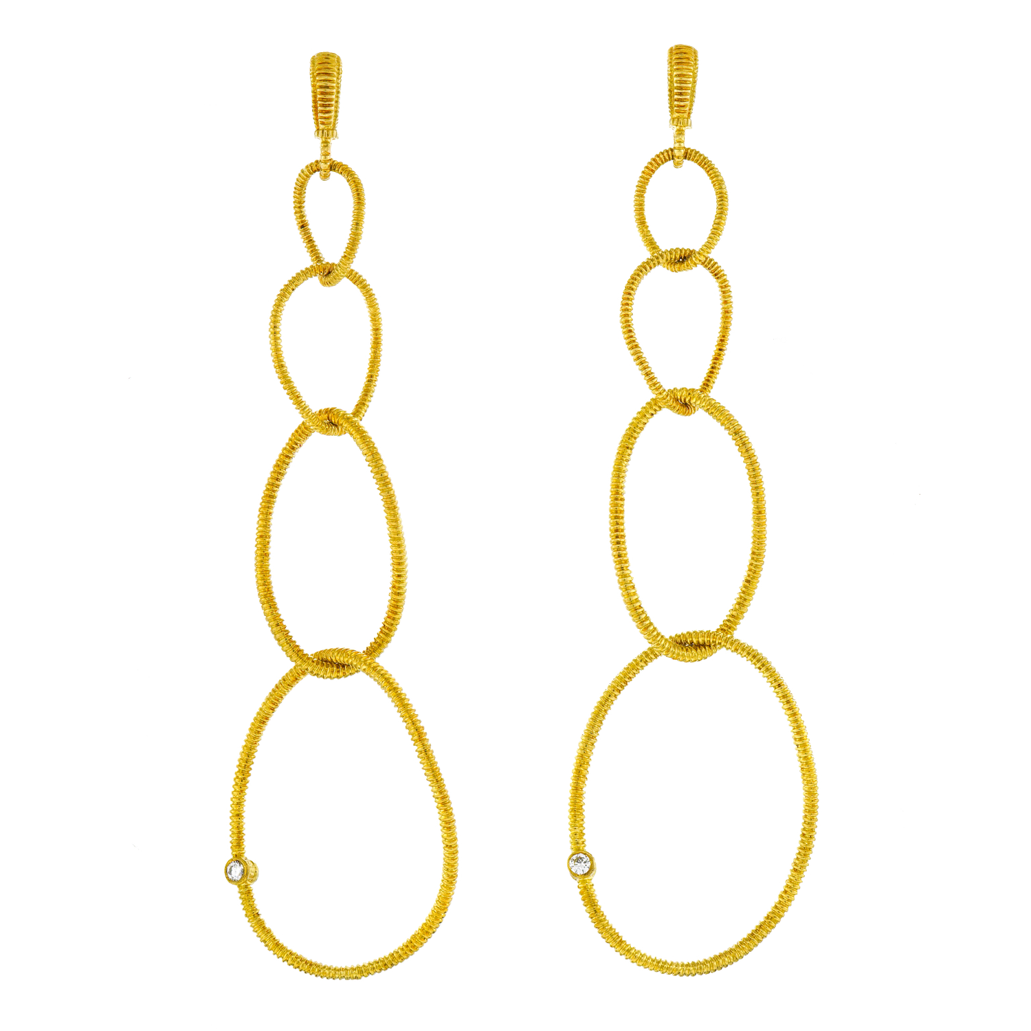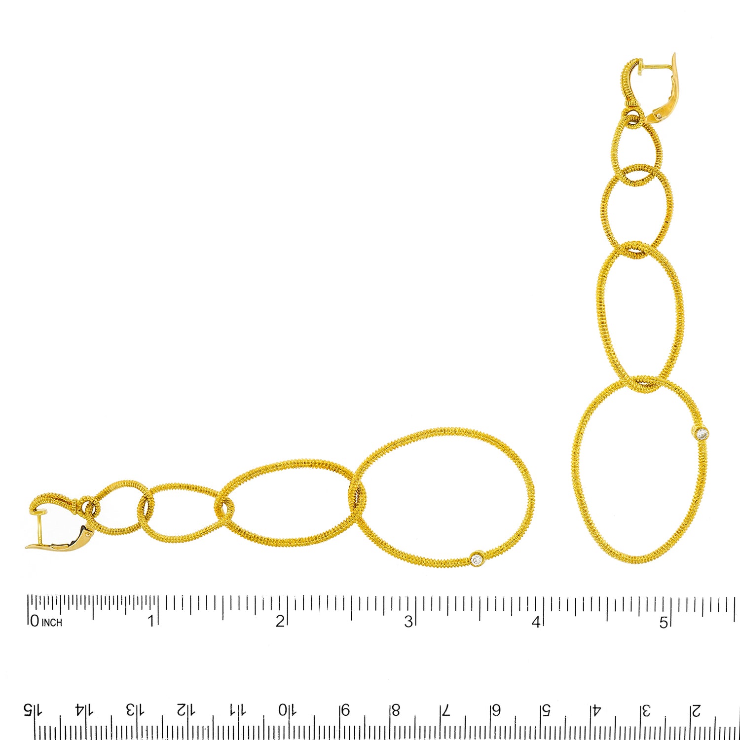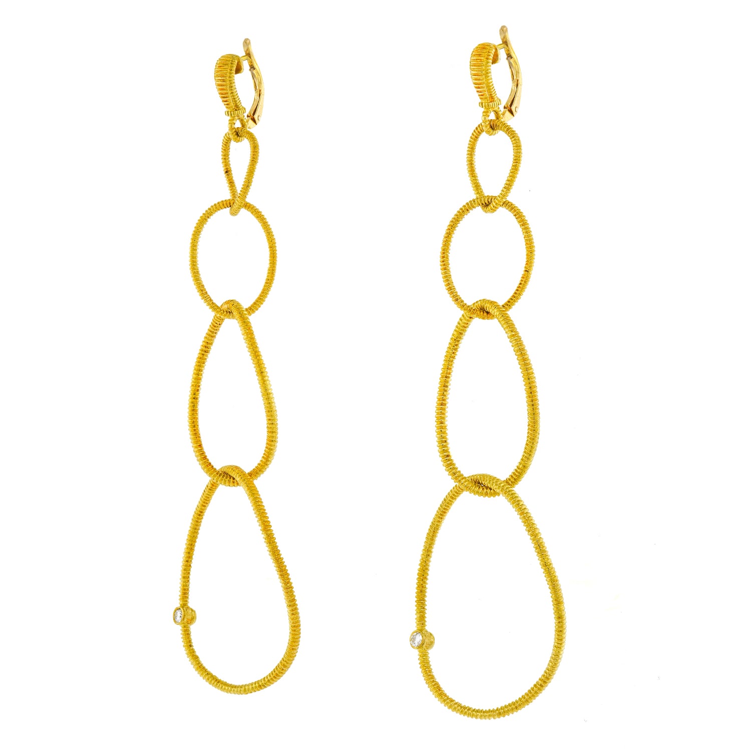 Circa 2000s, 18k, by Judith Ripka, American.  These oh-so-chic earrings are flights of fashion! Balanced and comfortable and at four exciting inches long, these earrings in textured eighteen-karat yellow gold will be a fashion favorite. Superbly fabricated and meticulously detailed, look for back-to-back accent diamonds for sparkle!  Excellent condition.