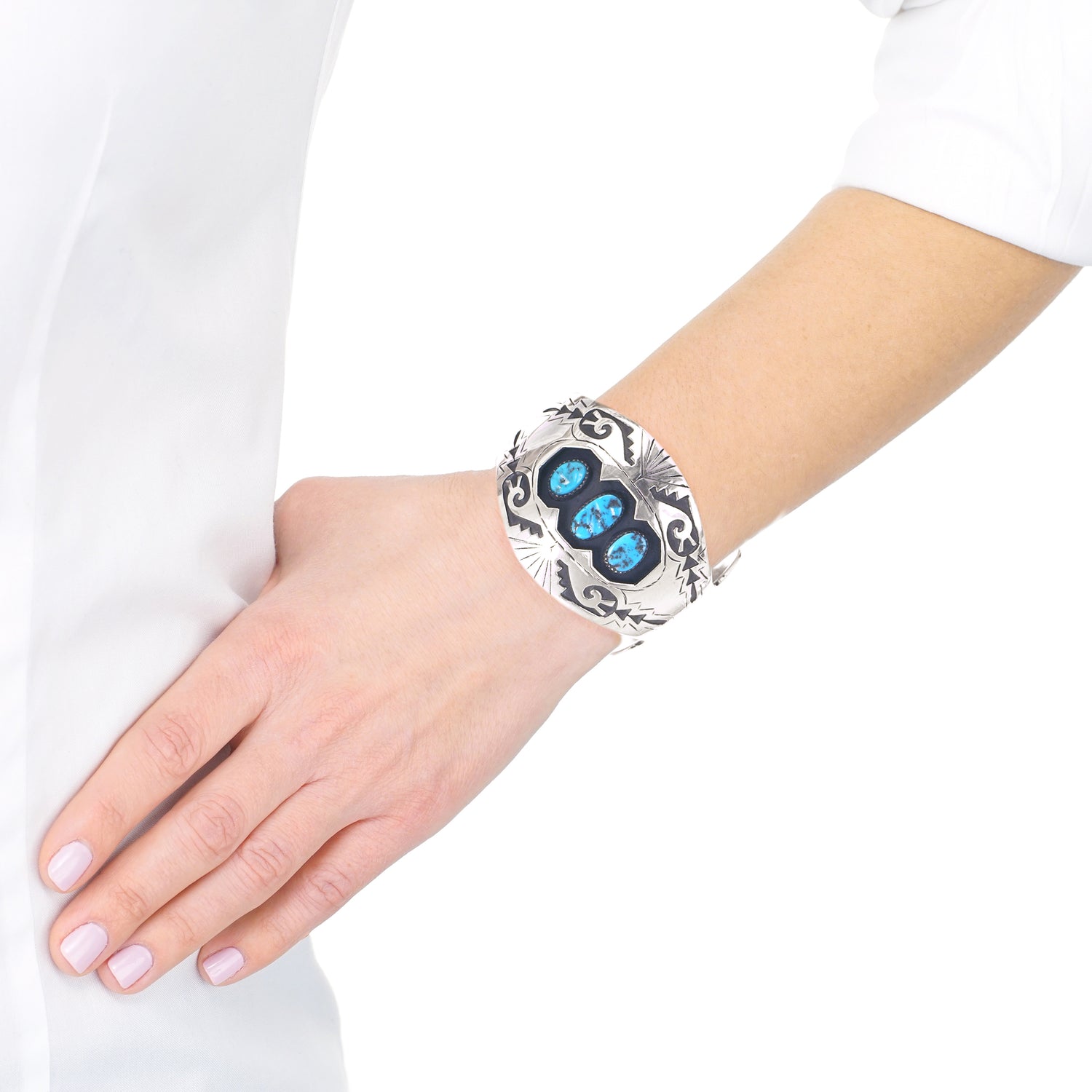 Circa 1970-80s, sterling, Kee Family, Navajo. This stylish bracelet has a sophisticated visual story of Concho stamps and vivid blue turquoise in an unusually shaped shadow box. The look is understated, spiritual, and harmonious. Finely fashioned, it is in excellent condition.