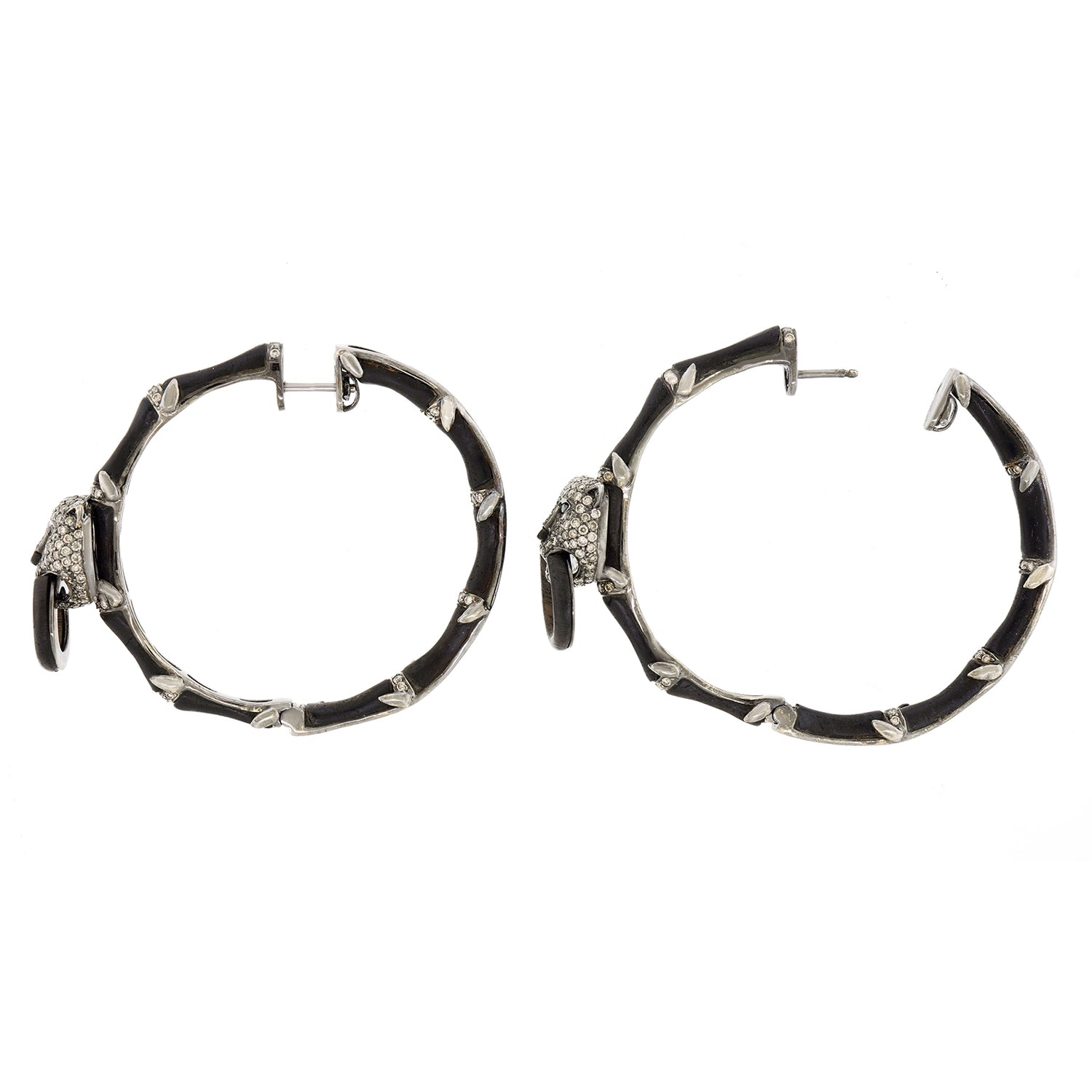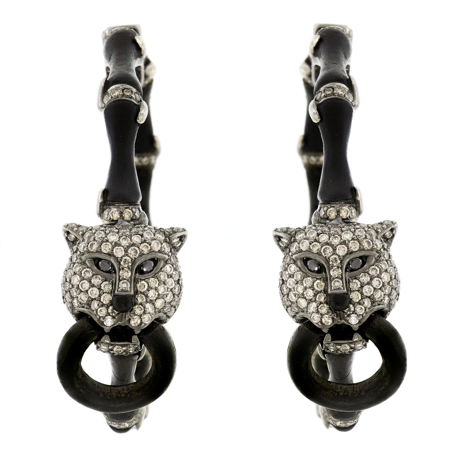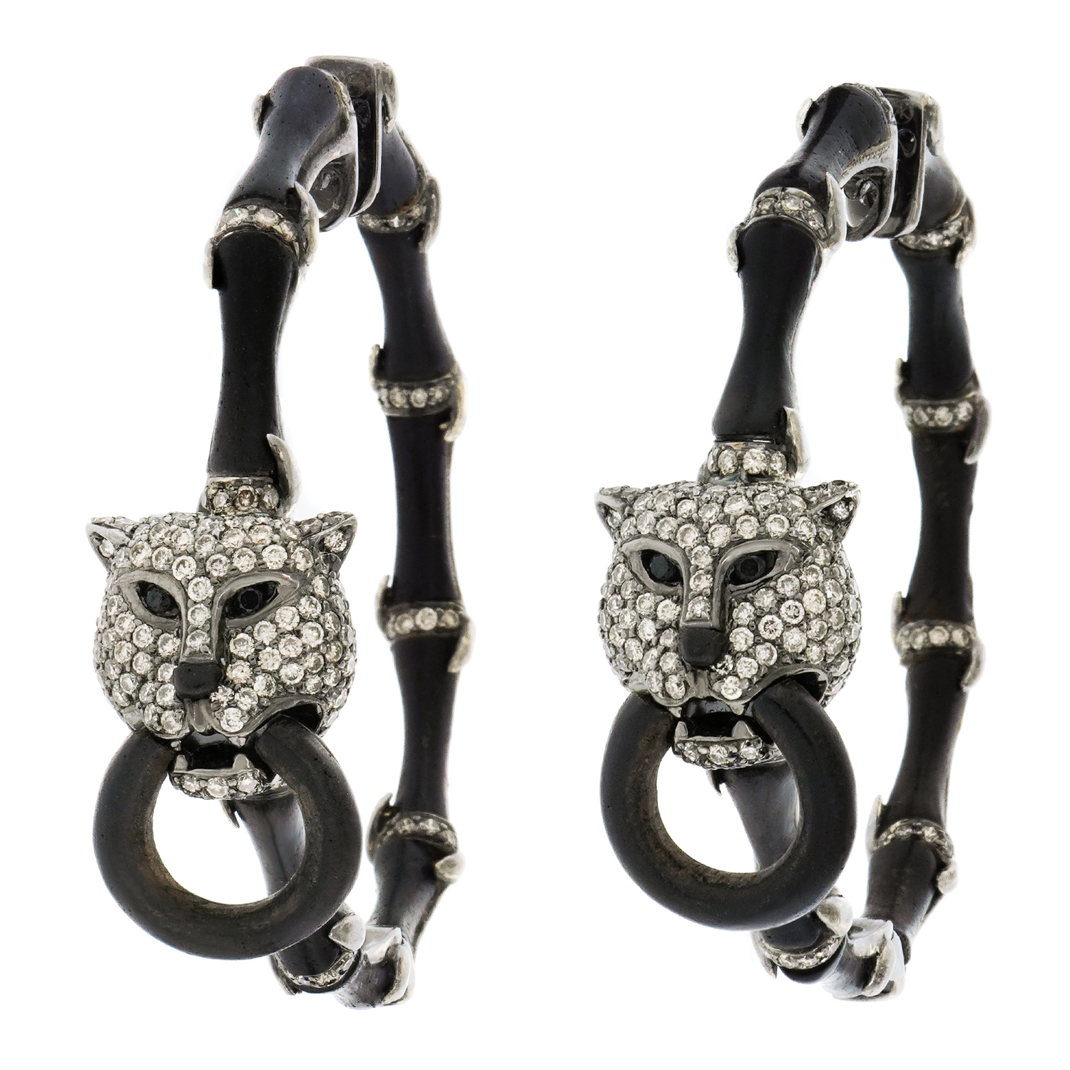 Circa 1990s, 18k, by A. Kurz, Zurich, Switzerland. These Panther-motif earrings are finely fashioned in blackened 18k gold and mounted with champagne diamonds and black ebony. The feline heads sit on Bamboo-themed hoops. The look is effortless cool for anywhere, anytime style. Kurz is known for quality fabrication, superb designs, and fine stones. Excellent condition.