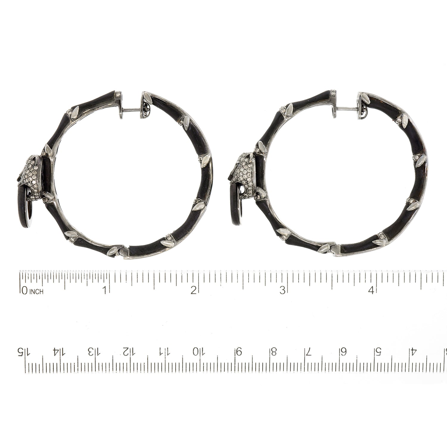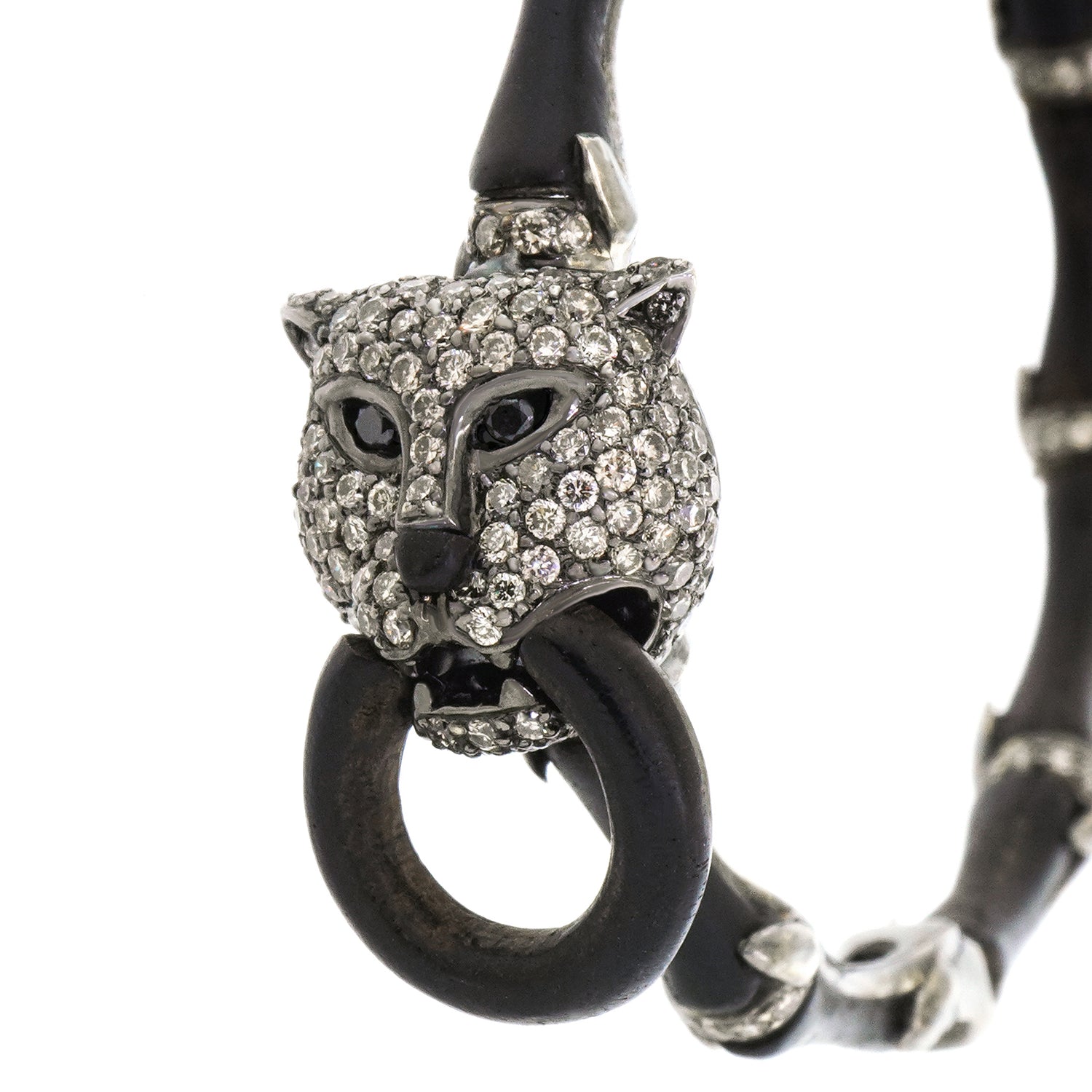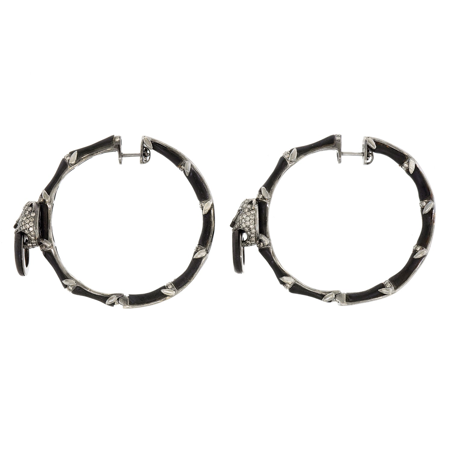 Circa 1990s, 18k, by A. Kurz, Zurich, Switzerland. These Panther-motif earrings are finely fashioned in blackened 18k gold and mounted with champagne diamonds and black ebony. The feline heads sit on Bamboo-themed hoops. The look is effortless cool for anywhere, anytime style. Kurz is known for quality fabrication, superb designs, and fine stones. Excellent condition.
