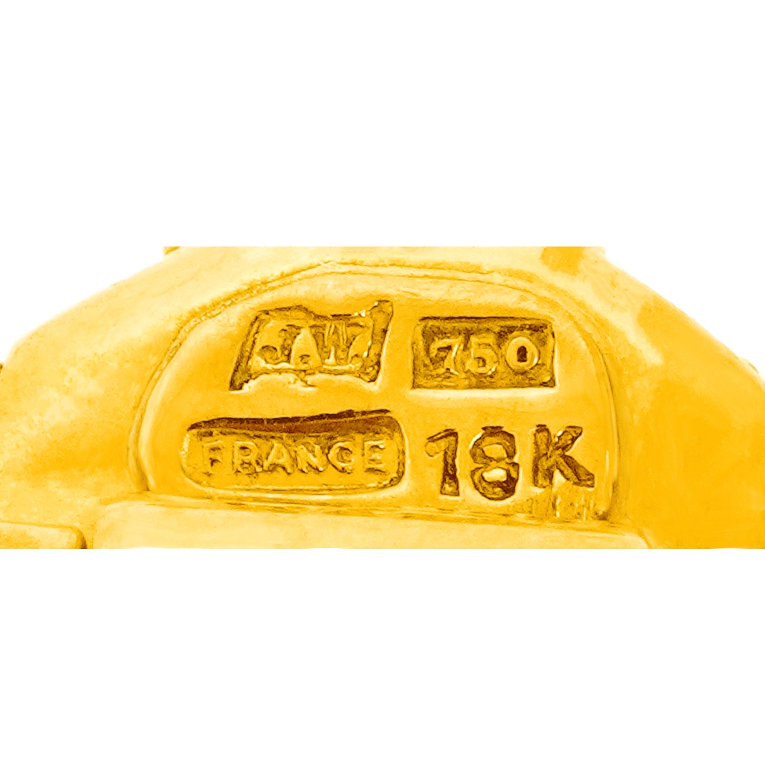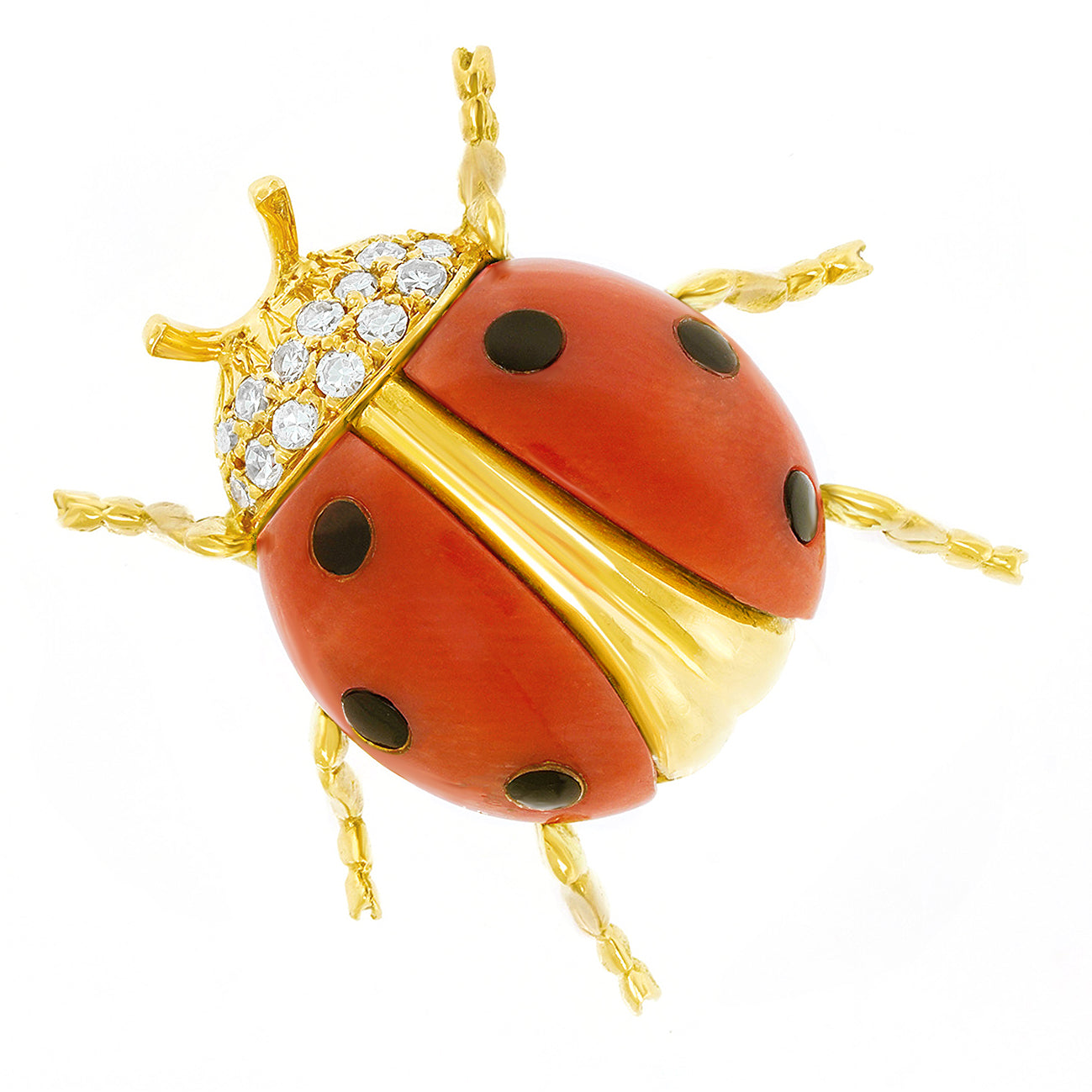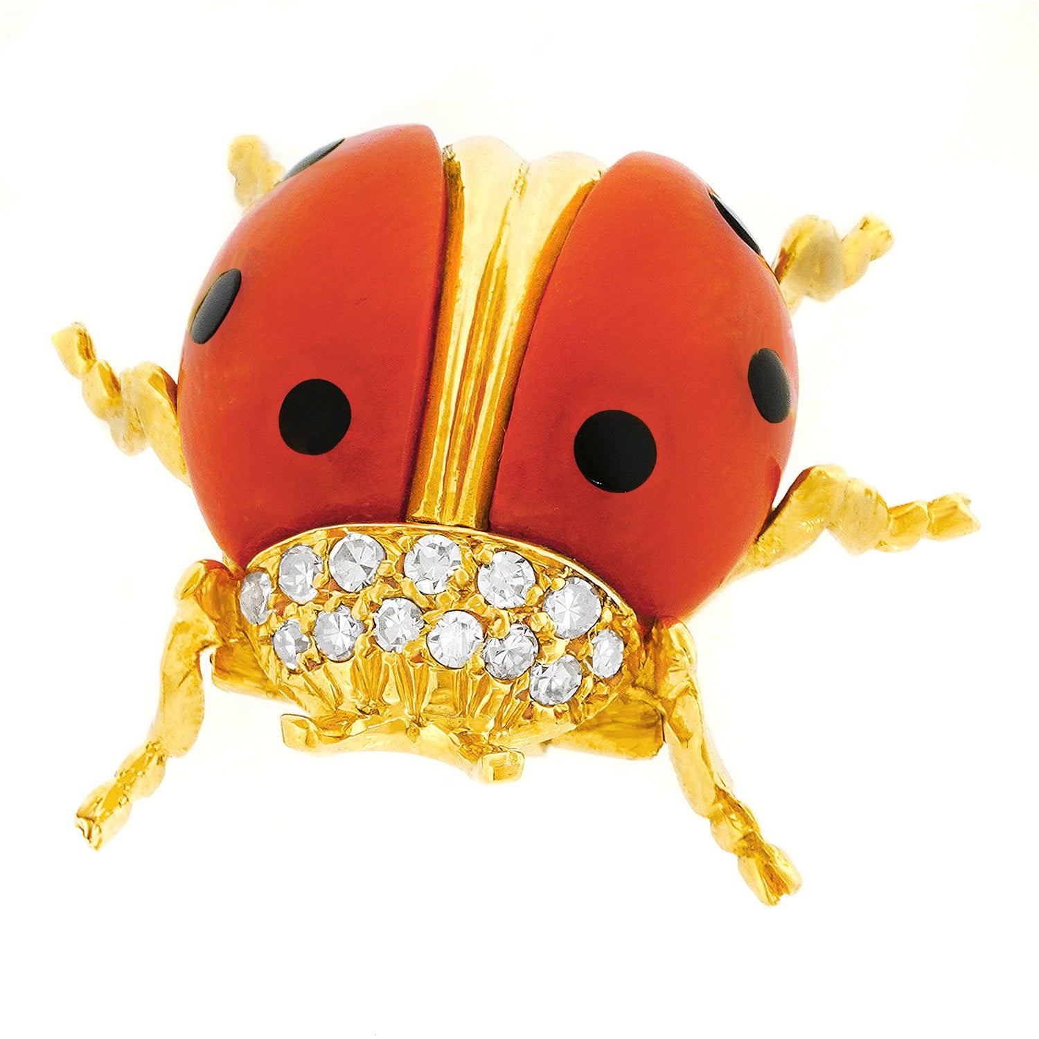 Circa 1950s, 18k, France. This whimsical ladybug pin is meticulously detailed. Polished yellow gold, black coral, red coral, and diamonds come together, making this brooch utterly irresistible. French jewels are renowned for fine quality. The care and attention that went into this diminutive pin is considerable. Excellent condition.