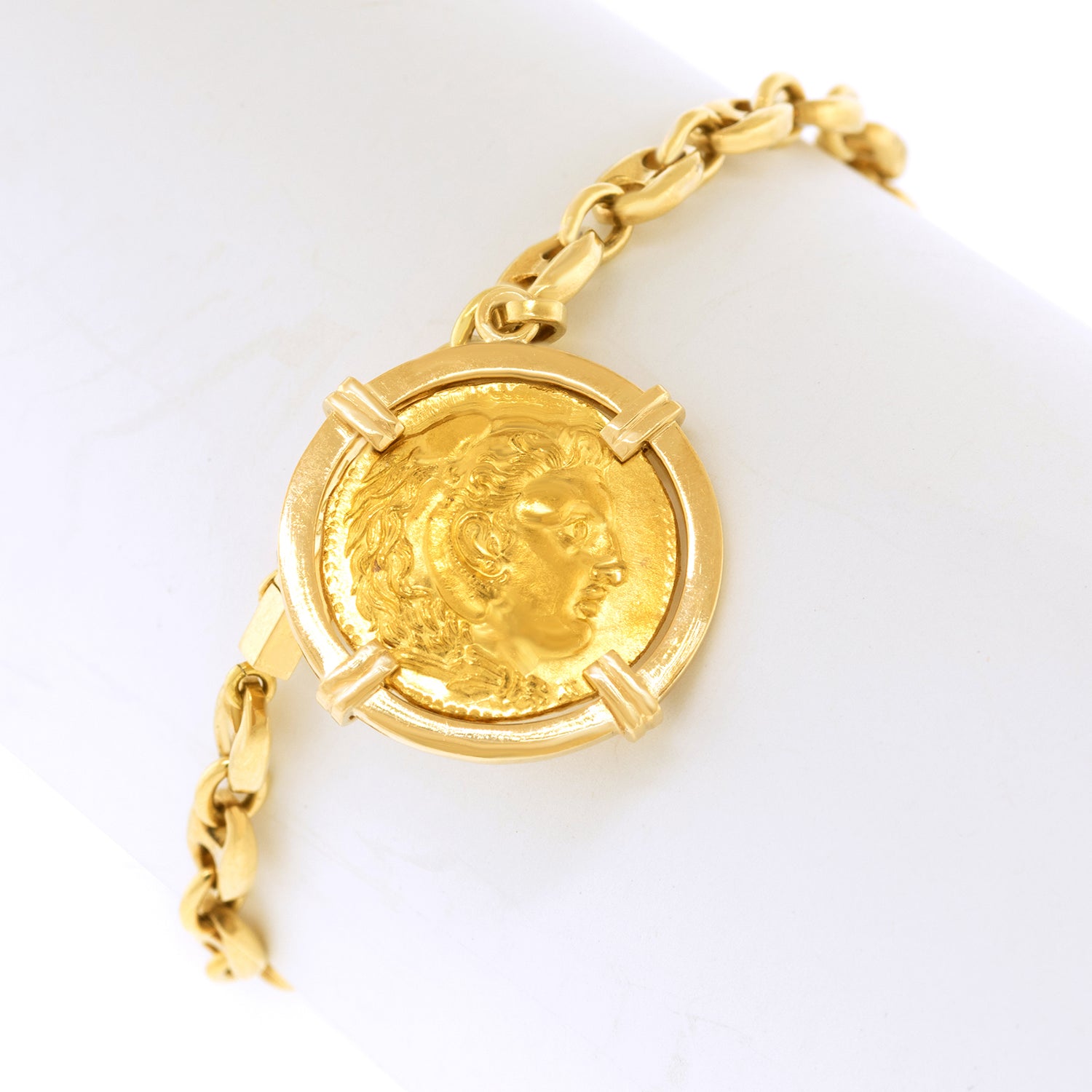 Circa 1970s, 18k/22k, by Ilias Lalaounis, Greece. This fabulous 18k yellow gold anchor link bracelet by Ilias Lalaounis features an ancient coin motif depicting Alexander the Great. The look is ancient, mythic, classic and delightfully fashion now! Excellent condition.