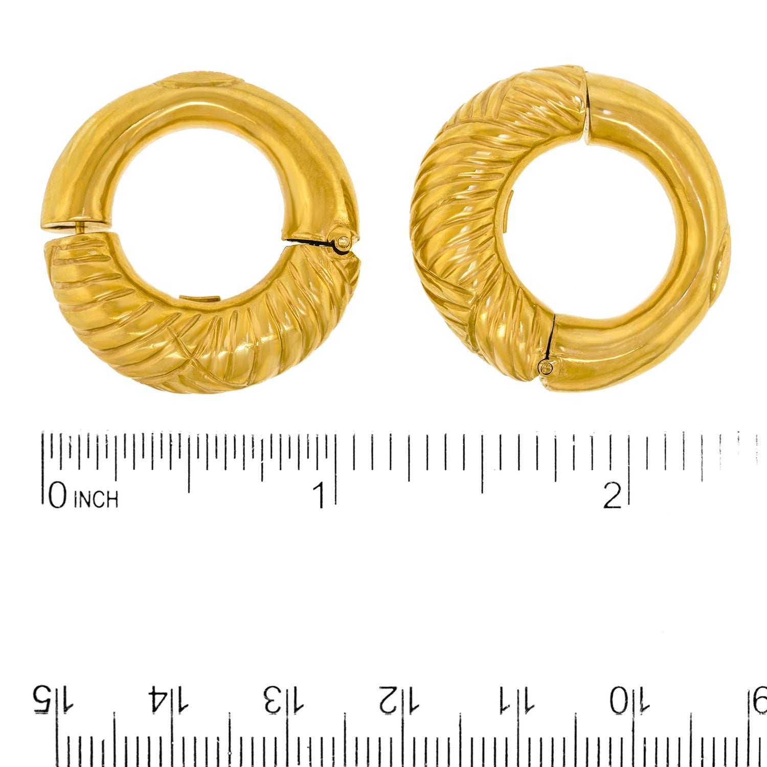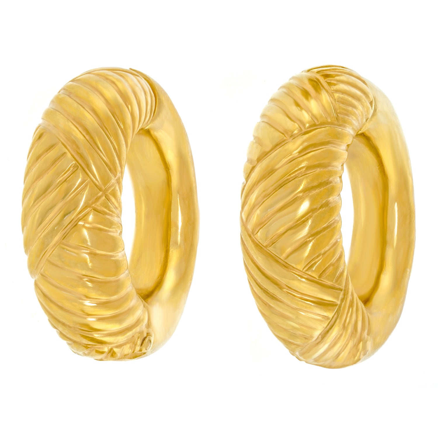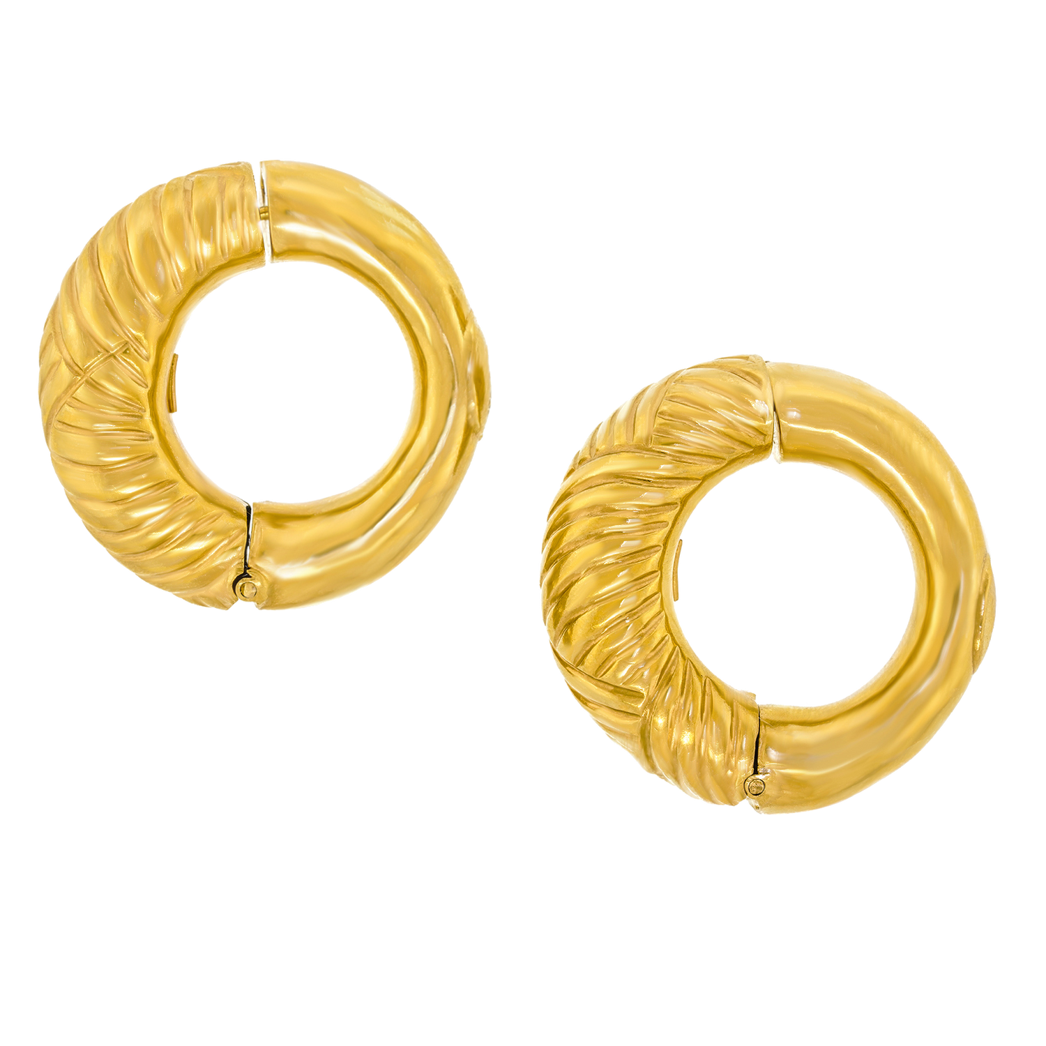 Circa 1960-70s, 18k, by Lalaounis, Greece. The motif of these stylish gold hoops by Lalaounis suggests classic Mycenaean motifs for a look that is as chic as it is timeless. Ilias Lalaounis' vision to create jewelry based on classical, archaic, and ethnic themes resulted in a body of work of unparalleled beauty. Meticulously handcrafted, these earrings are in good condition. Unusual for this style, these are for pierced ears only.