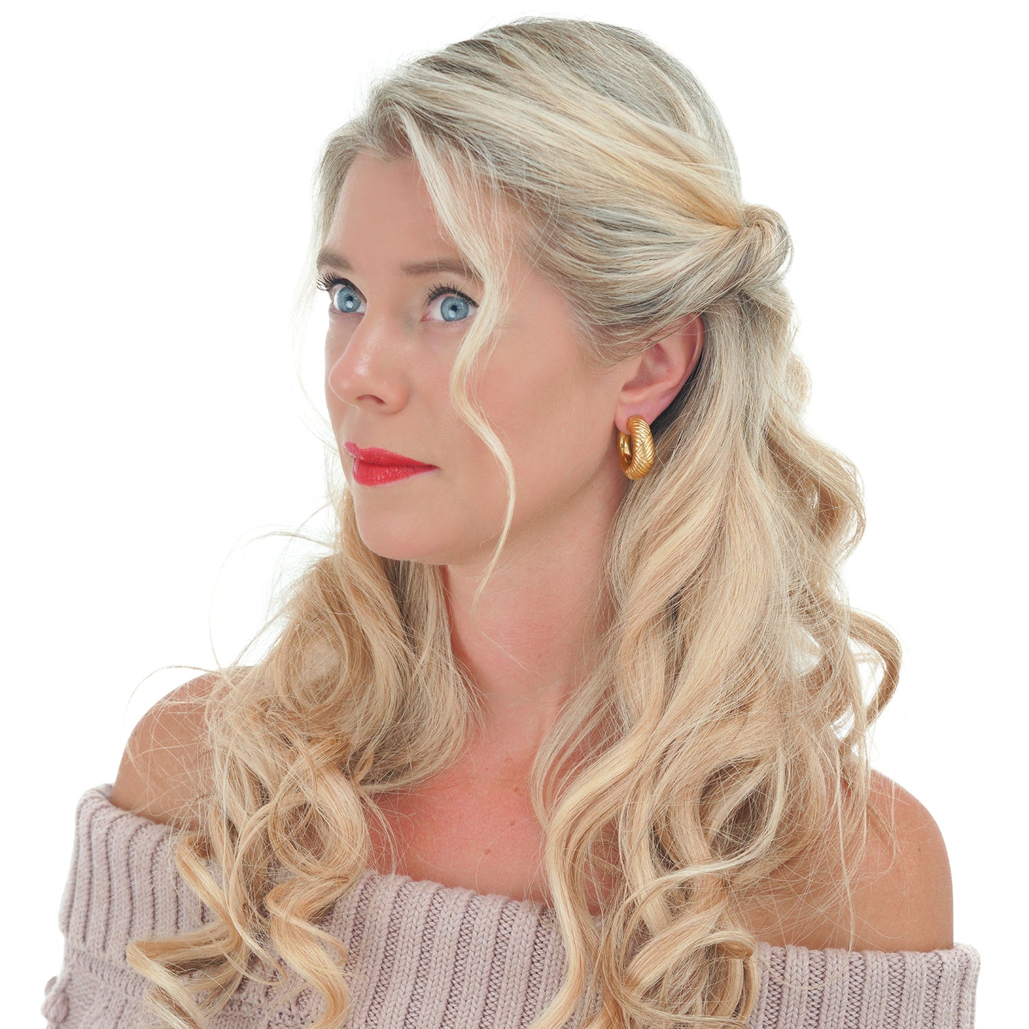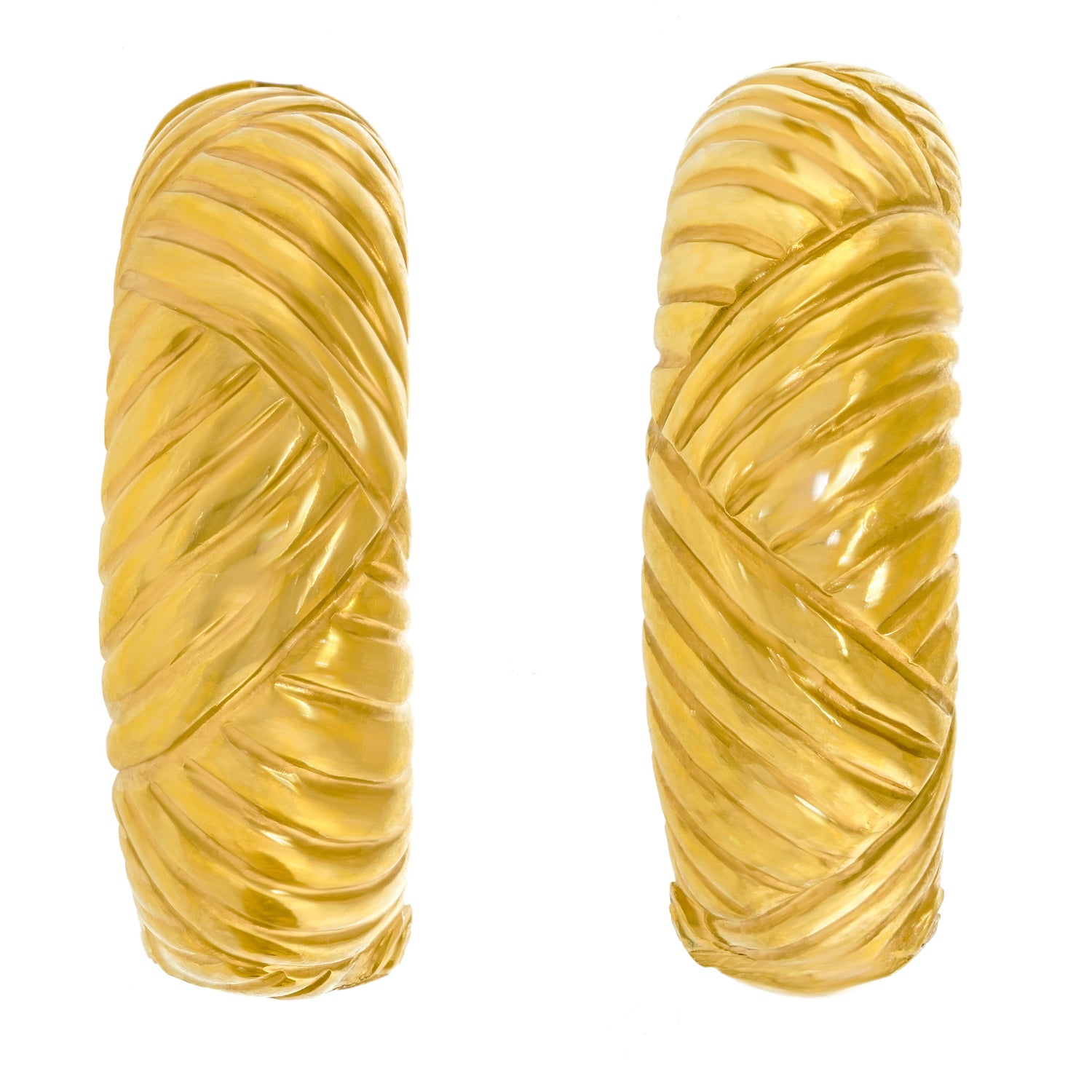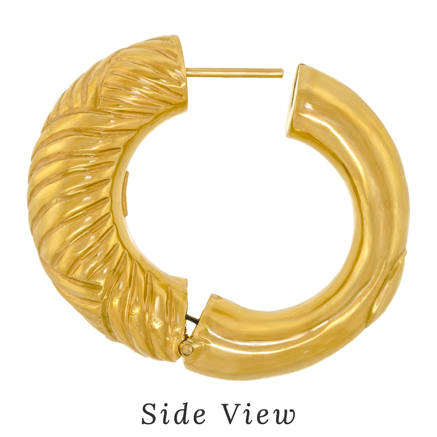 Circa 1960-70s, 18k, by Lalaounis, Greece. The motif of these stylish gold hoops by Lalaounis suggests classic Mycenaean motifs for a look that is as chic as it is timeless. Ilias Lalaounis' vision to create jewelry based on classical, archaic, and ethnic themes resulted in a body of work of unparalleled beauty. Meticulously handcrafted, these earrings are in good condition. Unusual for this style, these are for pierced ears only.