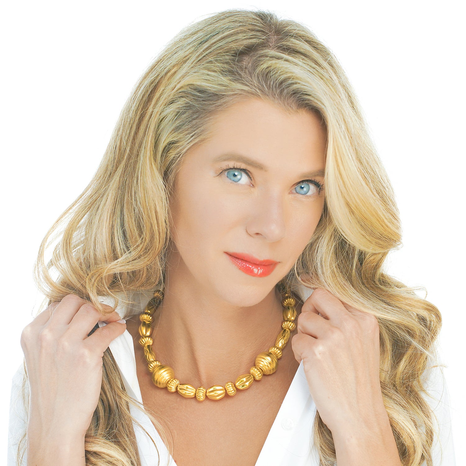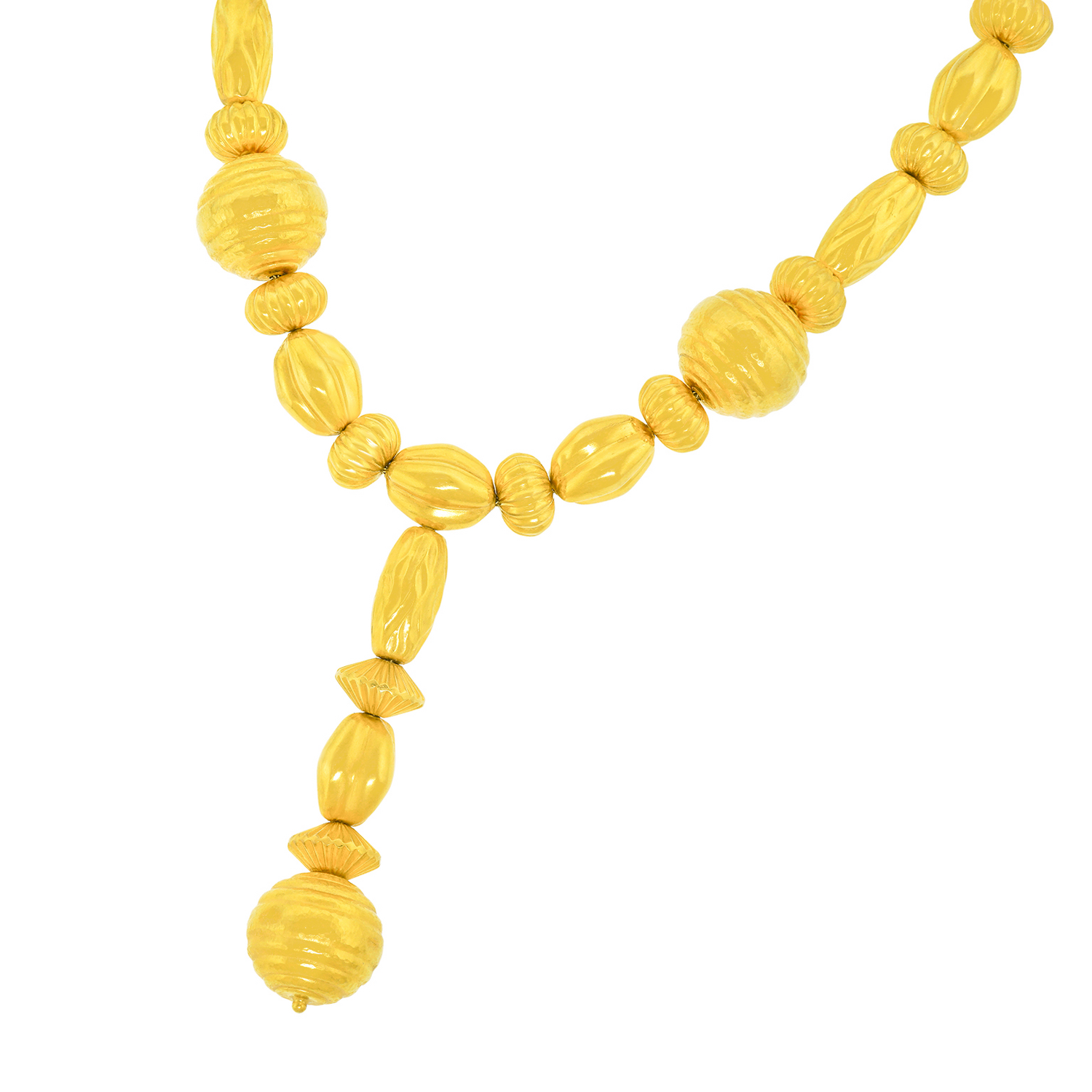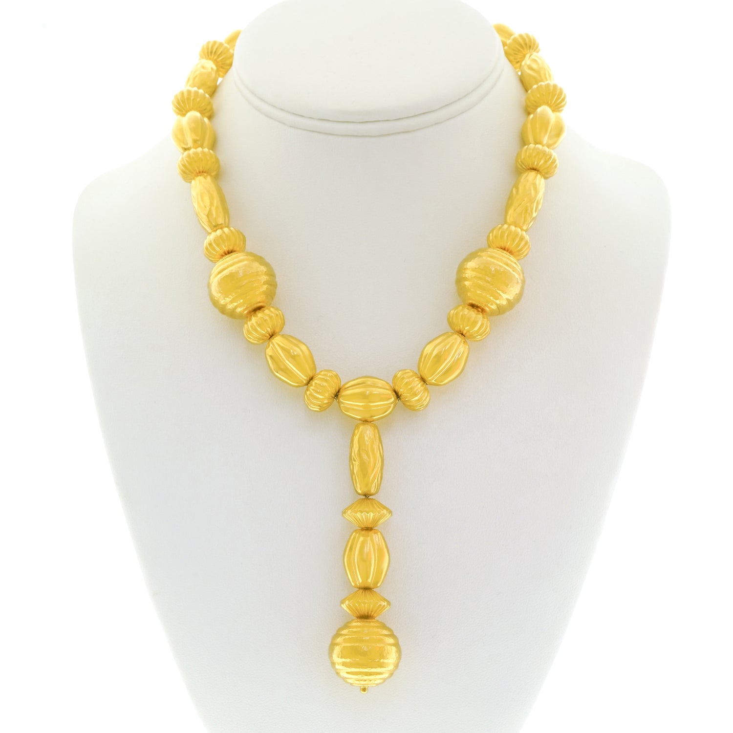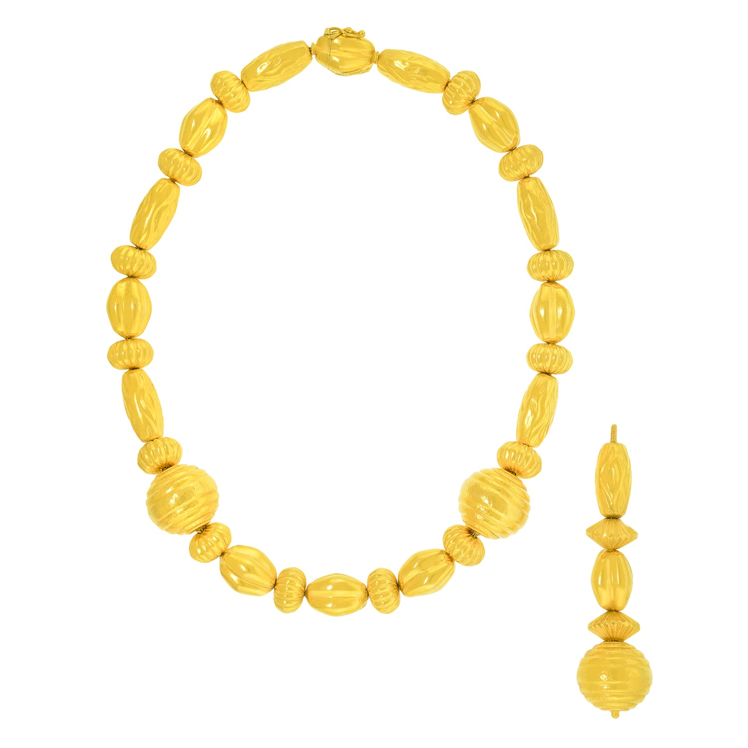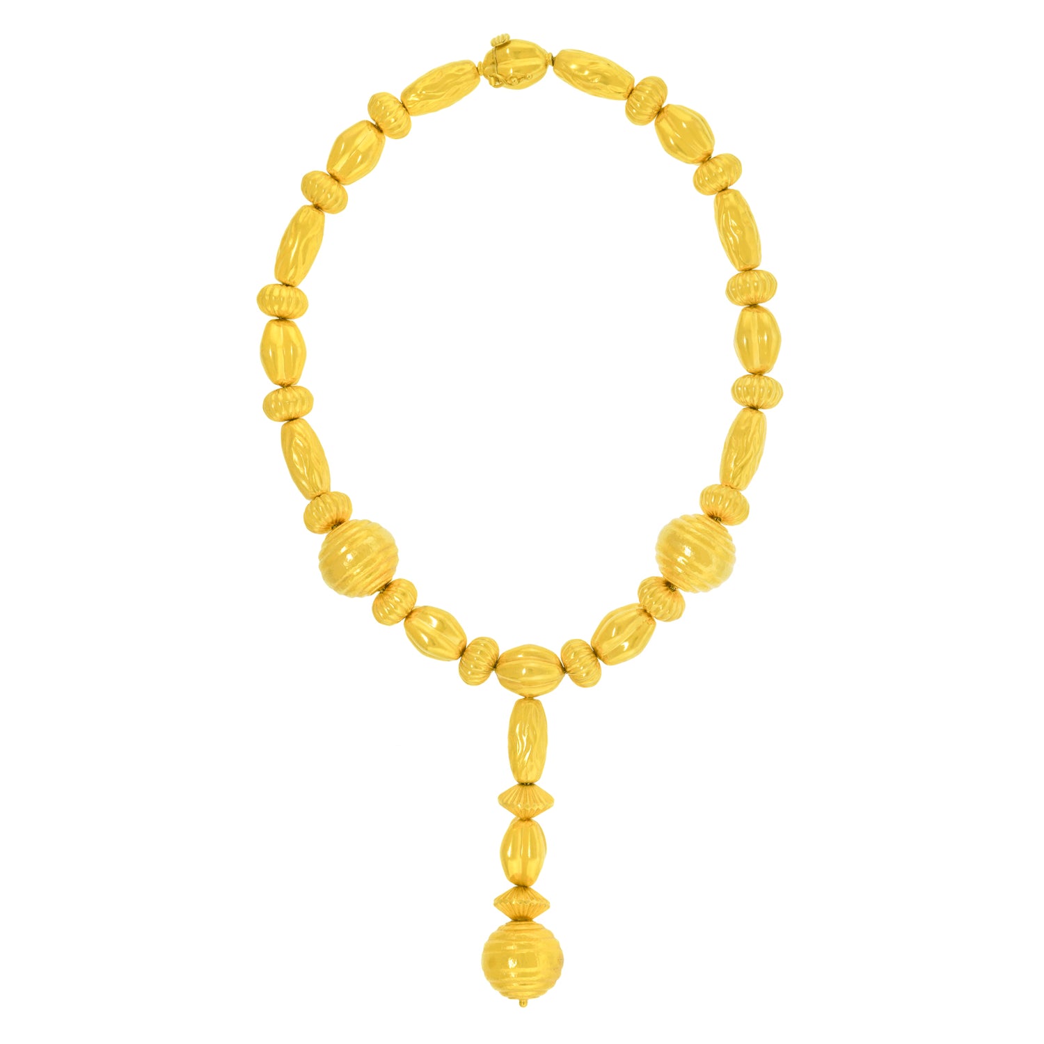 Circa 1970s, 18k, by Ilias Lalaounis, Greece. This boldly stylish gold necklace by Lalaounis revives classic Mycenaean motifs for a look that is as chic as it is timeless. Ilias Lalaounis' vision to create jewelry based on classical, archaic, and ethnic themes resulted in a body of work of unparalleled beauty. As an added bonus, this necklace cleverly features a removable drop so it may be worn in two ways (please see model shots). Meticulously handcrafted, this necklace is in very good condition.